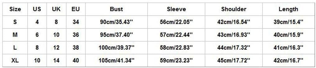 ★ [Size Chart ★★Size: S UK: 6 Bust: 90cm/35.43'' Sleeve: 56cm/22.05'' Shoulder: 42cm/16.54'' Length: 39cm/15.4'' ★Size: M UK: 8 Bust: 95cm/37.40'' Sleeve: 57cm/22.44'' Shoulder: 43cm/16.93'' Length: 40cm/15.9'' ★Size: L UK: 10 Bust: 100cm/39.37'' Sleeve: 58cm/22.83'' Shoulder: 44cm/17.32'' Length: 41cm/16.3'' ★Size: XL UK: 12 Bust: 105cm/41.34'' Sleeve: 59cm/23.23'' Shoulder: 45cm/17.72'' Length: 42cm/16.7'' ★ [About us]: ★ ★ Excellent quality, fast delivery, simple after-sales service "" We make every effort to provide our customers with satisfactory service. ★ Two delivery modes: One is expedited delivery: 3-7 DAYS. Another is the standard delivery: 2-3 WEEKS ★ If you have any questions, do not hesitate to send us an email at any time. We will answer you as soon as possible. If you do not receive our response within 25 hours, please check if your mailbox is spam. ★ We appreciate your positive comments. Please do not leave negative comments or claims from A to Z without asking for help. Our goal is to provide a high level of customer service. We will never make you lose in a reasonable range.
