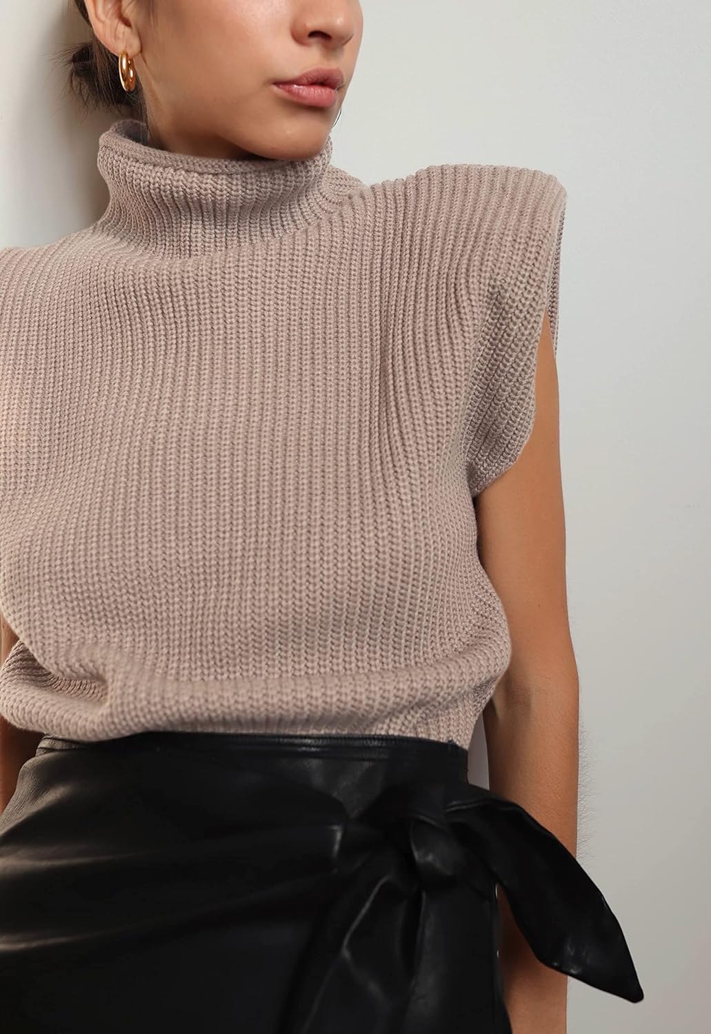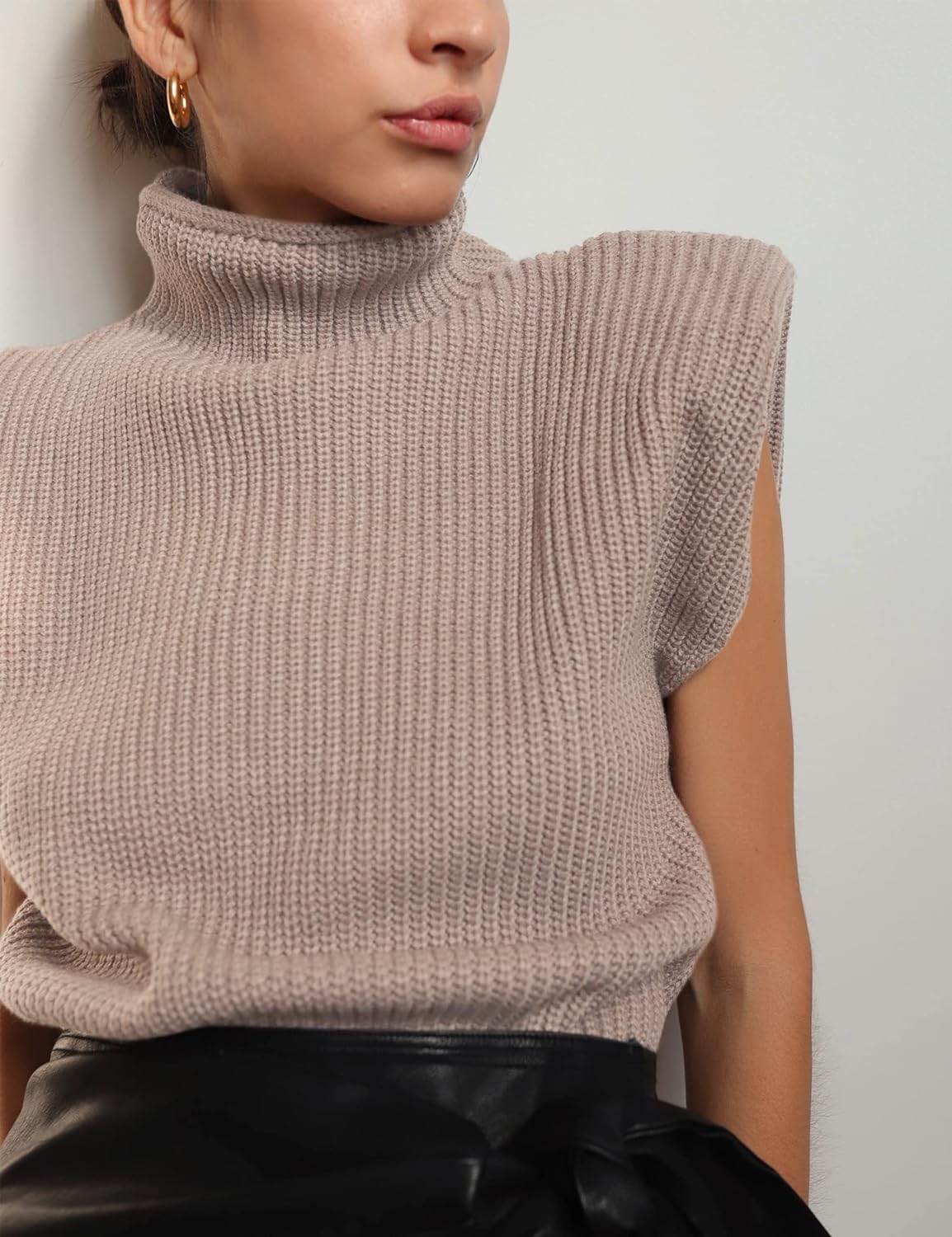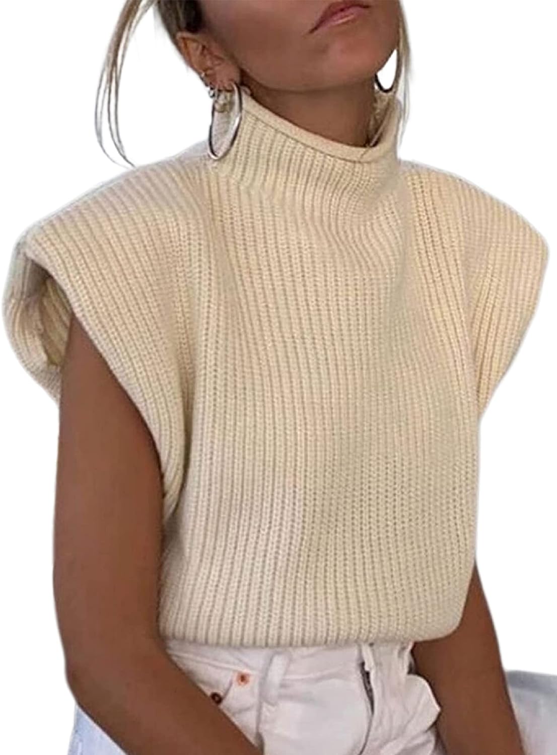 Huaqiao Women's High Neck Knit Sweater Vest Padded Shoulder Turtleneck Sweater Sleeveless Ribbed Pullover Tank Top