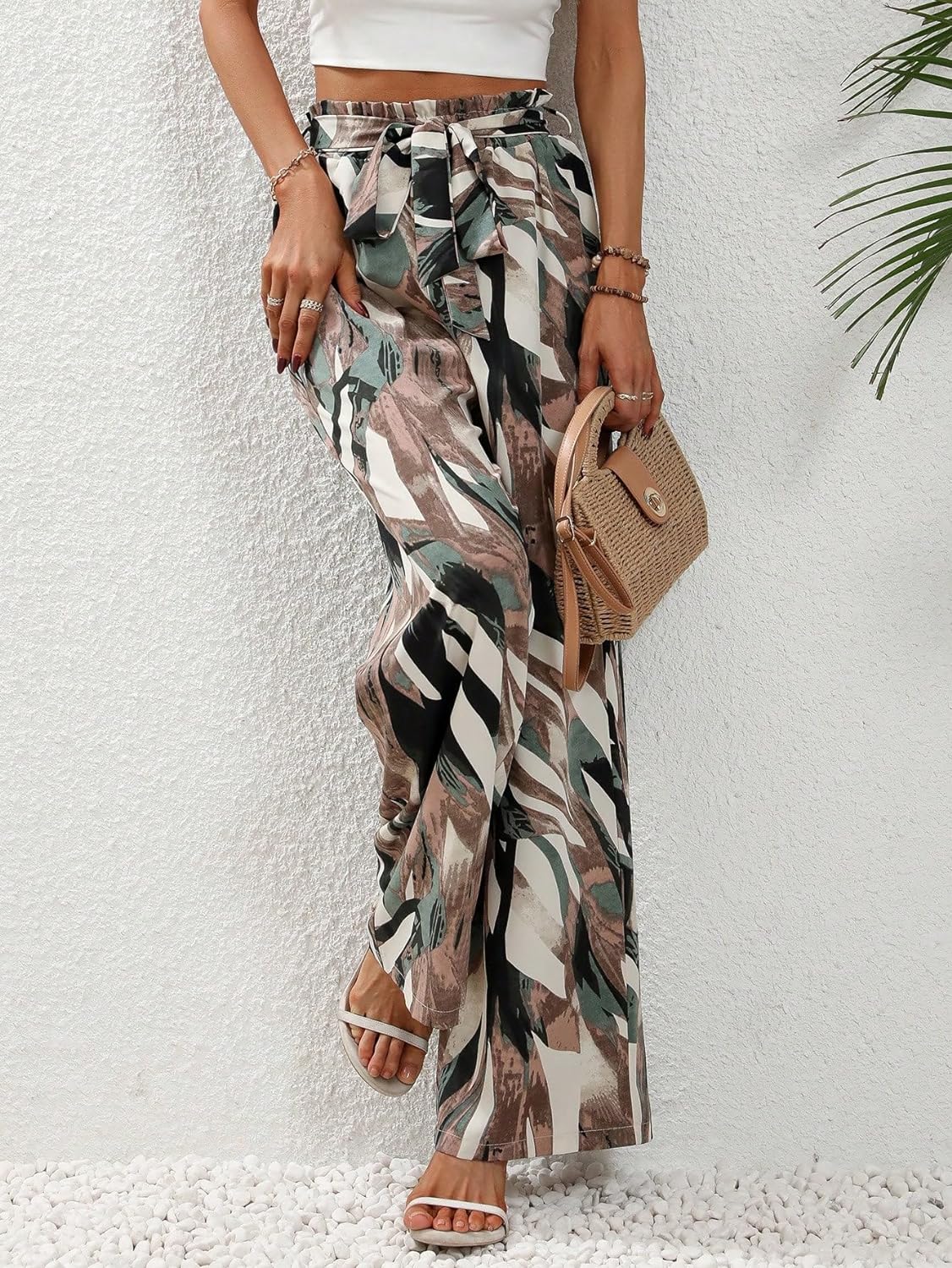 • Features: allover print, high waist, belted, elastic waist, loose , wide leg pants
