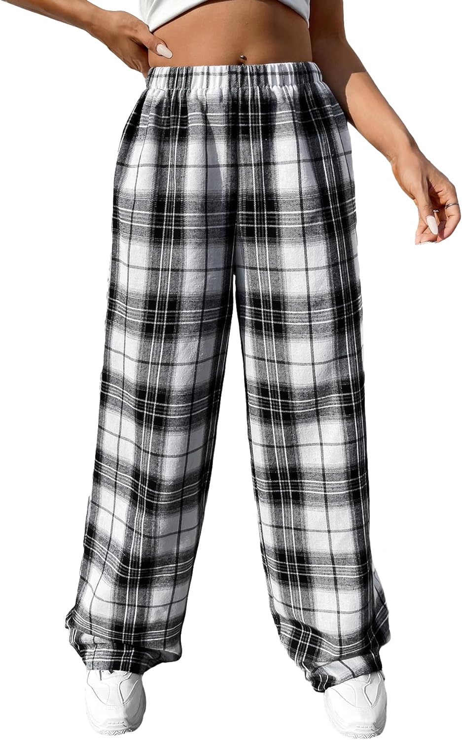 GORGLITTER Women's Loose Plaid High Elastic Waist Casual Wide Leg Pants