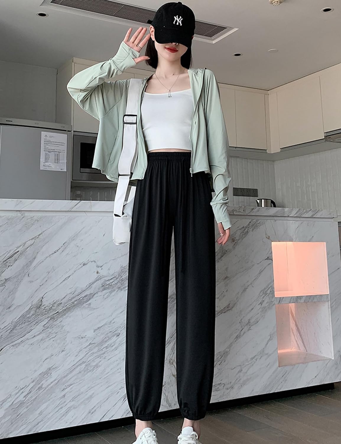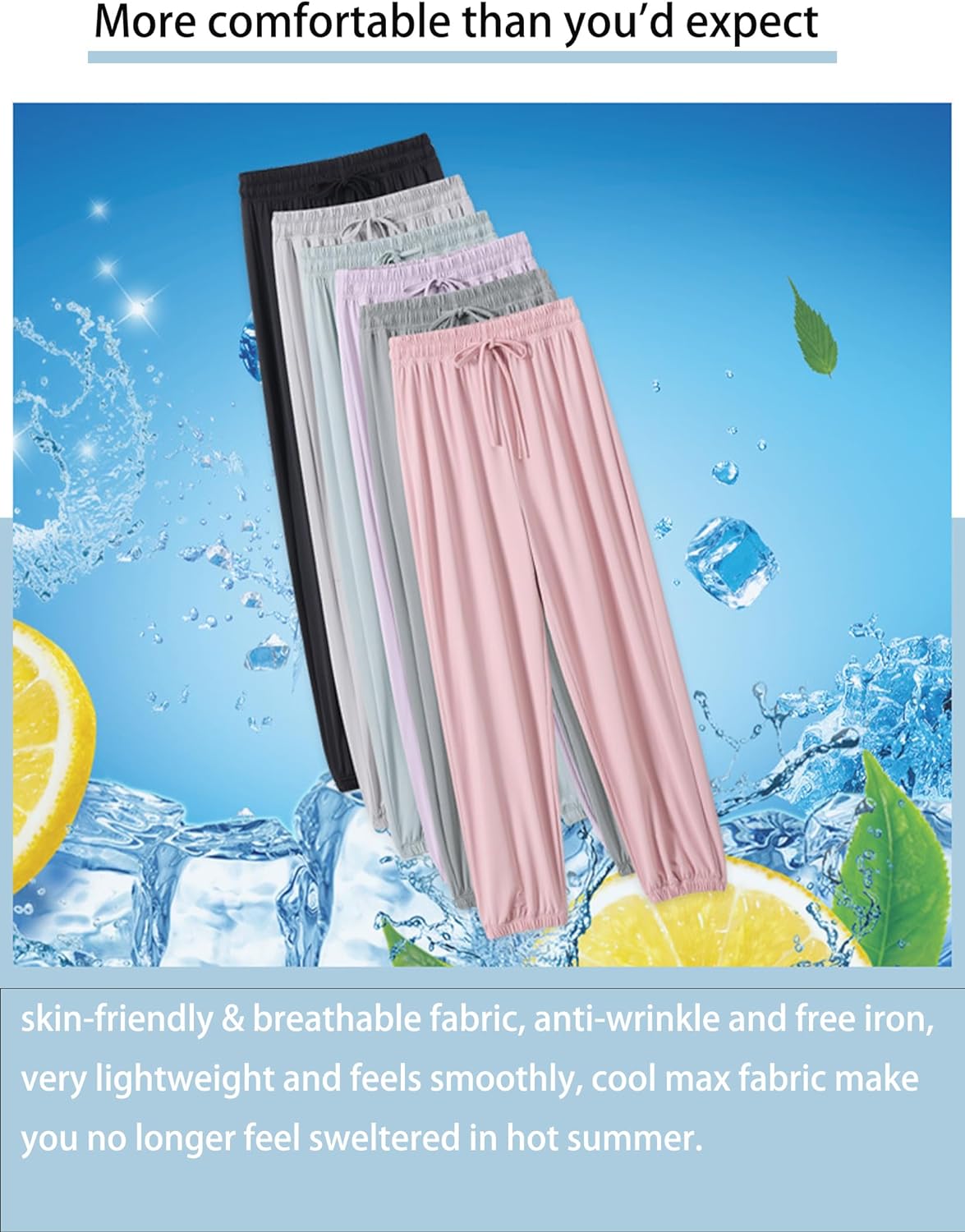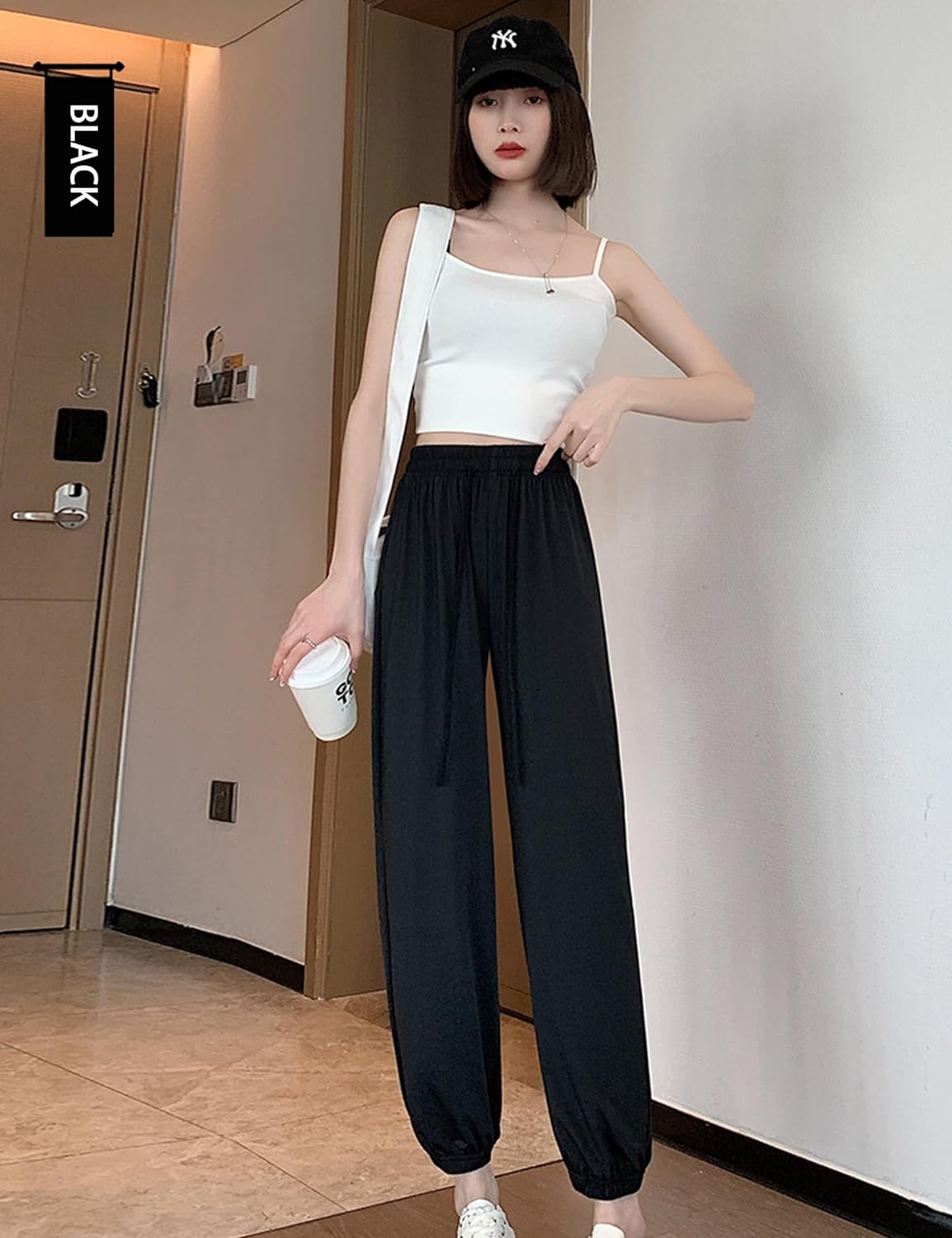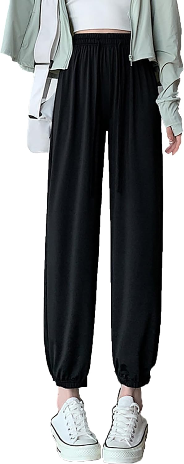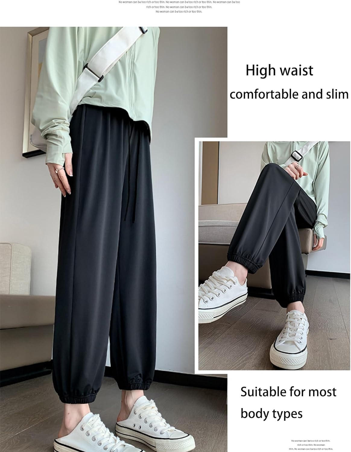 Keqin Women Casual Loose High Waisted Yoga Pants Ice Silk Ankle length High Elastic Comfy Casual Trousers With Drawstring