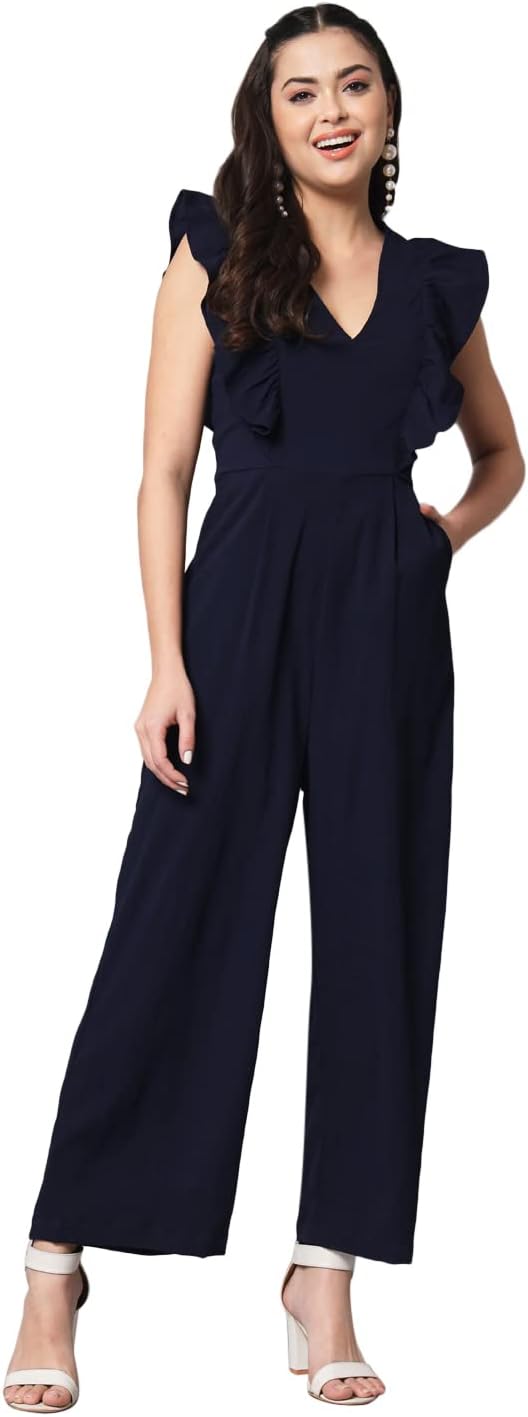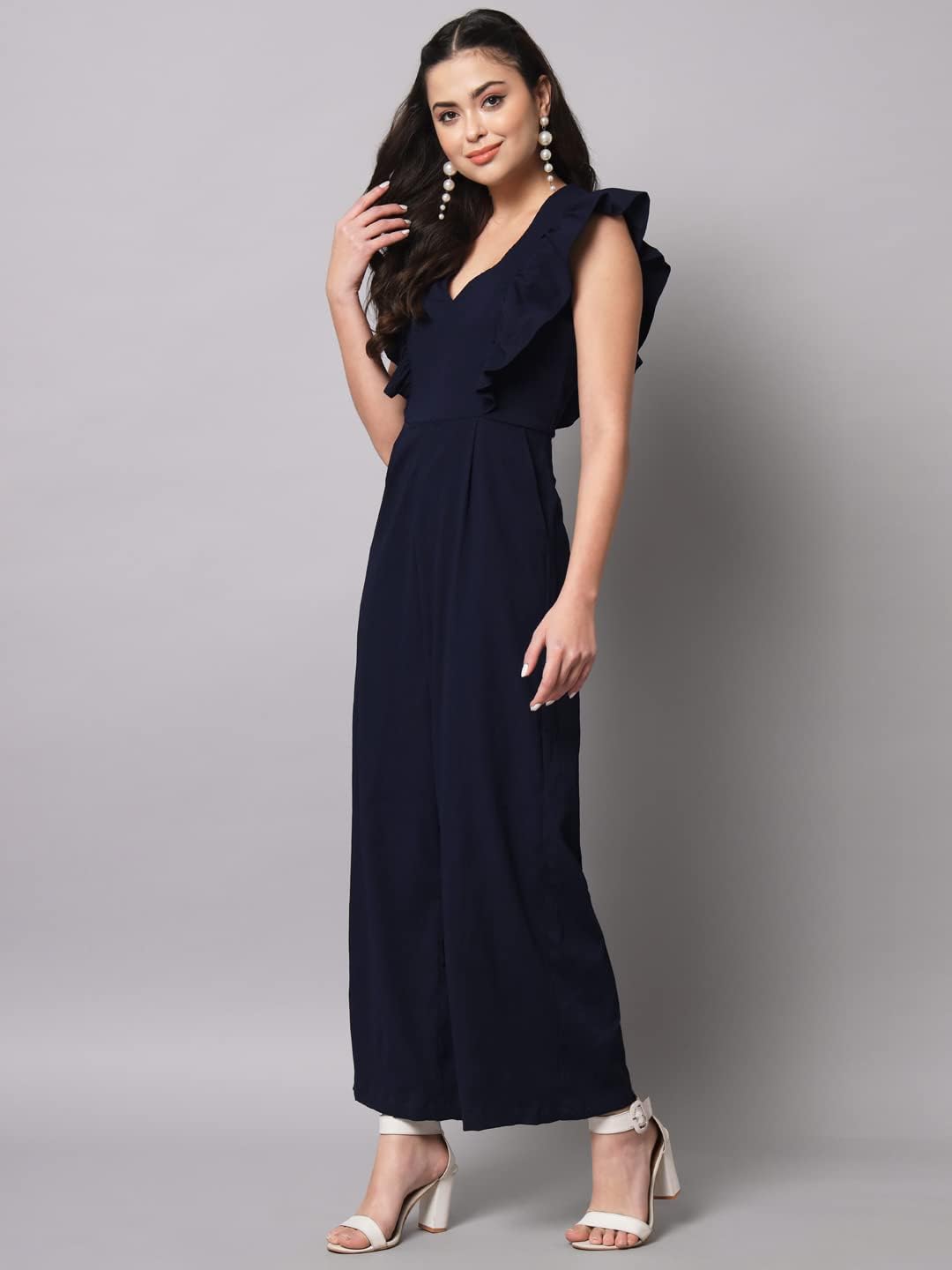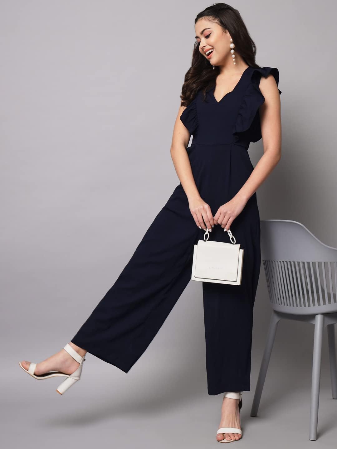 - A casual solid frill jumpsuit typically features a one-piece design with a fitted or semi-fitted bodice and loose, wide-leg pants. The key feature of this jumpsuit is the frill detailing, which can be found on the neckline, shoulders, or sleeves. The frill adds a feminine touch and can create a flattering frame around the upper body.