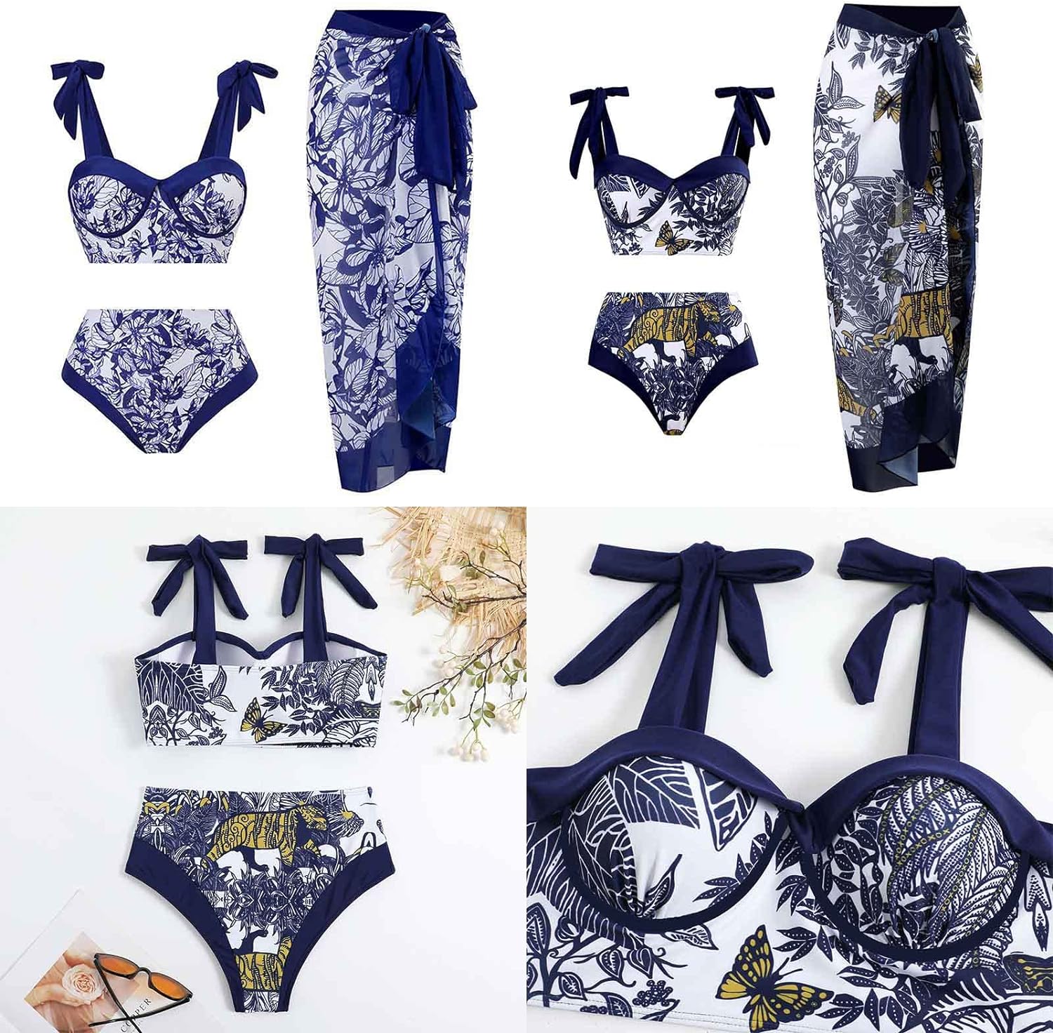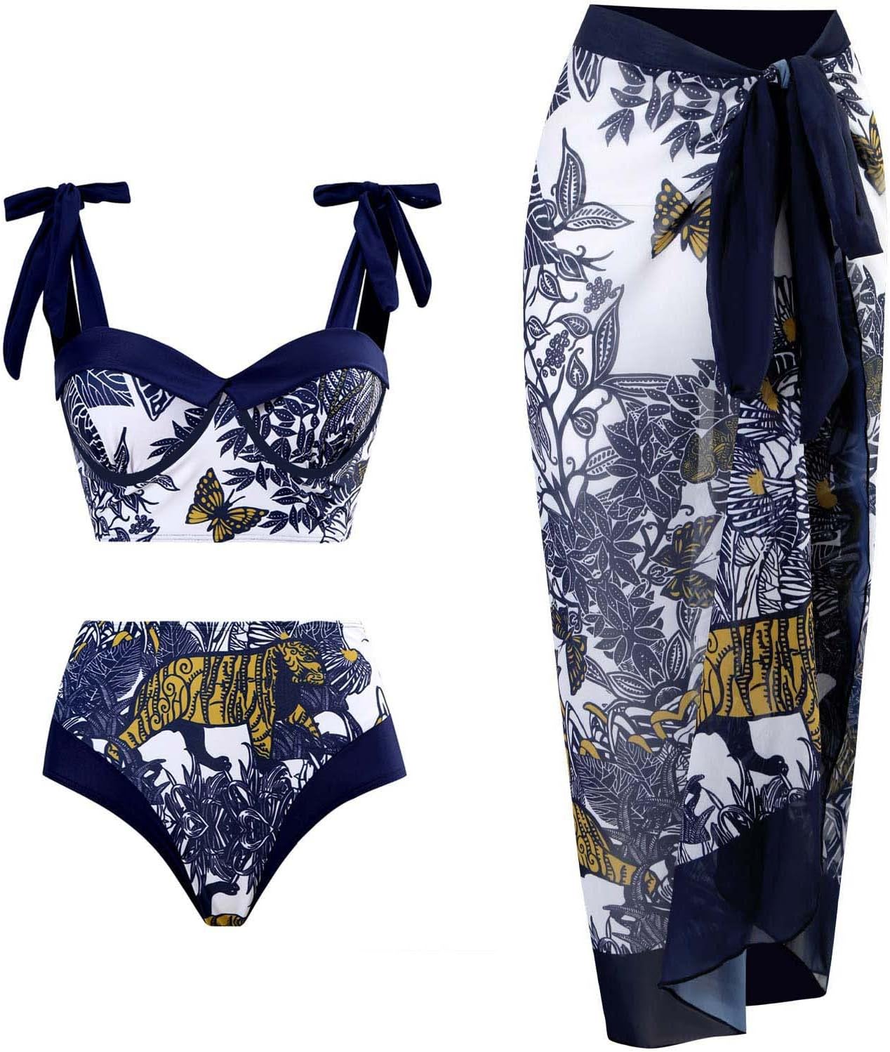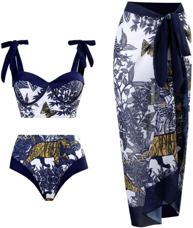Women High Waisted-Bikini Sets with Beach-Wrap Skirt Cover Up Swimsuit Spaghetti Strap Three Piece Bathing Suit Swimwear bikini with skirt cover up set bikini with skirt wrapFeatures: Stretchy fabric,durable,makes it easy and very comfortable to wear, the swimsuit inclued bikini sets and cover-up skirtPrinted strap bikini push up-bras and high waist bottom,paddings provide slightly support and flexible fitting choicesLong cover up tie side skirt to protects sensitive skin from sun-burn,and makes you more-charmingSuitable for beach-pool, swimming, surfing, summer-vacation, , honey-moon and any other water activitiesWonderful gift,the three piece bathing suits can sweet warm gift for wife girlfriendSpecifications: Material:NylonColor:Tiger,Blue FlowerSize:S Bust:86.36-90.17cm(34-35.5inch) Waist:68.58-72.39cm(27-28.5inch) Hips:93.98-97.79cm(37-38.5inch) Size:M Bust:91.44-95.25cm(36-37.5inch) Waist:73.66-77.47cm(29-30.5inch) Hips:99.06-102.87cm(39-40.5inch) Size:L Bust:99.06-102.87cm(39-40.5inch) Waist:81.28-85.09cm(32-33.5inch) Hips:106.68-110.49cm(42-43.5inch) Size:XL Bust:106.68-110.49cm(42-43.5inch) Waist:88.90-92.71cm(35-36.5inch) Hips:114.30-118.11cm(45-46.5inch)Package Includes: 1 Set Bikini with SkirtNote: Please allow 1-2cm errors due to manual measurement. Due to the-difference betweeen different monitors,the-picture may not reflect the-actual color of the-item.