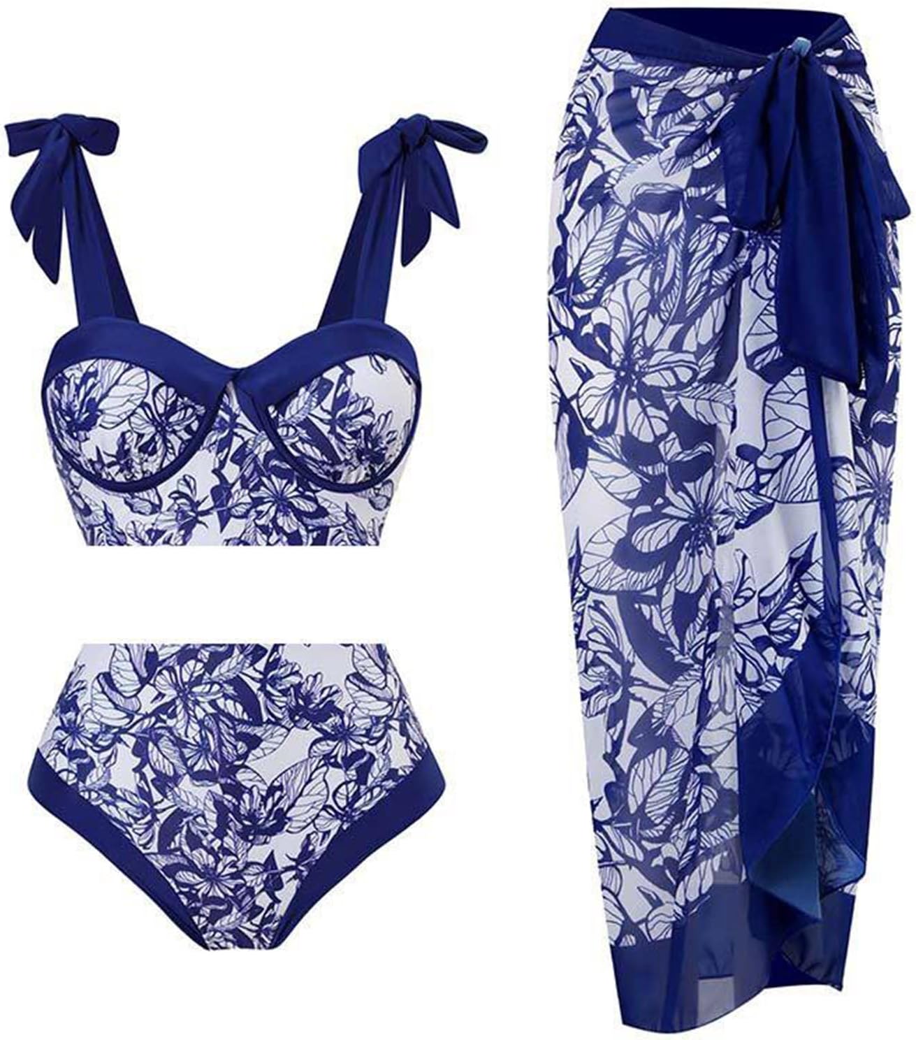 Lamala Women High Waisted-Bikini Sets with Beach-Wrap Skirt Cover Up Swimsuit Spaghetti Strap Three Piece Bathing Suit Swimwear bikini with skirt cover up set bikini with skirt wrap, L, blue flower