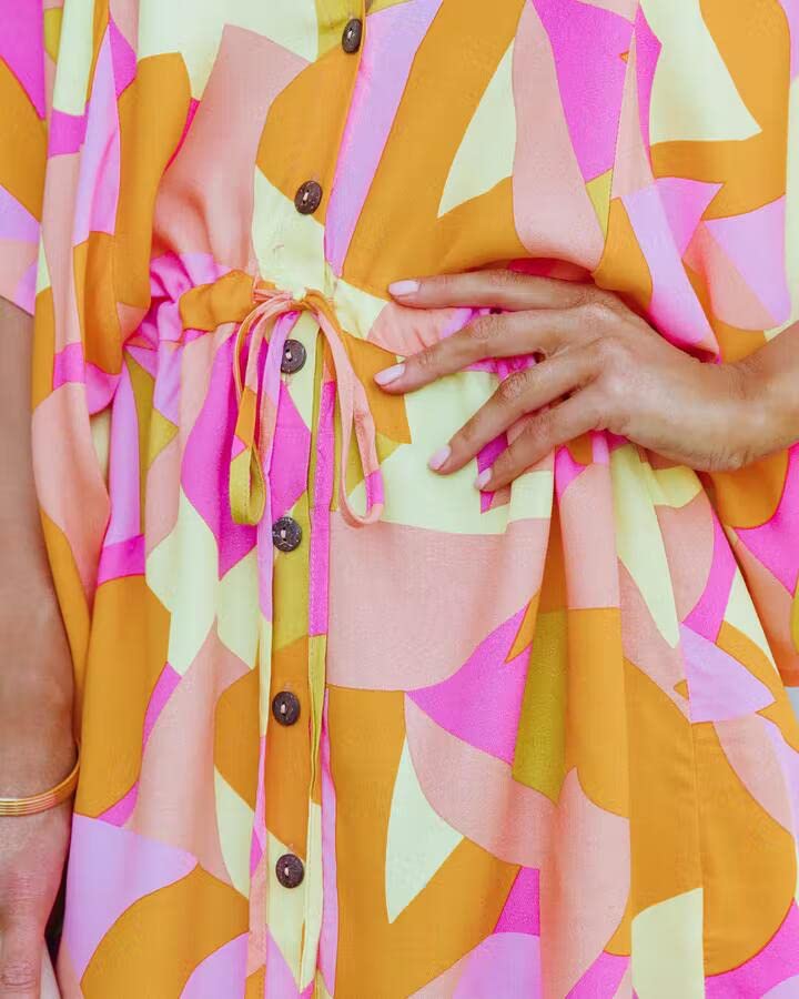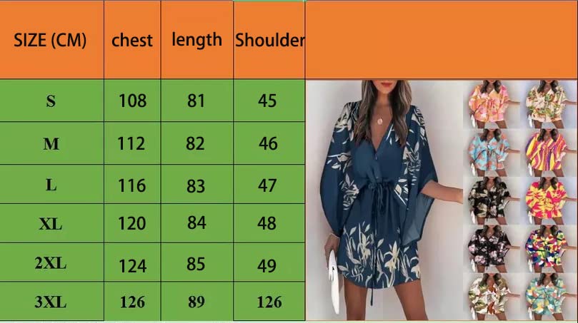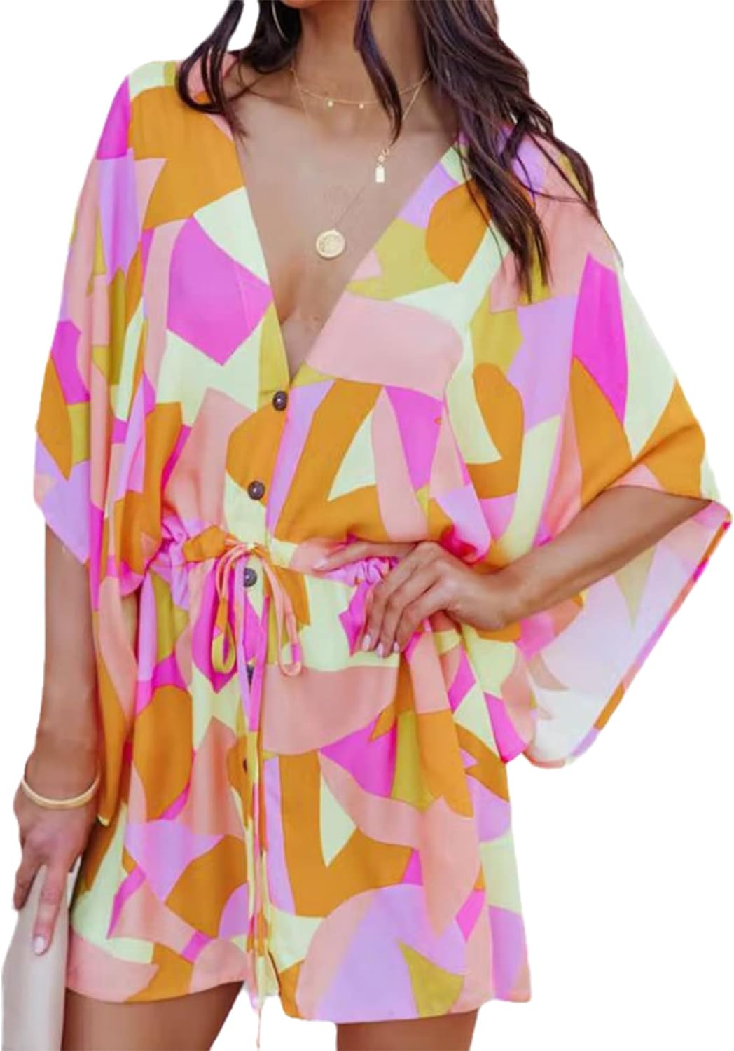 Women's Summer Jumpsuit Floral Print V Neck Baggy Sleeve Waist Tie Mini Dresses with Button Decor