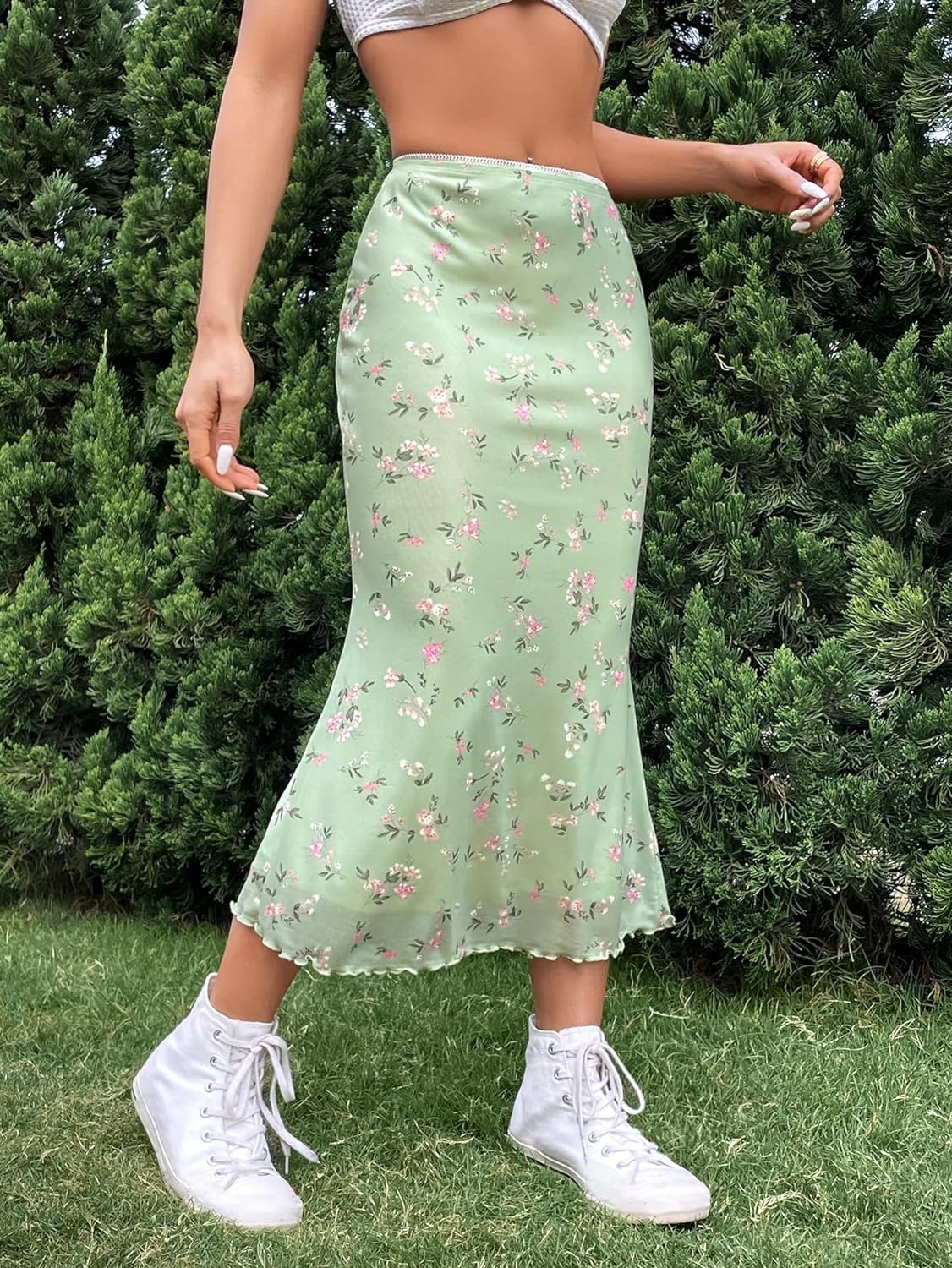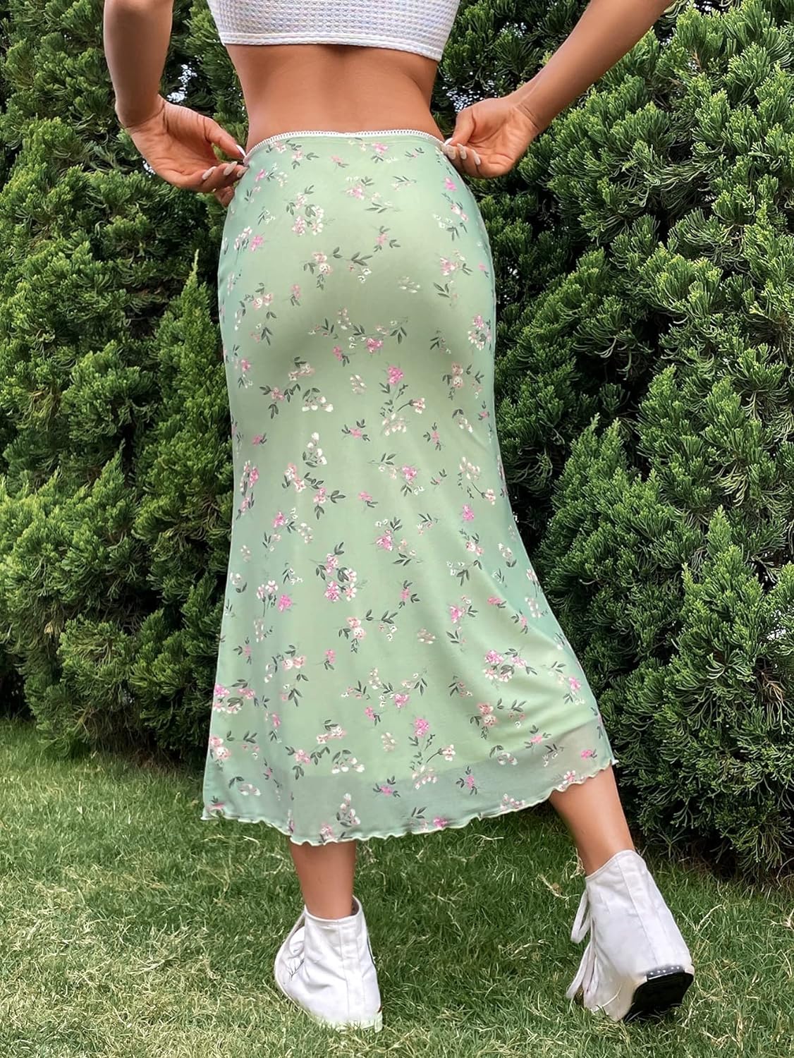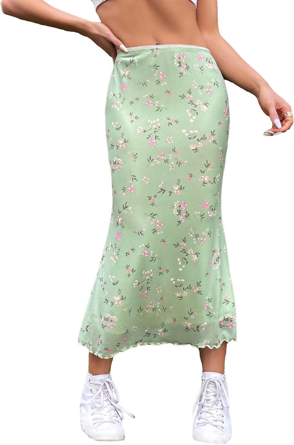 GORGLITTER Women's Floral Mesh Lettuce Trim High Waist Boho Mermaid Midi Skirt