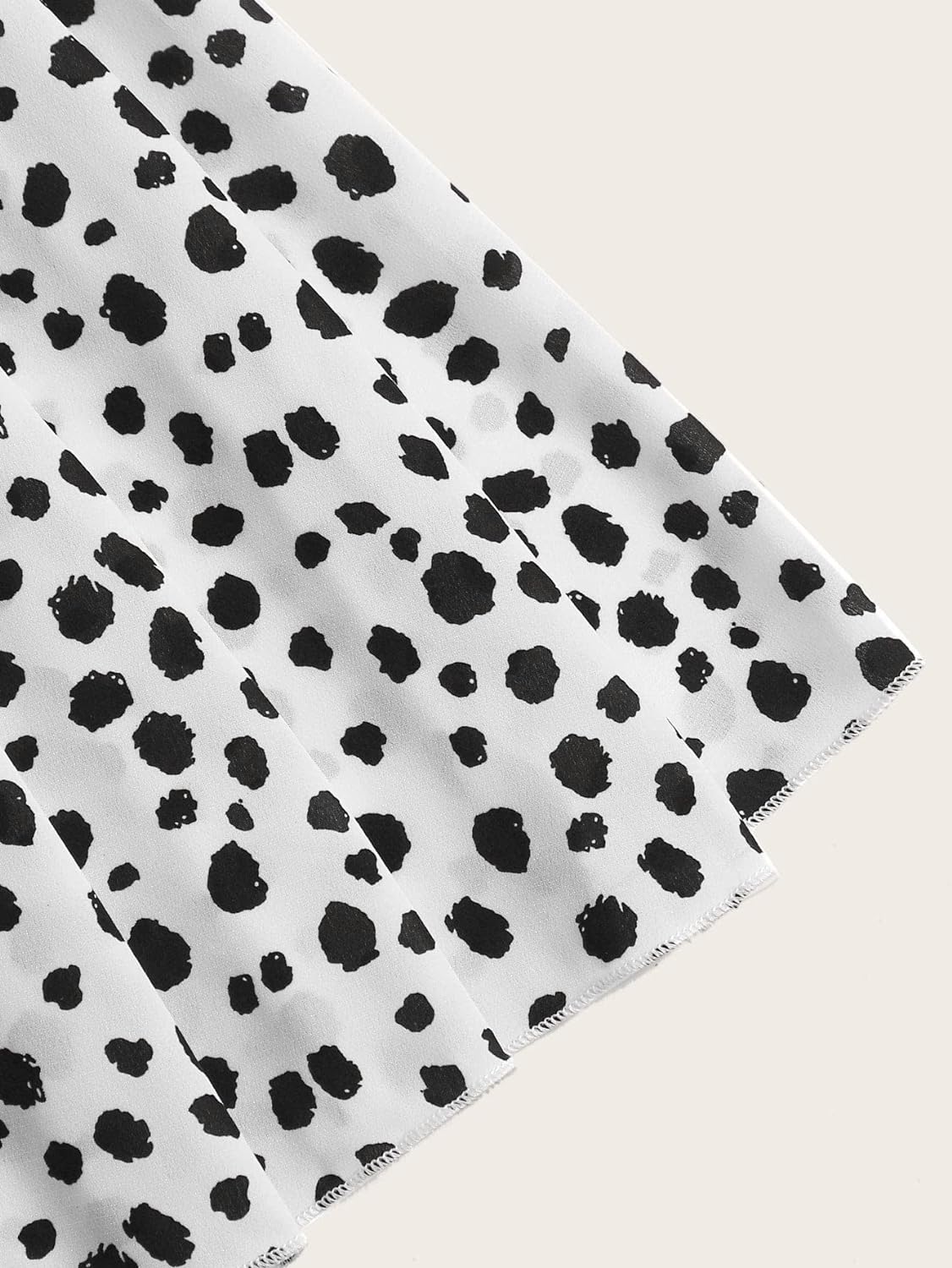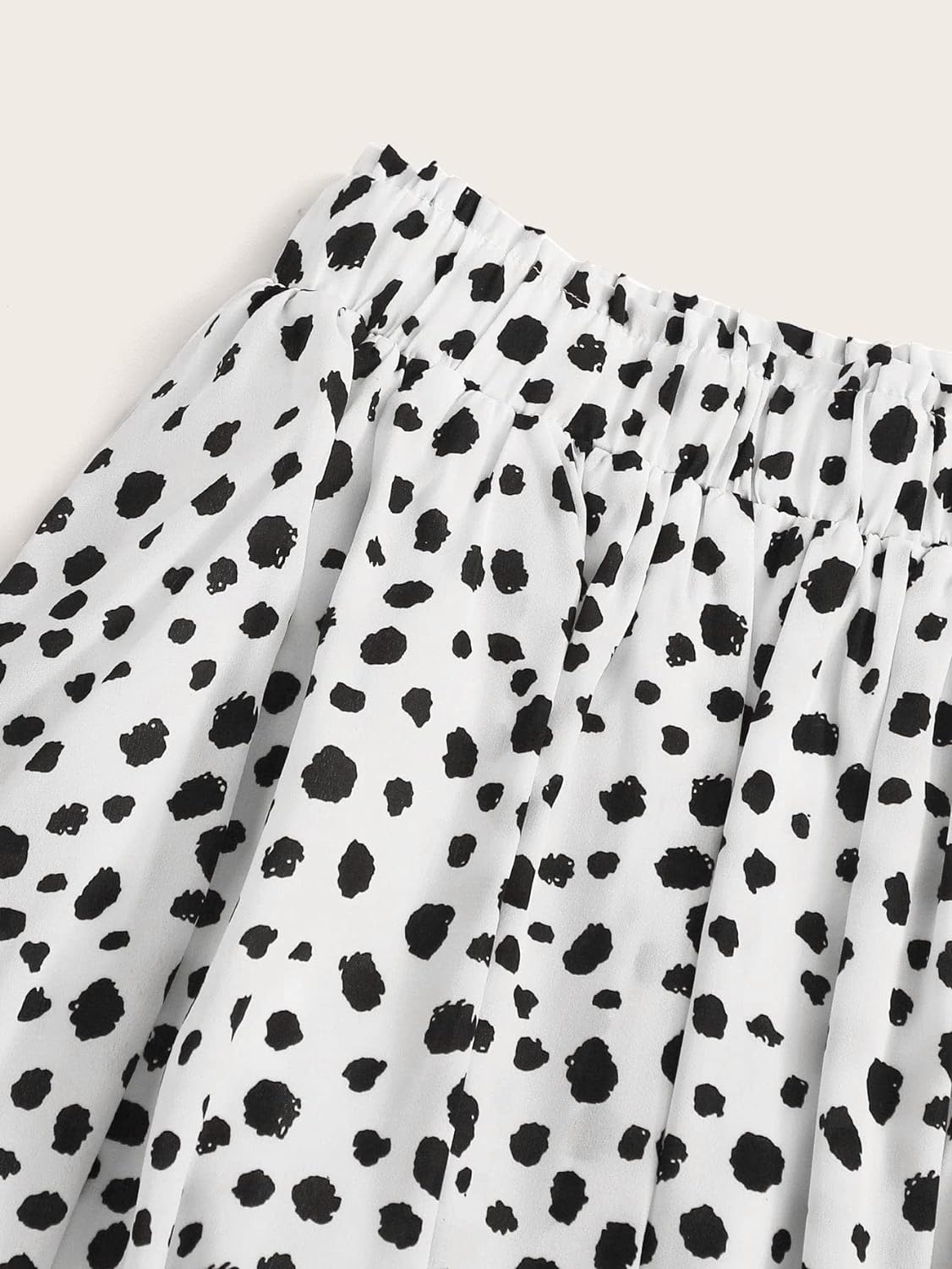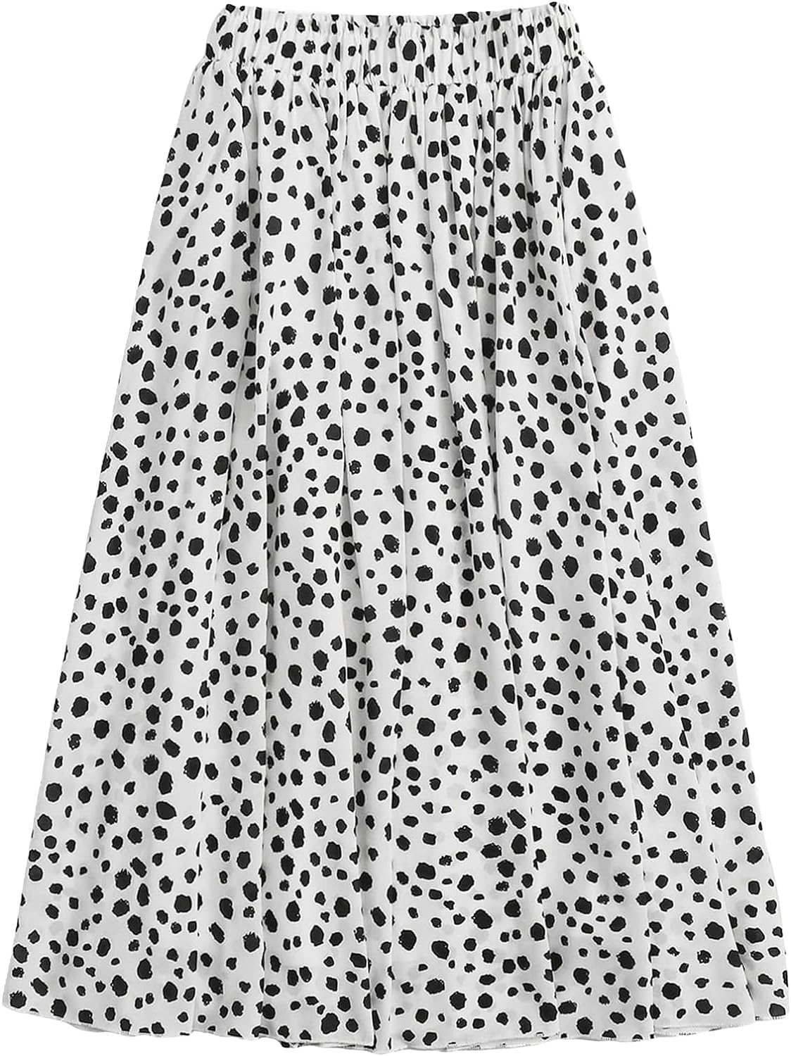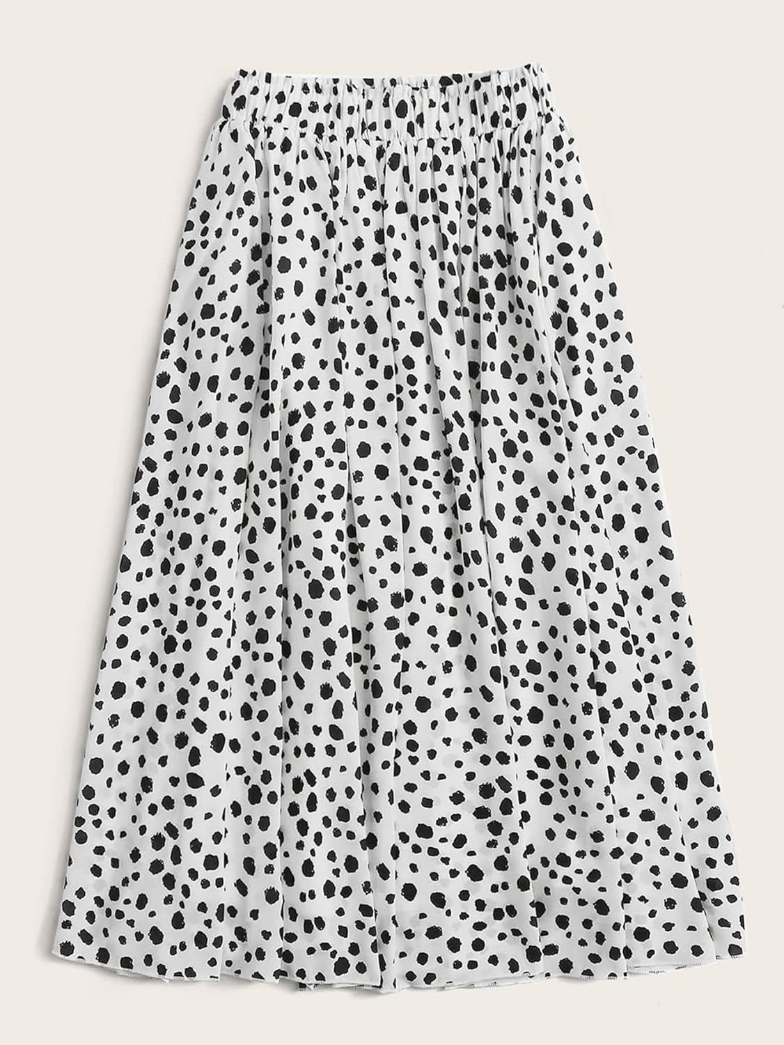 - Features: allover print, polka dots, pleated, a line, loose midi skirt