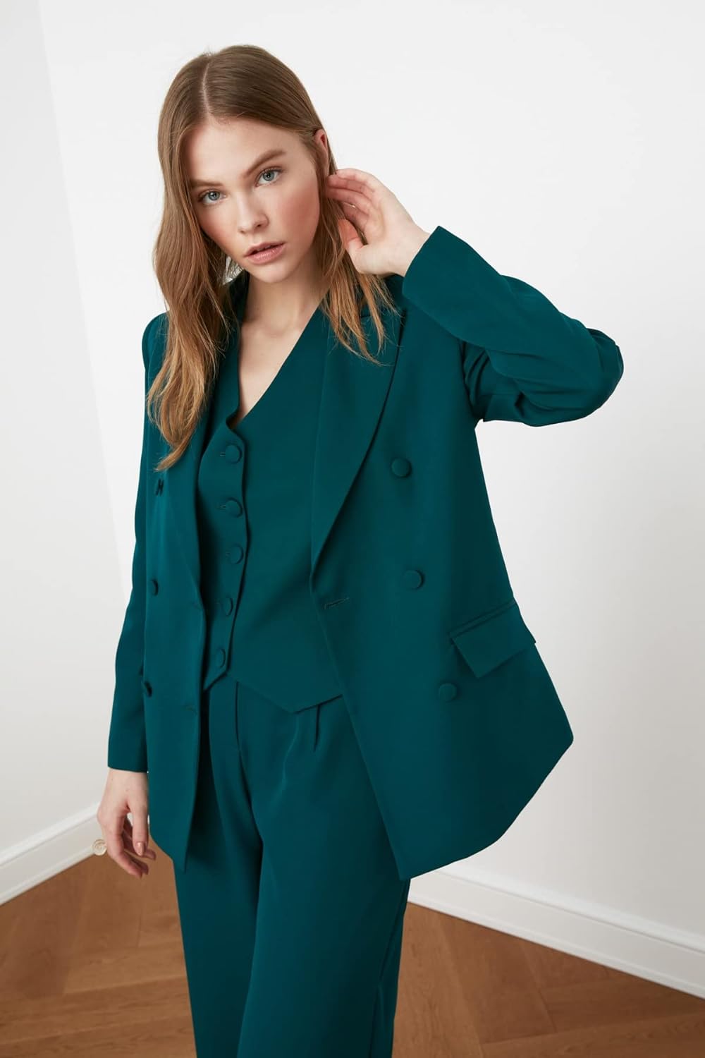 - Model: boy: 1.76, chest: 71, bel: 61, hips: 89. Combin Vest Code: Twoss21YE0009, Combine Pants Code: Twoss21PL0189 The product on the mannequin is S / 36. 95% polyester 5% elastane, weaving fabric. Lining: 100% polyester. Ridge length for size 36 70 cm. Our products will be sent by trendyol tag."