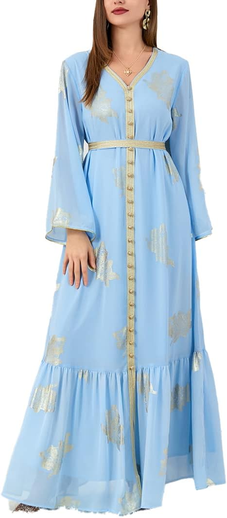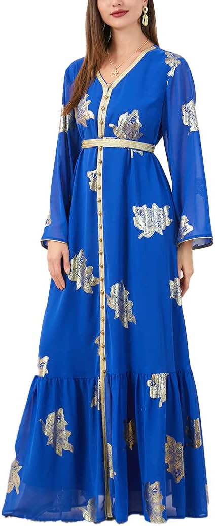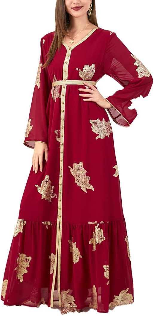 • Stylish Design: This Abaya dress is beautifully designed with a printed pattern, long sleeves, and a V-neckline that adds a touch of elegance to your wardrobe. The button tape trim and belted waist create a flattering silhouette that is perfect for any occasion.