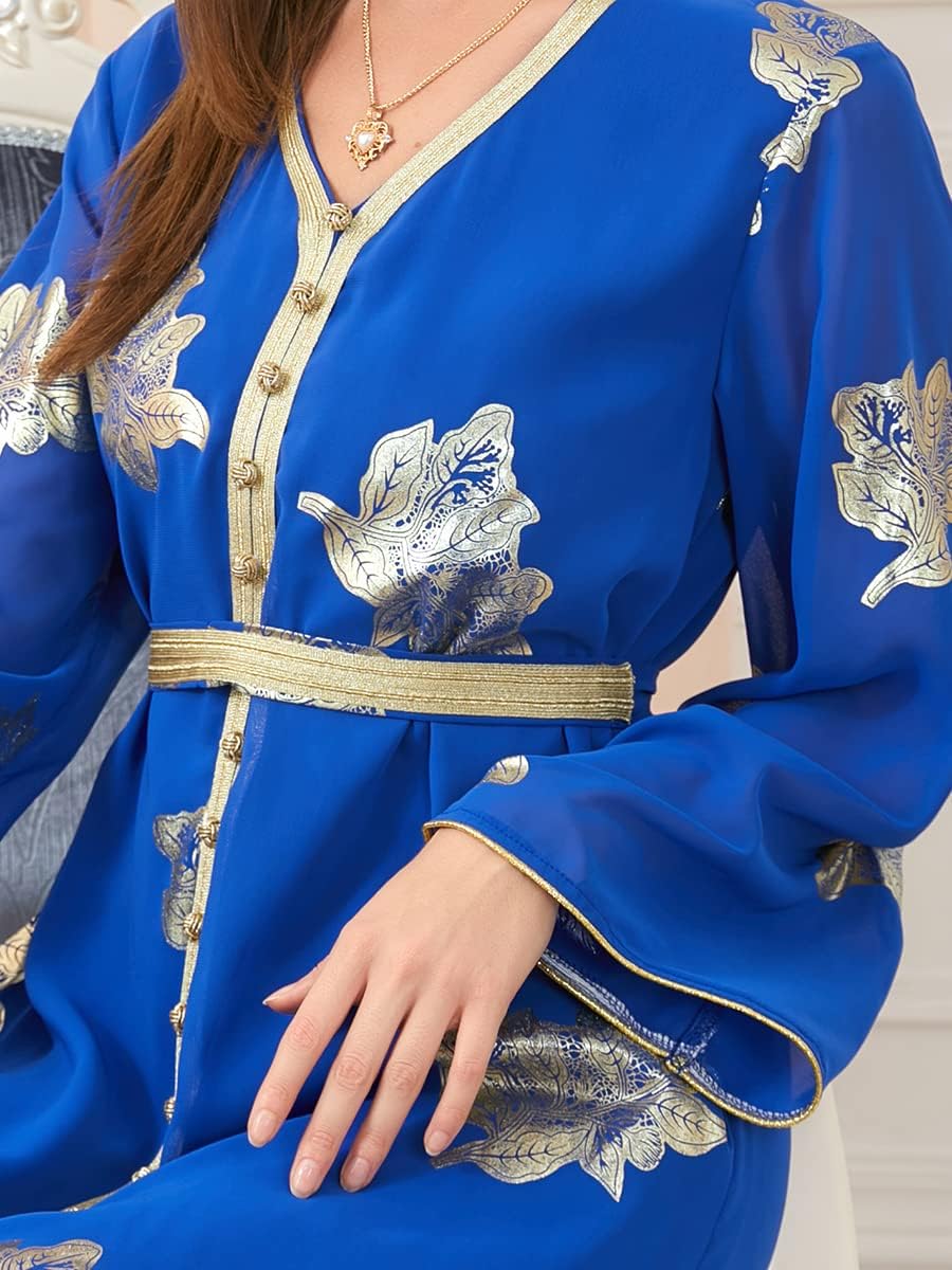 HAAKYEA Party Dresses Abayas For Women Dubai Printed Long Sleeve V-Neck Button Tape Trim Belted Kaftan Split Hem Clothes