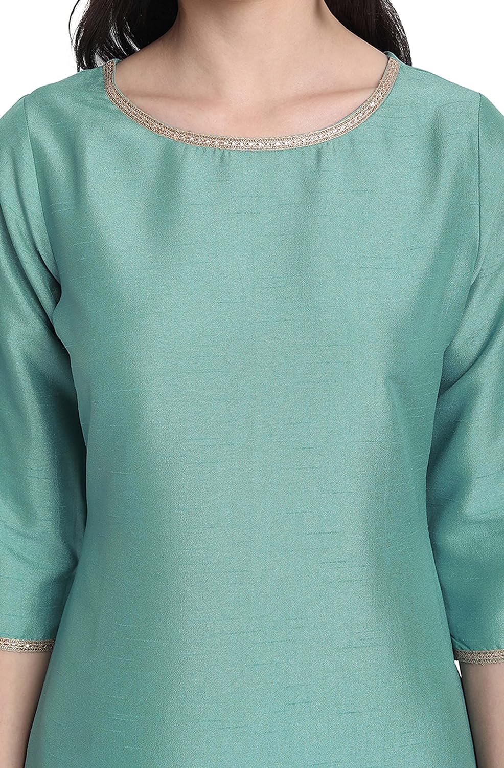 An exploration of the modern vocabulary of design, this green slawar suit set from Janasya is sure to allure you. Tailored to sartorial perfection from poly silk, it features lace detailing on neckline and sleeves hem and comes with beige woven art silk dupatta to highlight the solid kurta and pant. Pair it up with traditional earrings and mojris for complete ethnic look.