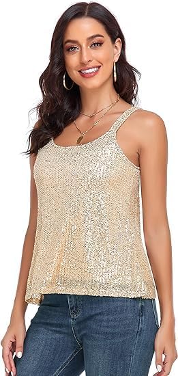 - Casual loose fit style, scoop neck, sleeveless strappy tank top, elegant and fashion. Loose hem with flowy, effectively hides the tummy. Pull on clousure. Layer this sparkly top under other tops, or wear it on its own.
