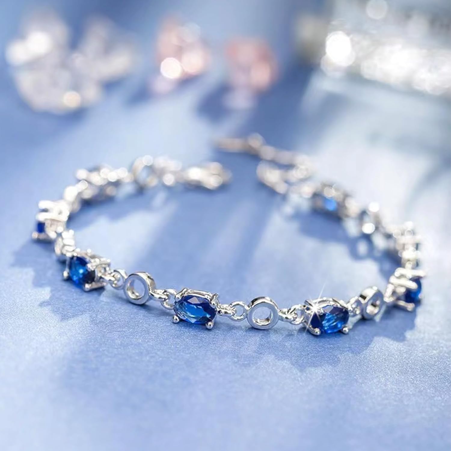 • Exquisite Sapphire Bracelet: This women's bracelet features stunning blue sapphire gemstones, accompanied by sparkling cubic zirconia accents, creating a captivating and luxurious look.