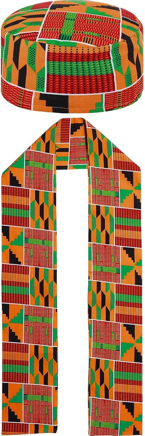 2 Pcs African Kente Pattern Kufi Hat Kente Kufi Hat Men Hat and Kente African Print Stole Sash for Black African History Men Women Kids