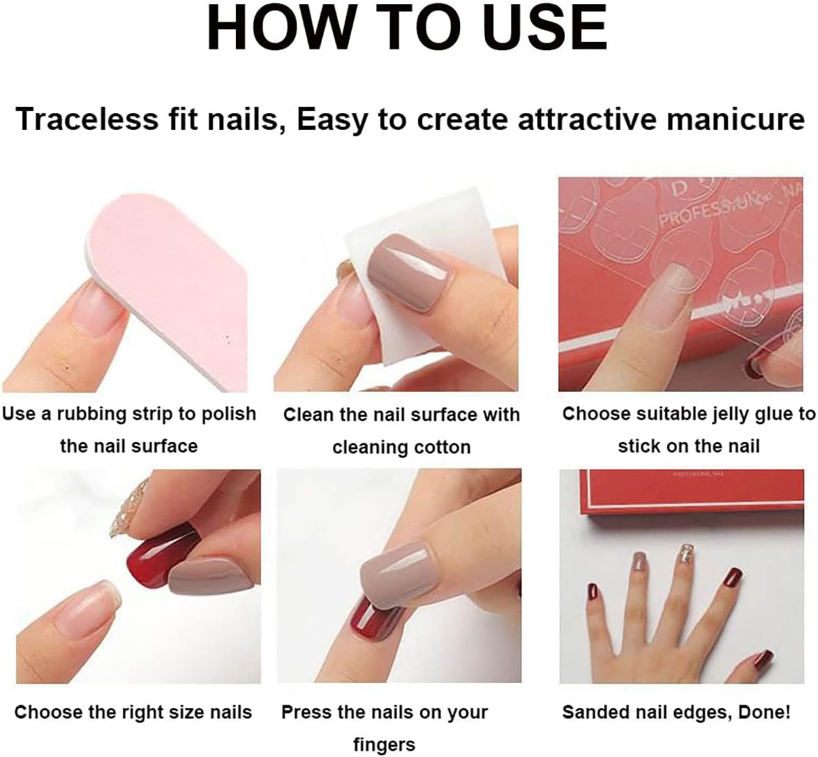 【EASY TO USE】Trim and clean your natural nails first, choose the right size and apply our fake nails jelly glue, then press on the nails for 10 seconds. When removing press on nails, soak the nails in water for 1 minute and then easier removal.