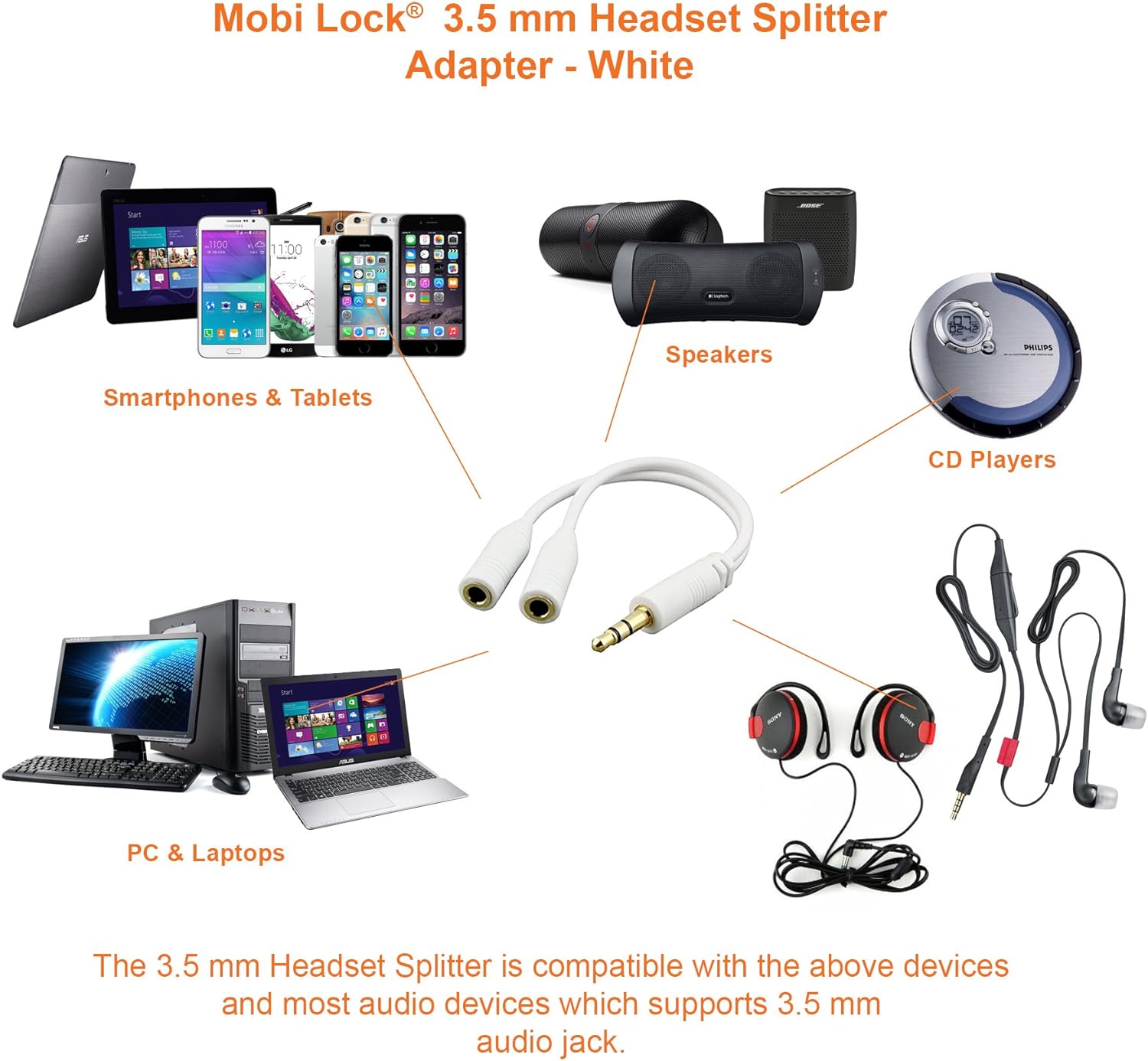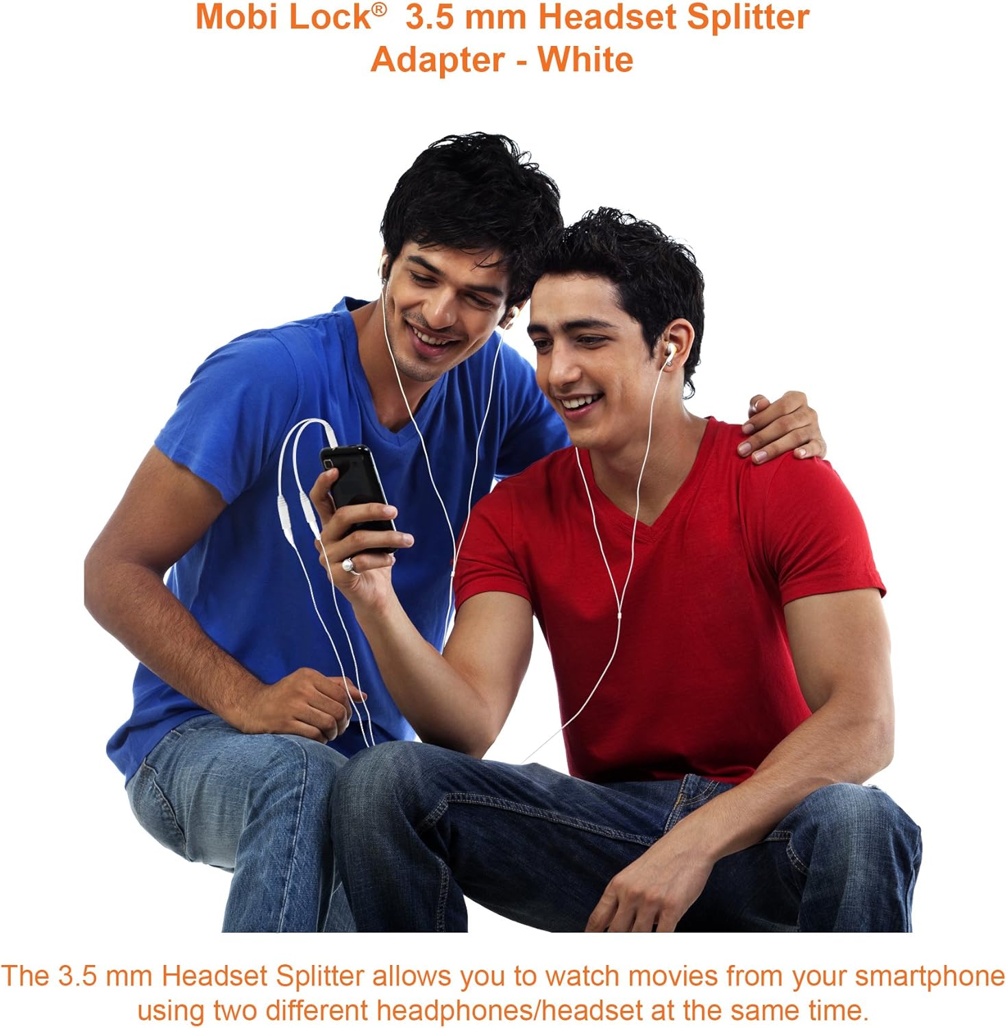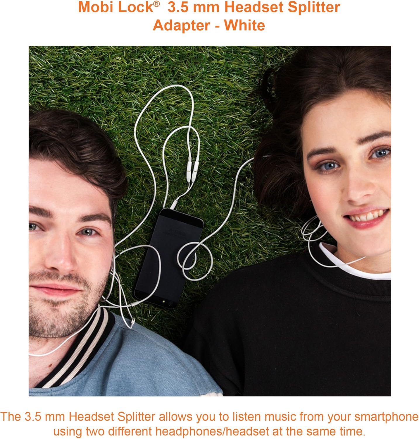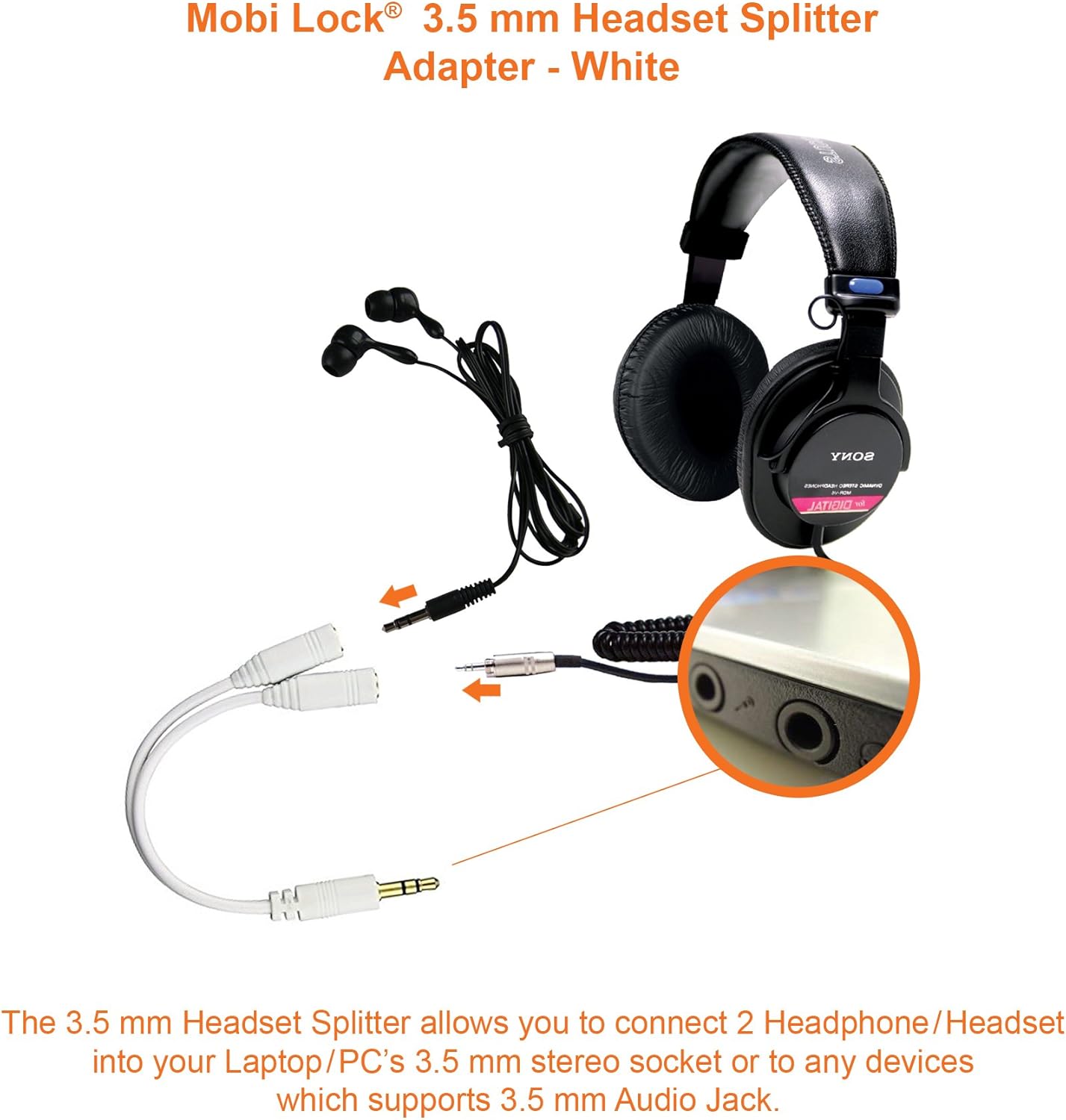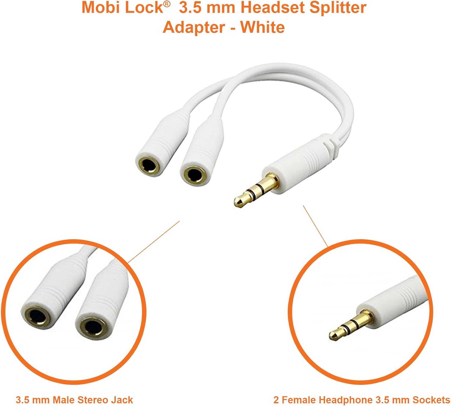 3.5mm Headphone Y Splitter | 1 Male to 2 Female Audio Jacks | Allows 2 People to Listen to 1 Sound Source | Ideal for all Media Players and Audio Devices with a 3.5 mm Port (White) - by Mobi Lock