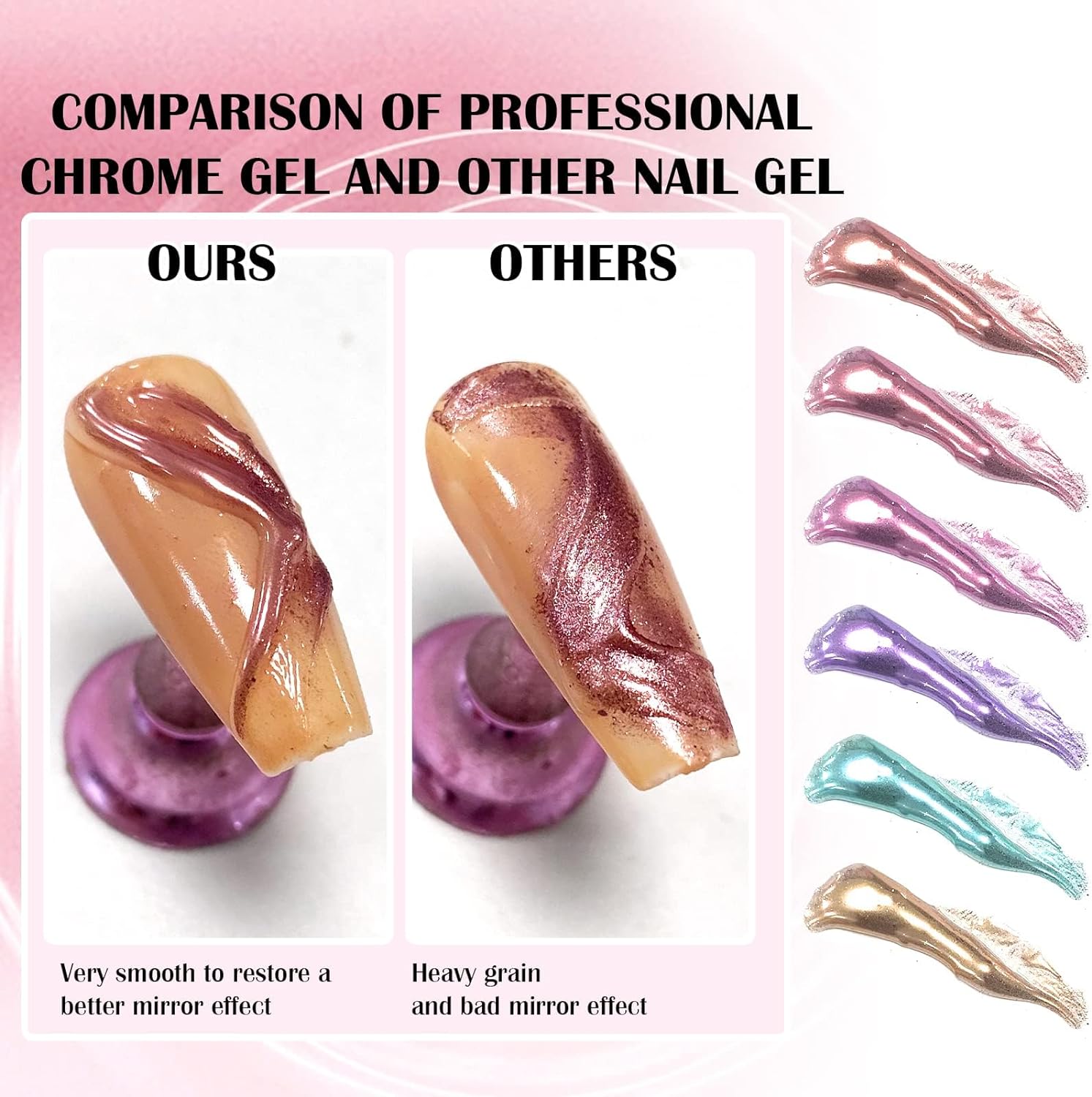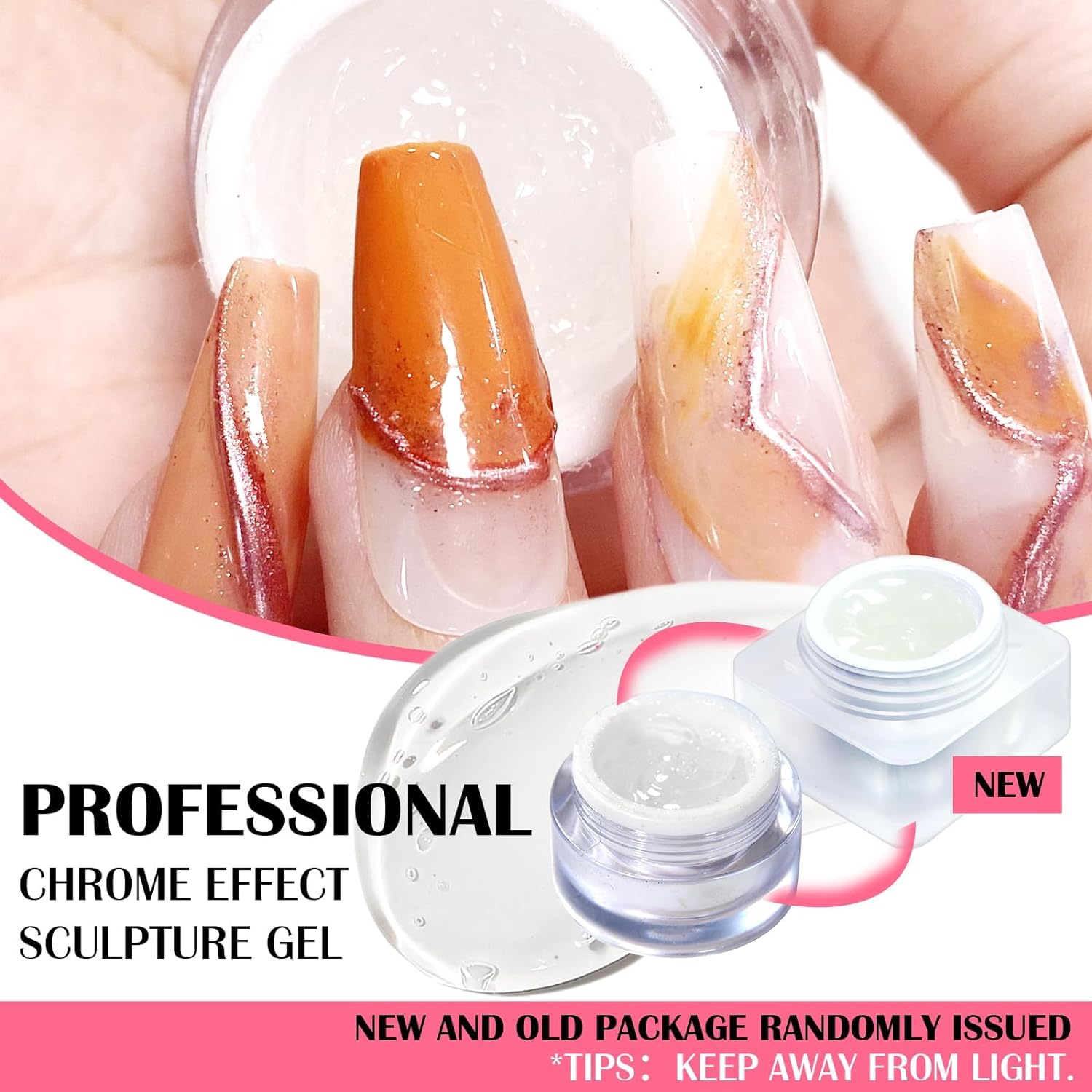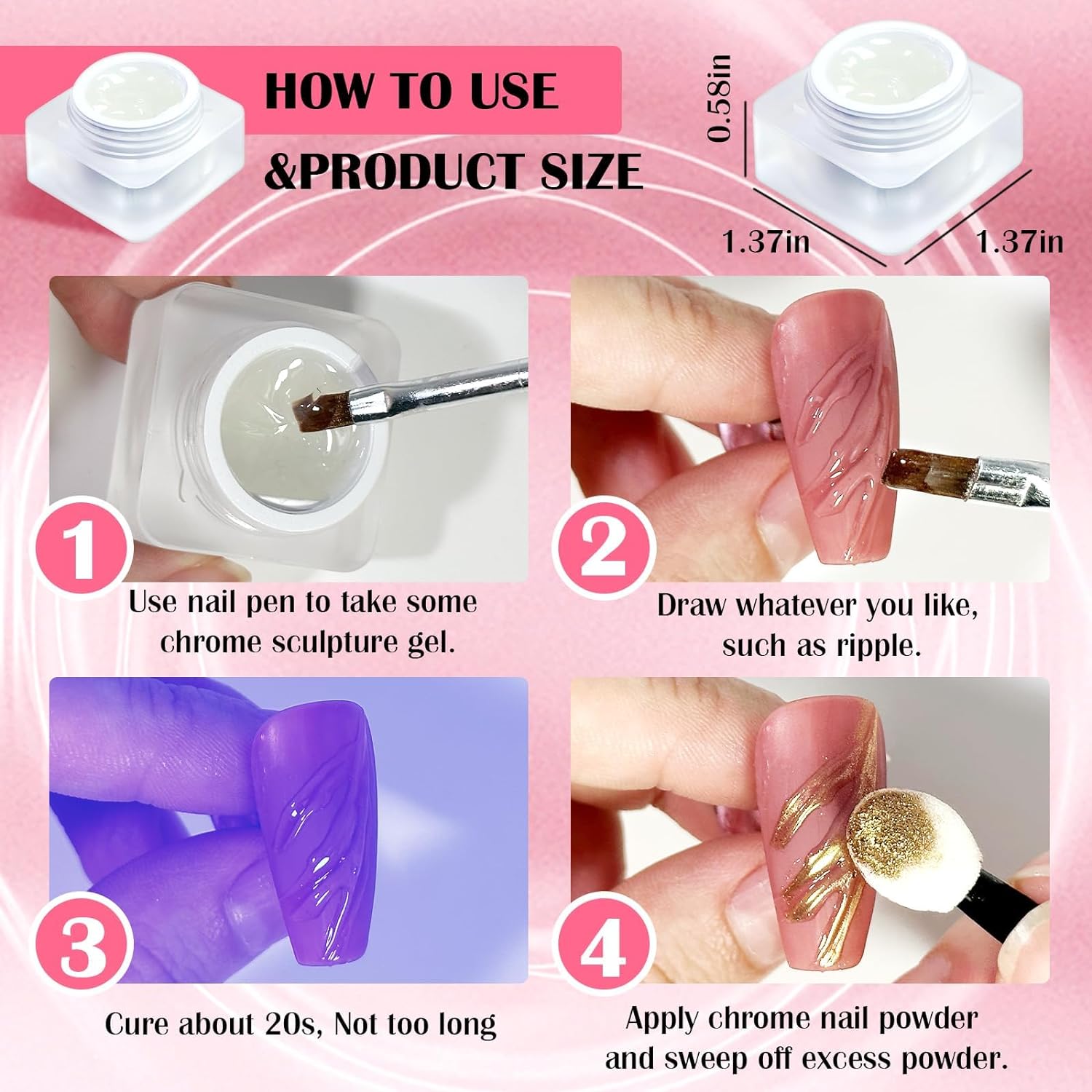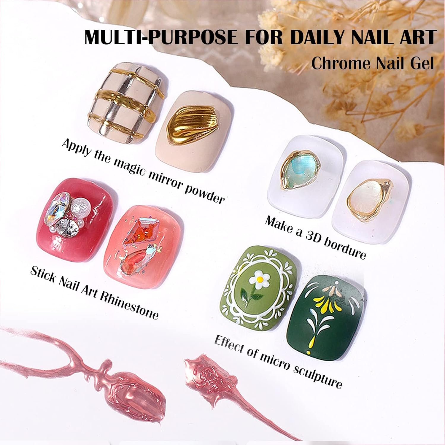 đăProfessional Nail Gel For Chrome PowderăAll kinds of mirror powder, pearl nail powder and aurora powder can be rub on our gel. The better effect you will see compare with other sculpture gel or top coat. Rub on common carving gel will get uneven and no gloss effect, but rub on special chrome nail gel will get more gloss and perfect metallic nail art. Generally cured for 45s under 48W nail lamp, the metallic effect will be better.
