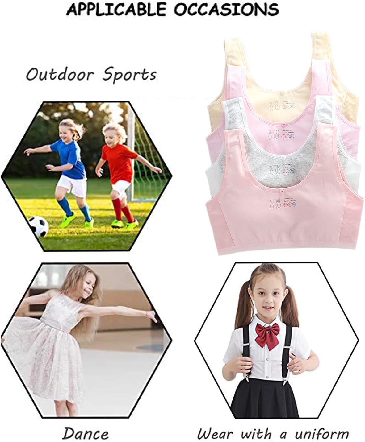 • Occasion to Wear: These training bras are specially designed for girls aged 8-14 Years. It is perfect for daily wear and suitable for activities like cheer-leading, dance, gymnastics, PE class and other sports.