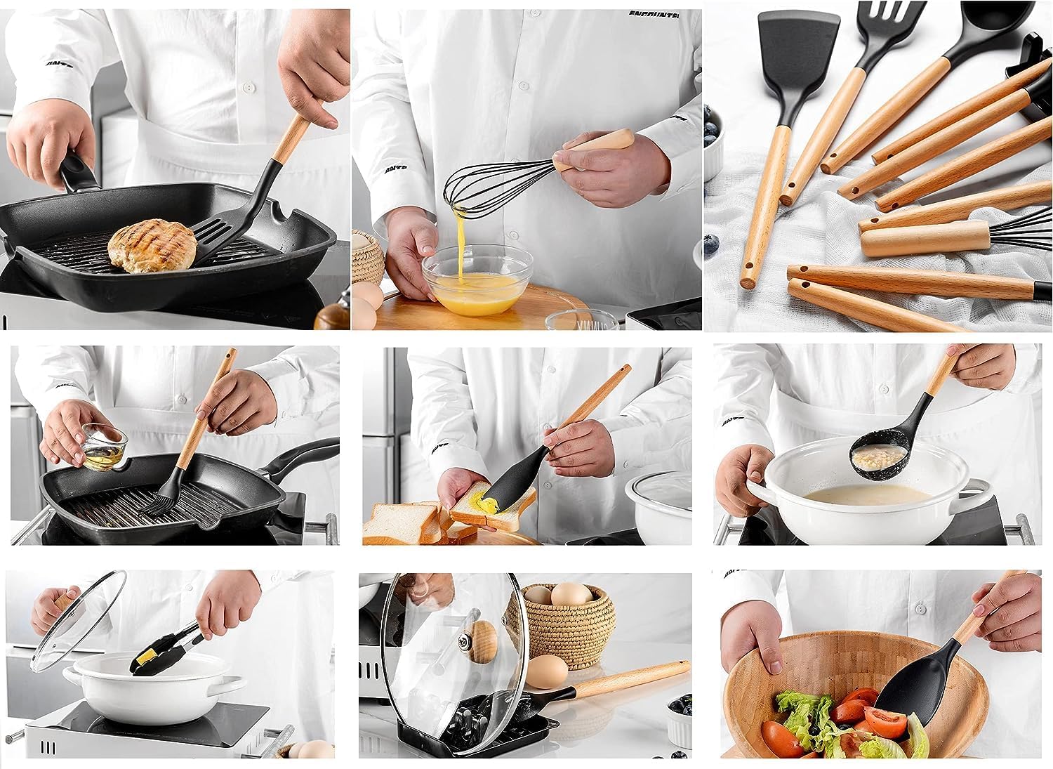 4、EASY TO CLEAN AND MAINTAIN - Simply wipe our utensils under hot water for easy cleaning. Please don't put the set in the dishwasher or soak the wooden handles in water for extended periods, as this may cause cracks.