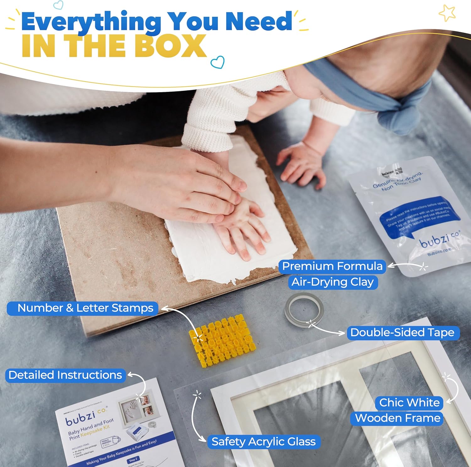 COMPLETE MEMORY MAKING SET This baby hand and footprint kit includes everything you need! Air-drying clay, a wooden frame, acrylic safety glass, double-sided tape, letter stamps, and detailed instructions. It's the perfect present for a new mom or a cute and meaningful addition to your baby boy or baby girls nursery decor!
