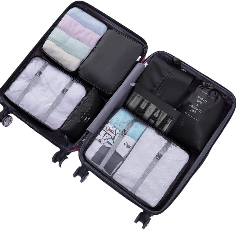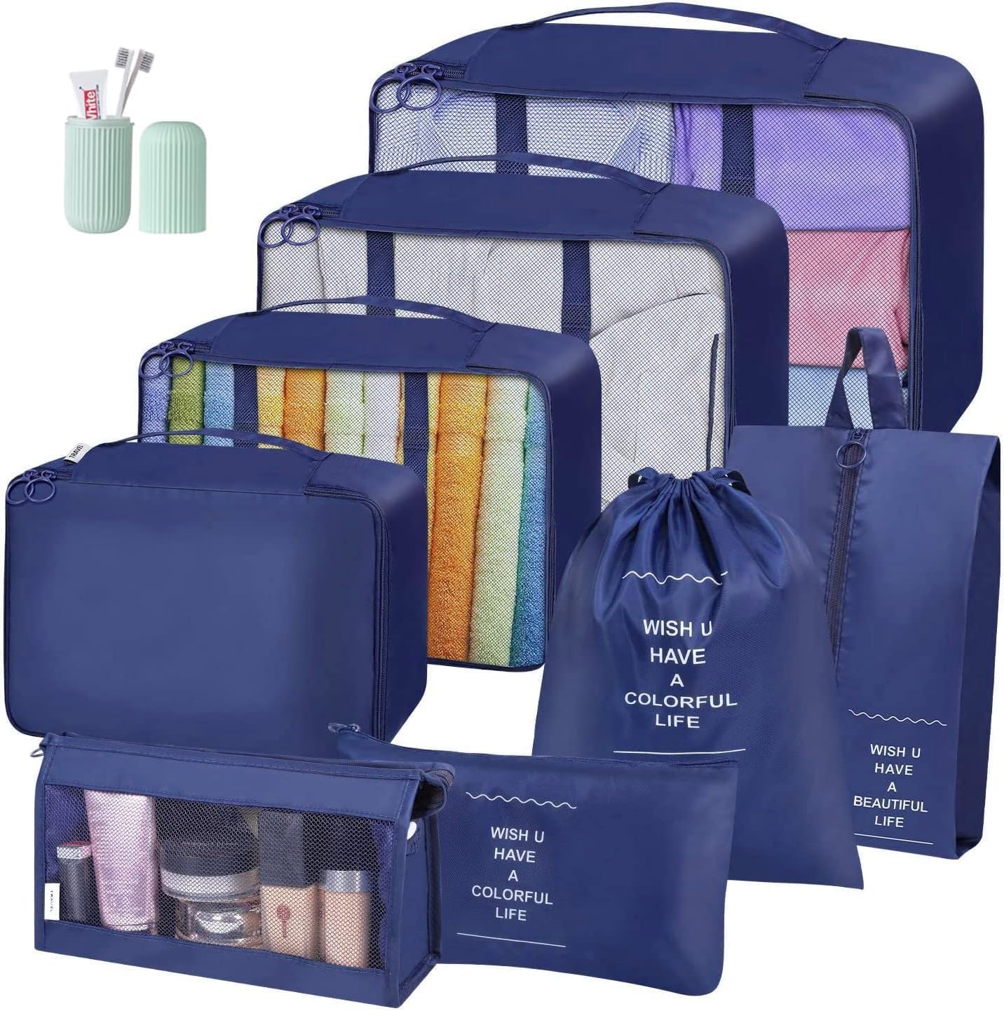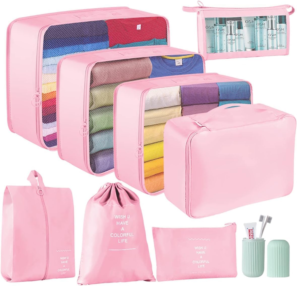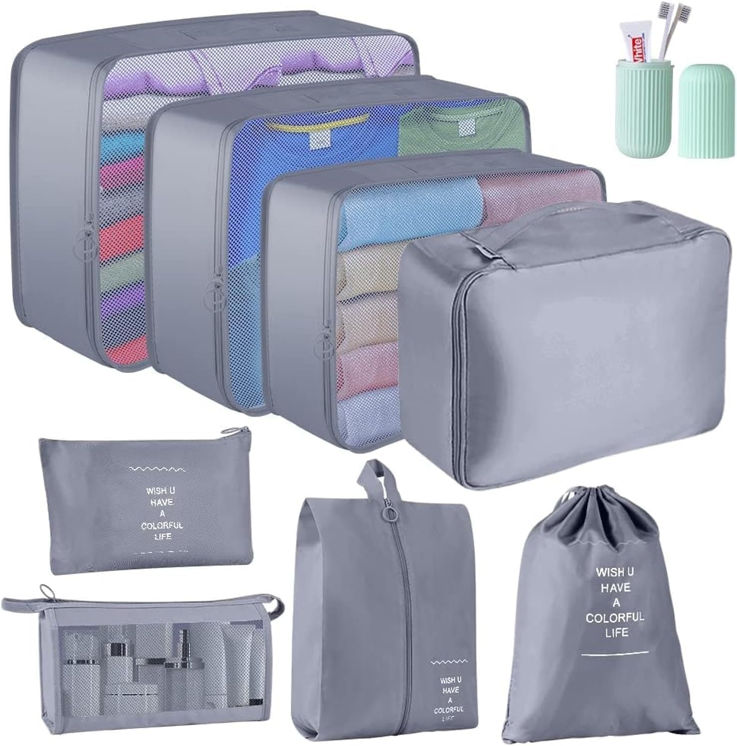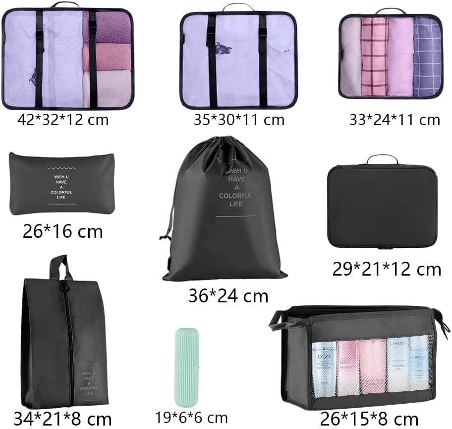 9 Pcs Packing Cubes - Our set include 3 sizes of travel organizers packing cubes, 1 private cubes for bras and underwear, 1 travel shoes bag, 1 toitetry bag, 1 toothbrush cup,1 laundry bag for dirty clothes and 1 flat bag for small items. Different sizes that meet all your needs, and keep your clothes stay organized!