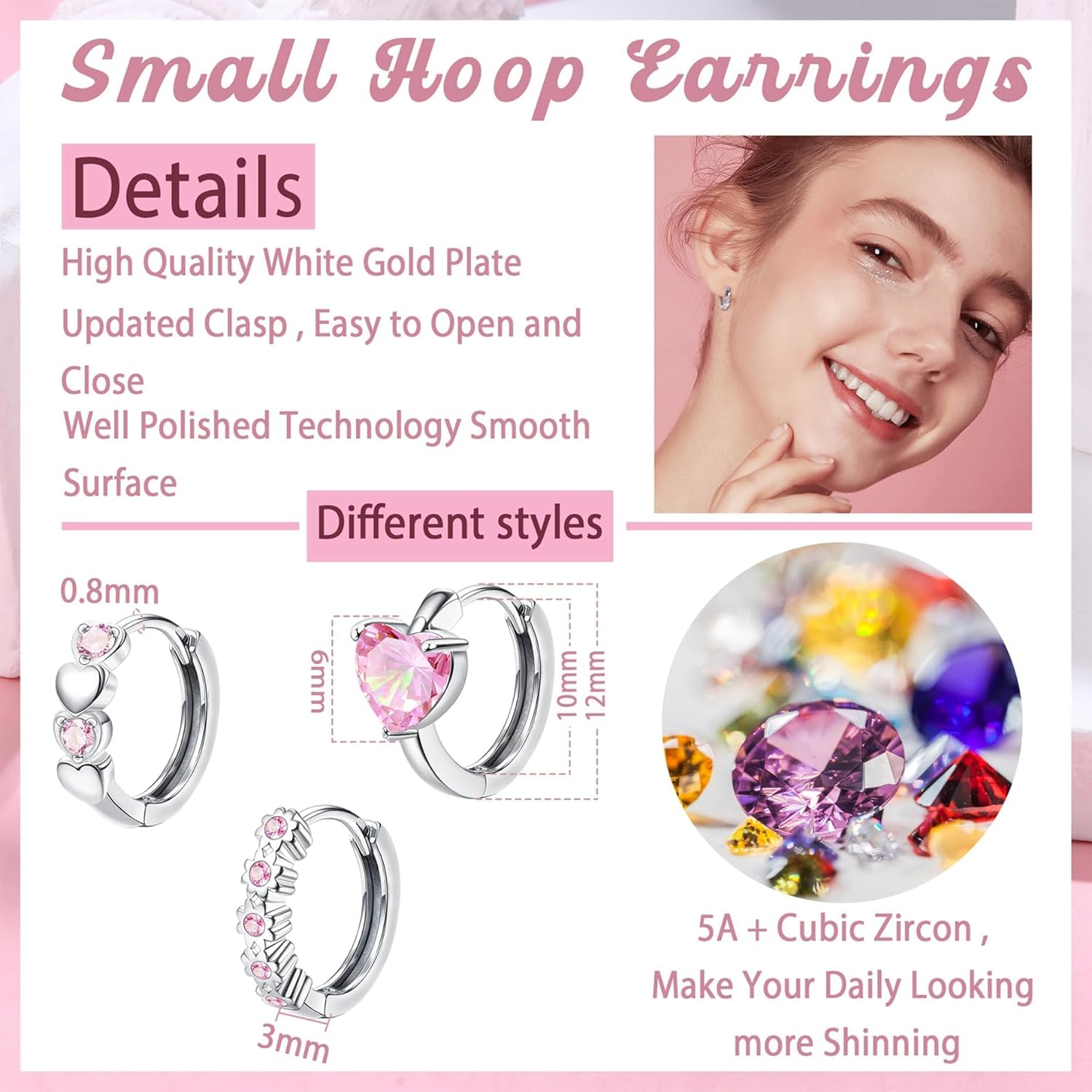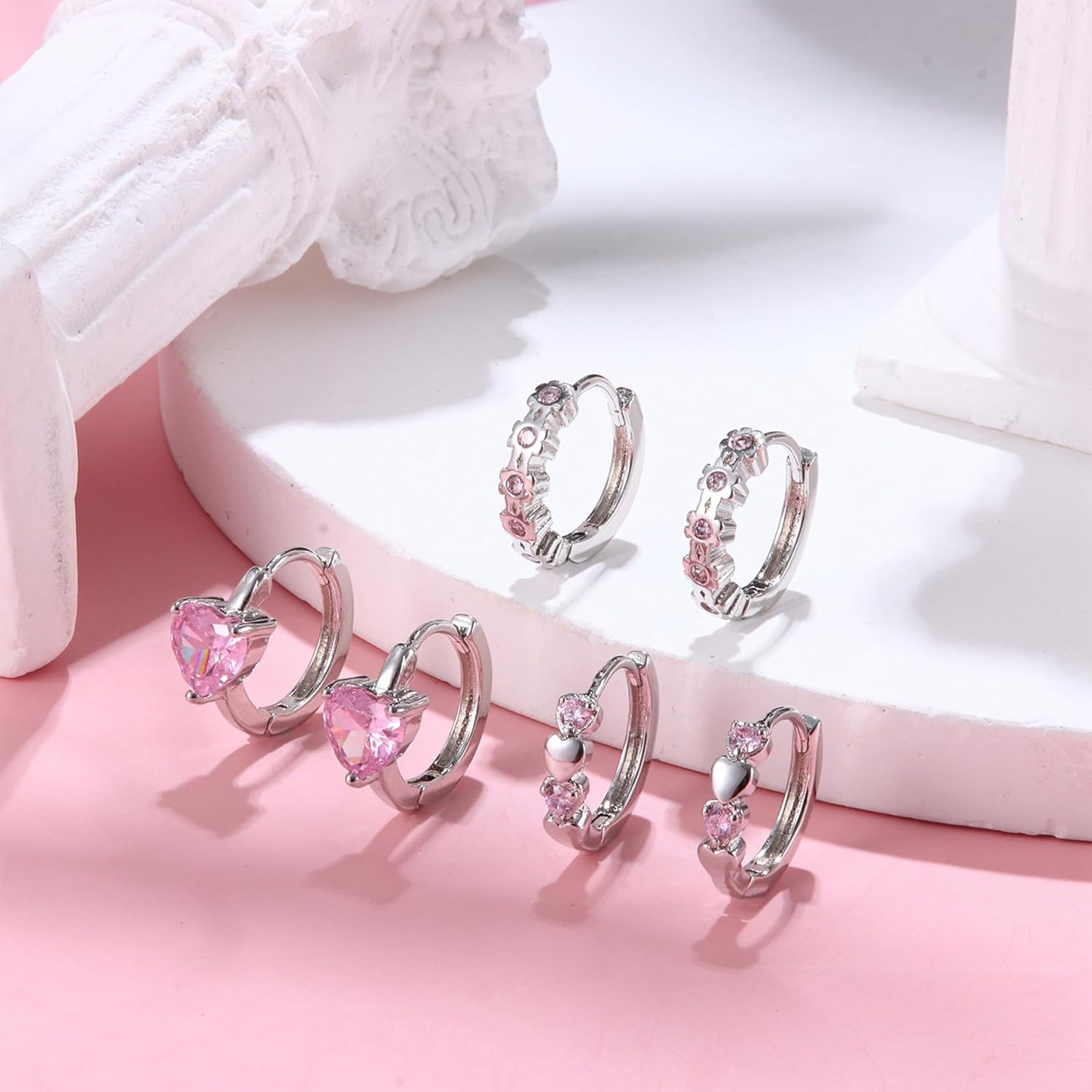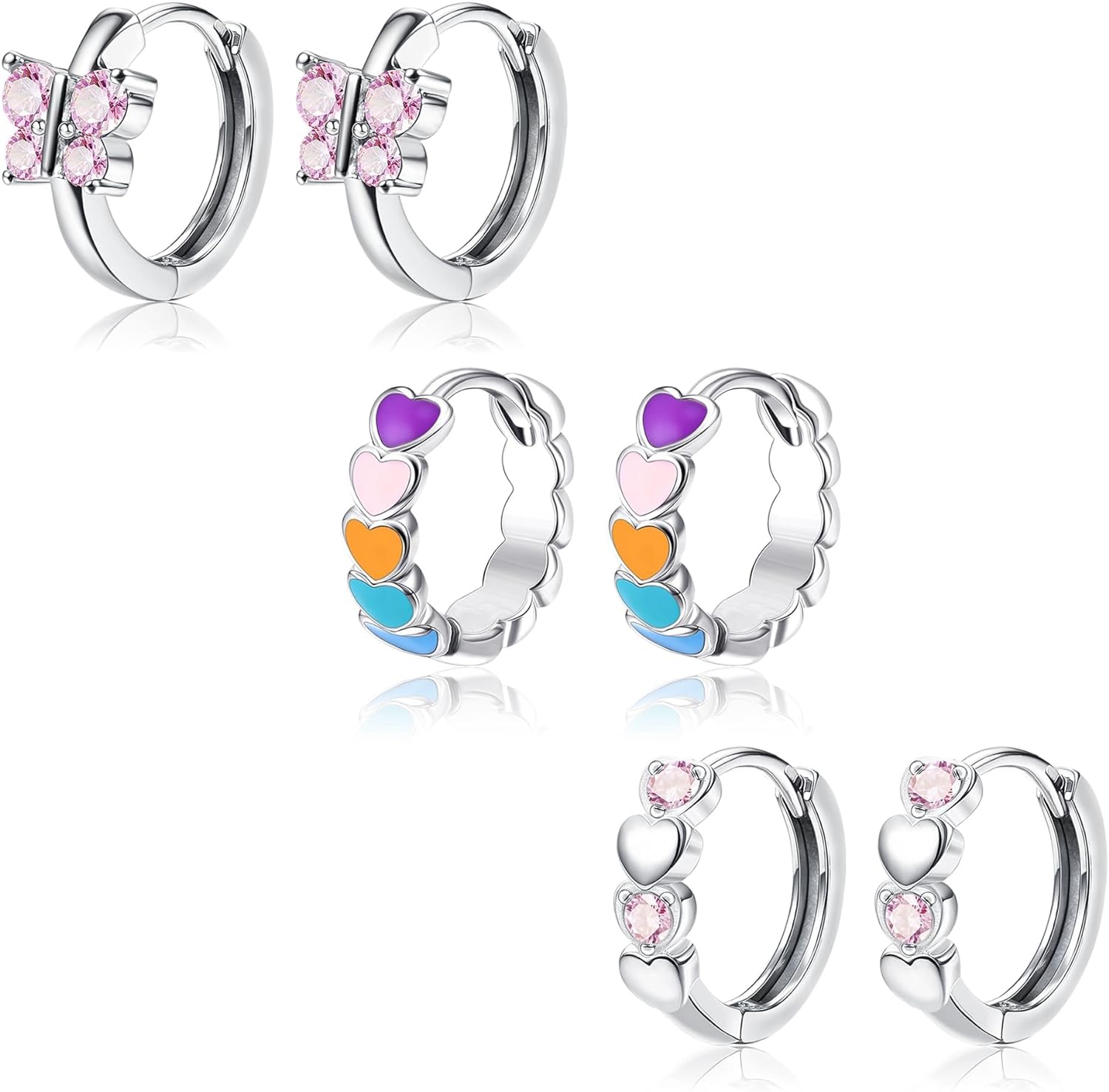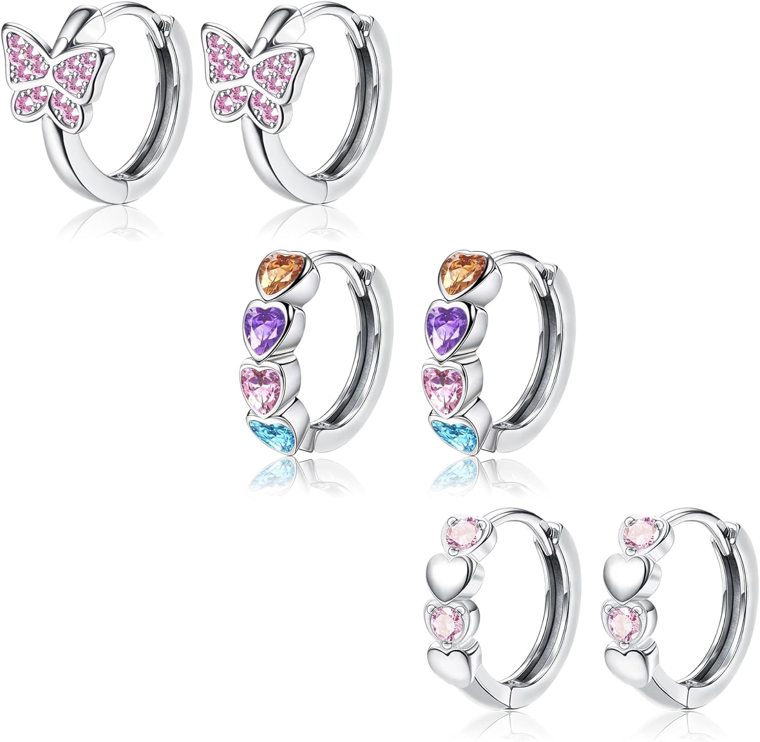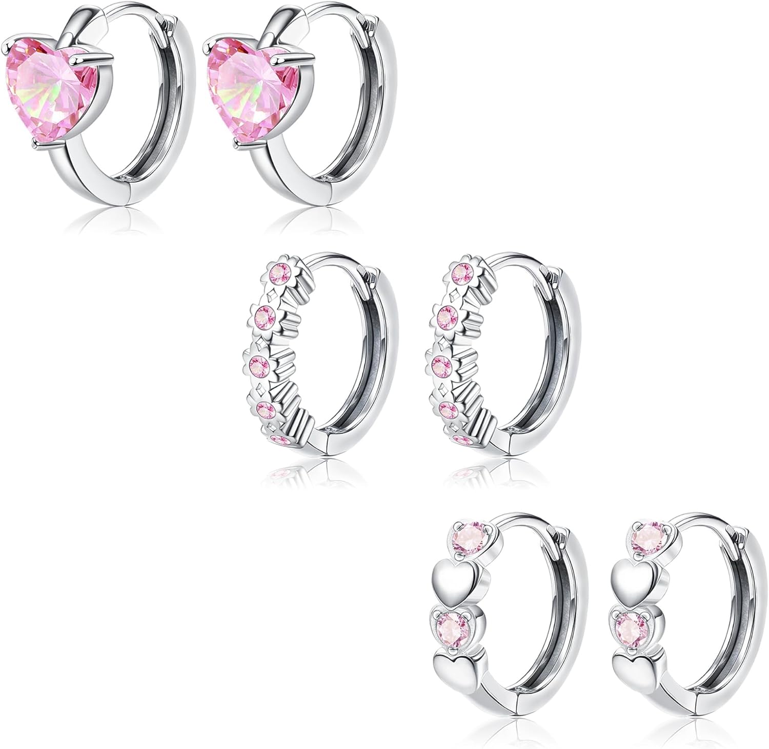- 🌸【Cute Hoops Earrings For Women】🌸You will receive 3 pairs of pretty delicate sterling silver hoop earrings for women girls,including pink heart hoops earrings, butterfly hoops earrings, flower hoops earrings and sparkling zirconia hoops earrings. Cute elegant design to make you the centre of your everyday life.