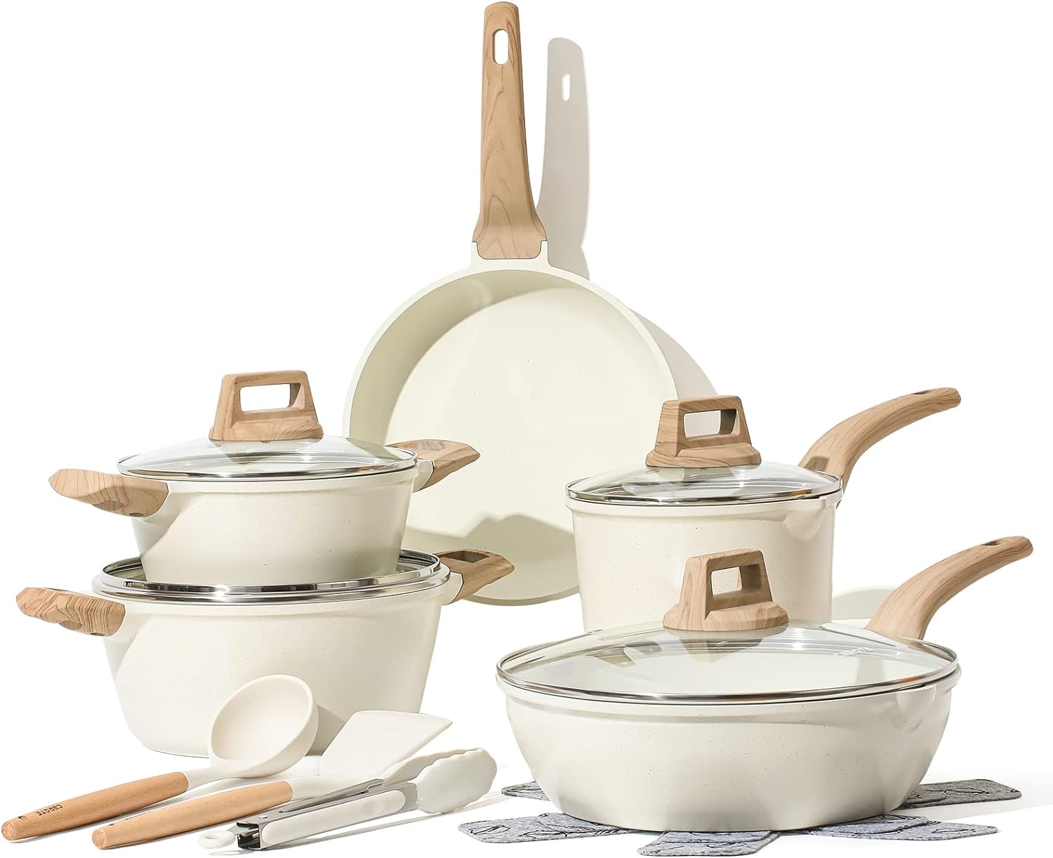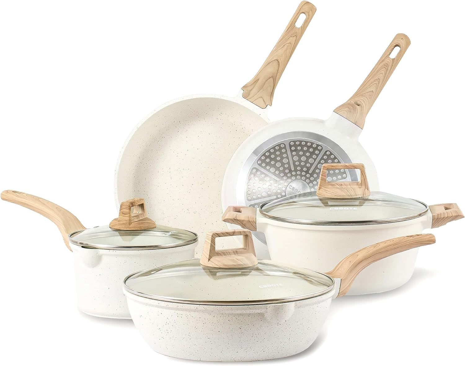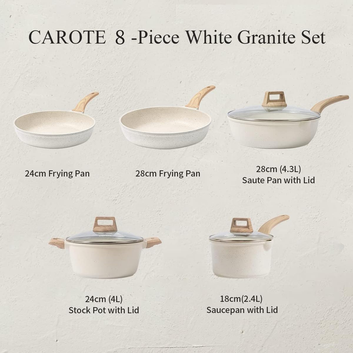CAROTE 8 Pcs Pots and Pans Set Nonstick, White Granite Induction Kitchen Cookware Sets, Non Stick Cooking Set