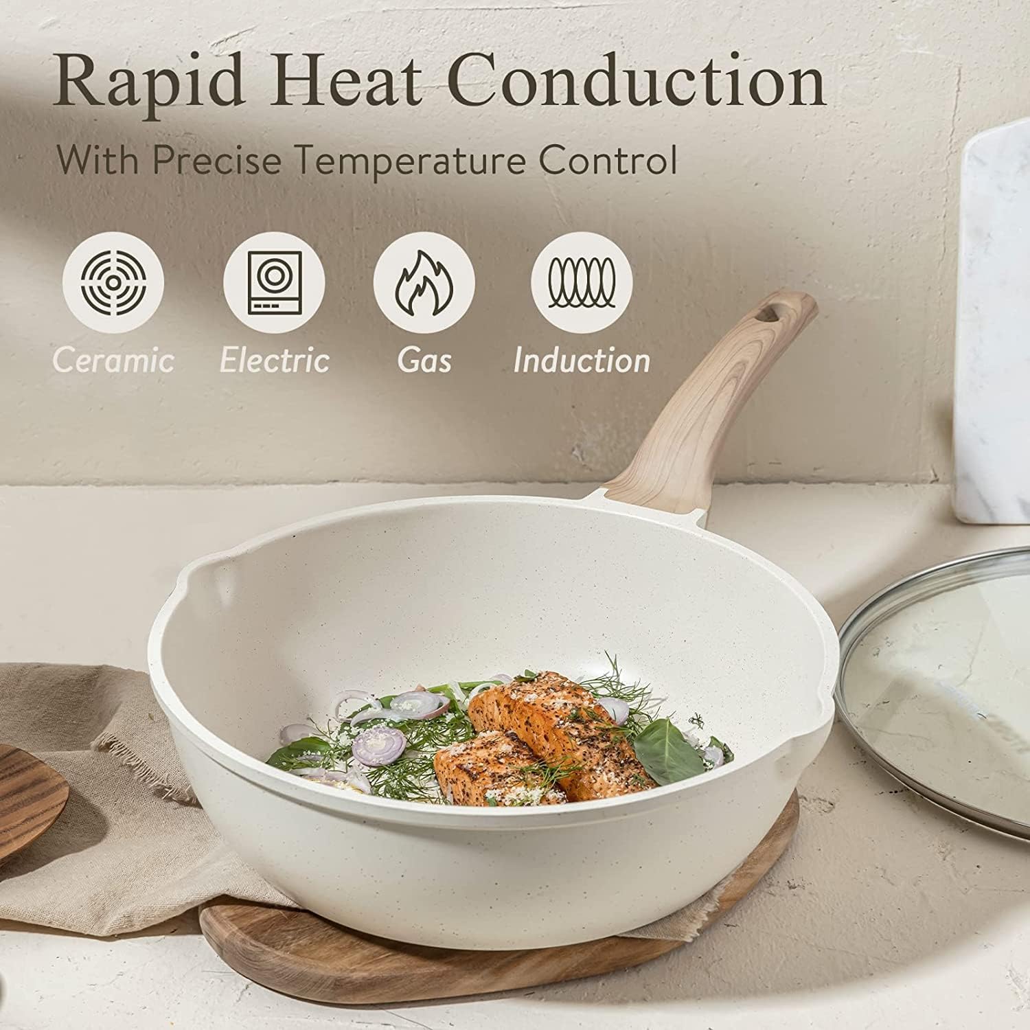 Granite Cookware Set- crafted with healthy raw materials free from PFOA and PFOS, ensuring safe cooking. Experience rapid and even heating for efficient meal prep. Made from safe natural granite raw material, CAROTE cookware set offers strength and durability. Elevate your culinary experience with our premium kitchen sets, designed to meet your cooking needs with precision and reliability.