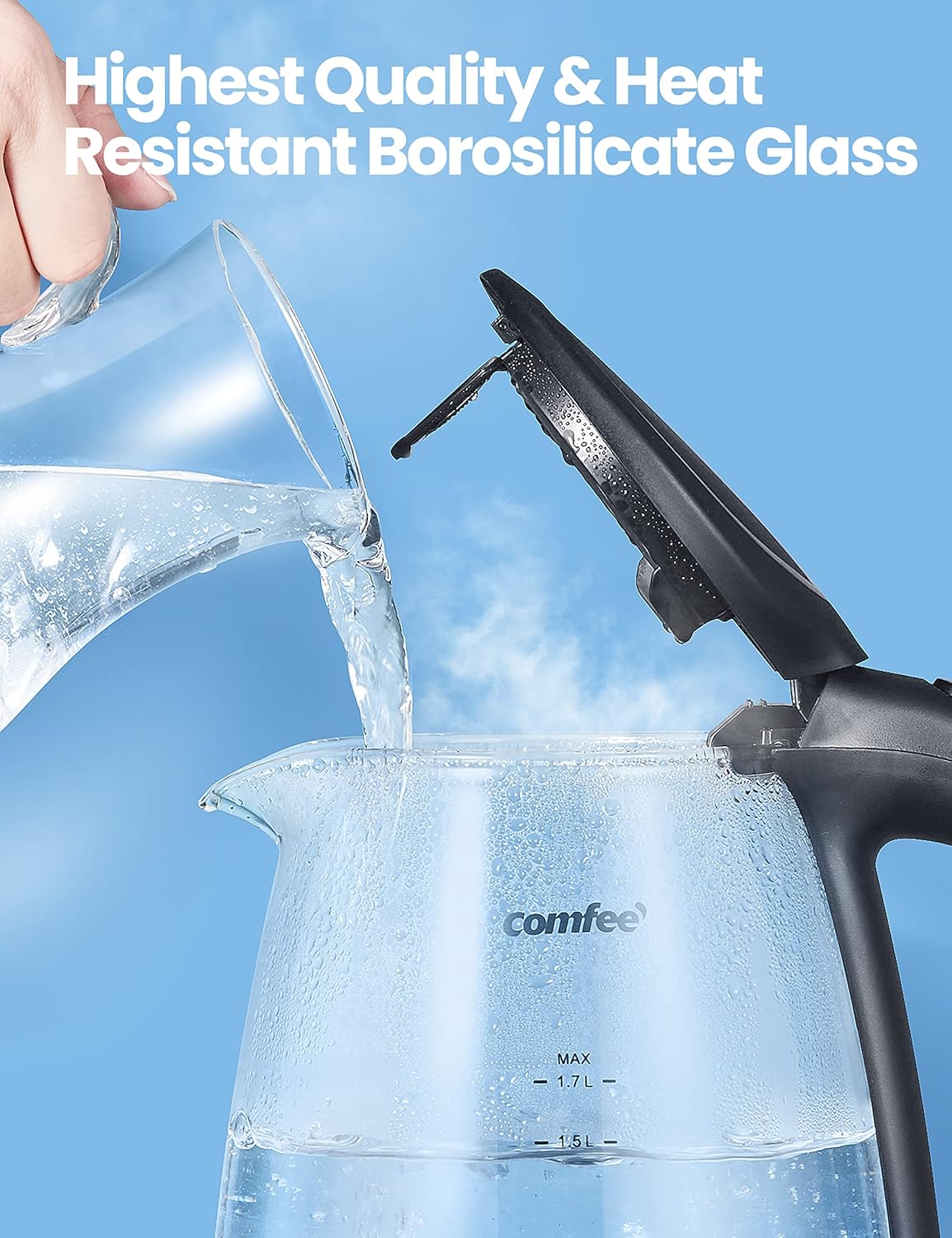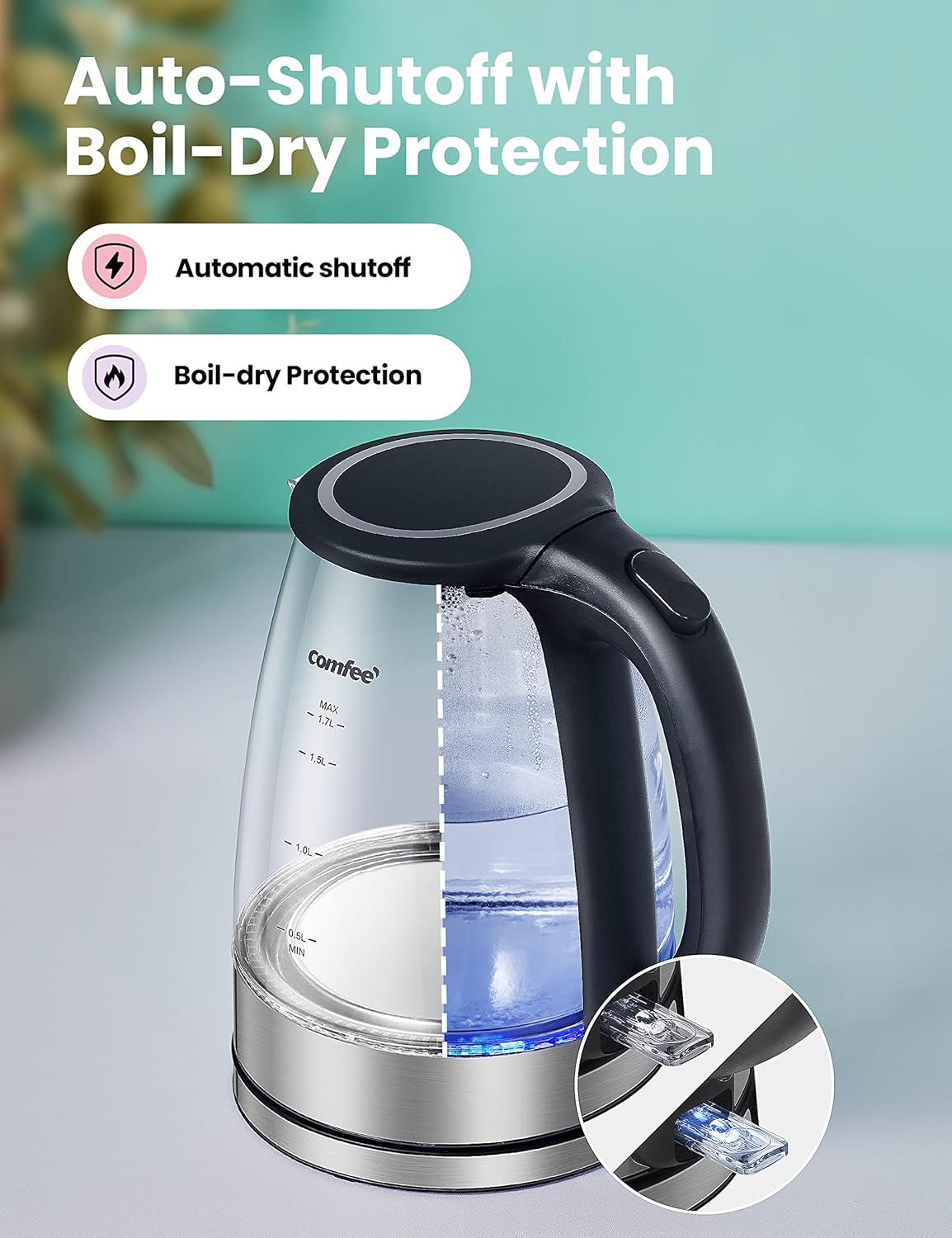 COMFEE' Glass Electric Tea Kettle & Hot Water Kettle Electric, 2200 W 1.7L Capacity Electric Kettle with LED Indicator, Fast Boil Auto Shut-Off and Boil-Dry Protection