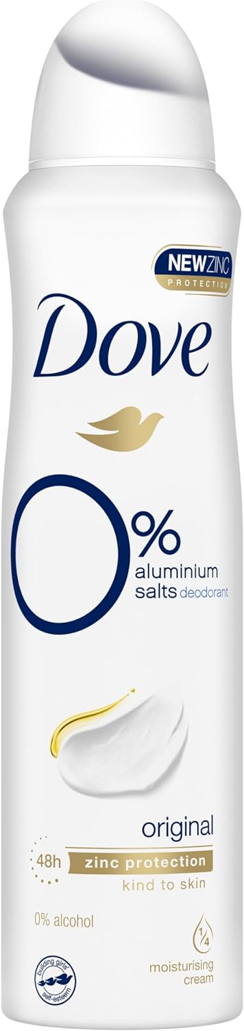 Dove 0% Original Antiperspirant Deodorant Spray provides up to 48 hour protection from sweat and odor with a skin-friendly zinc formula that uses no aluminum salts