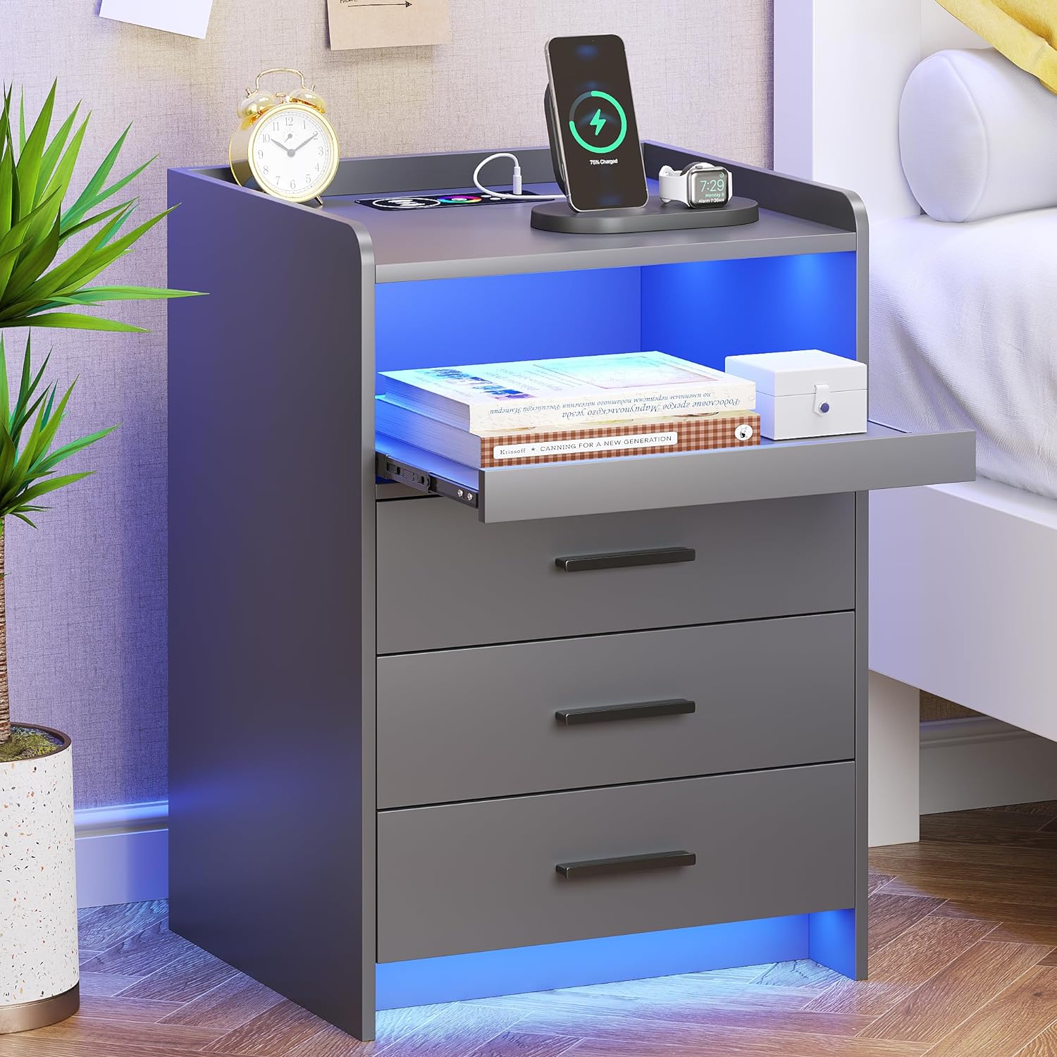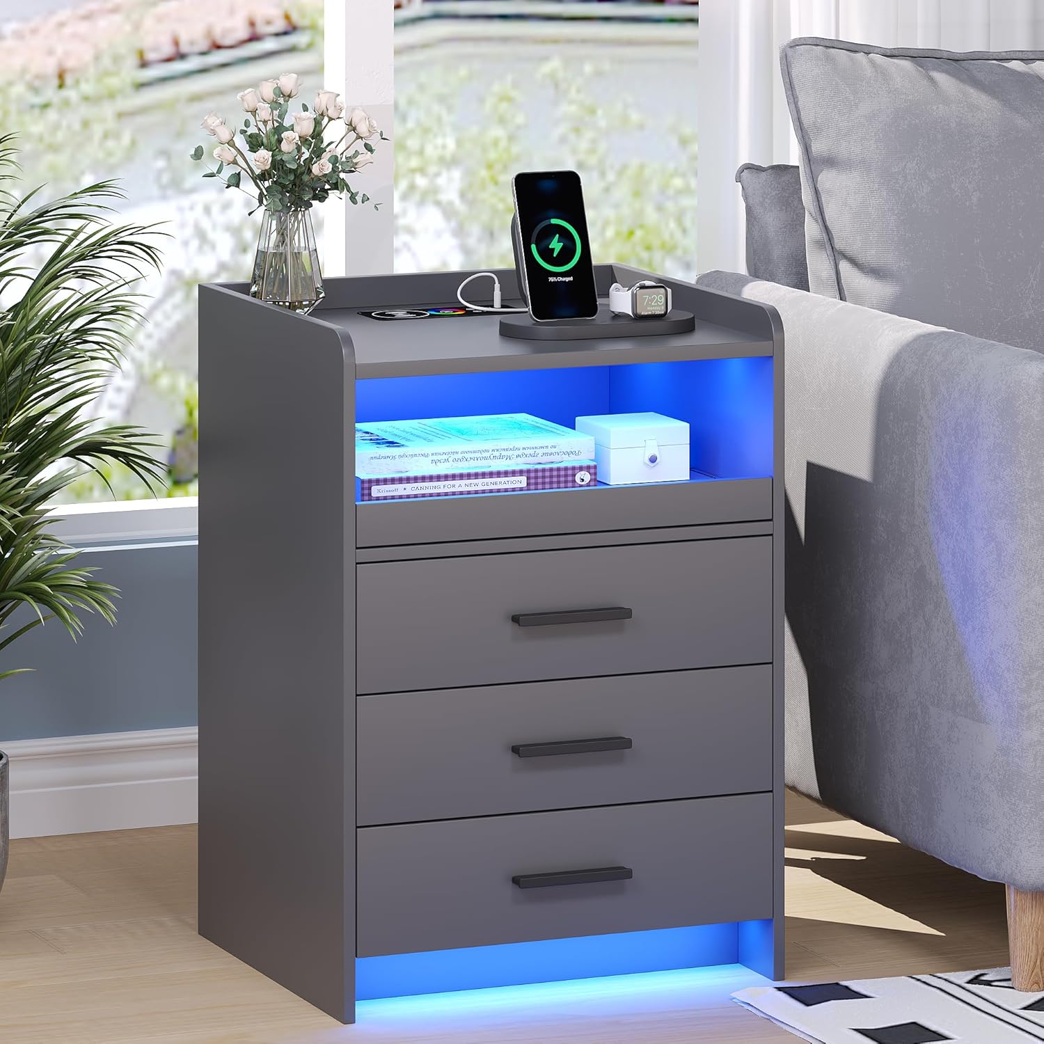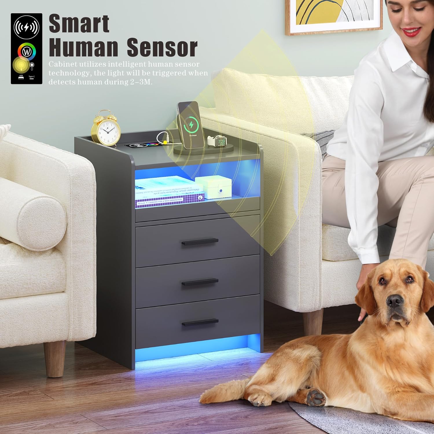 Dystler Nightstand with Charging Station, Bedside Table with RGB Light & Human Sensor Design, 3 Drawers LED Modern End Side Table for Bedroom Livingroom Office, Grey