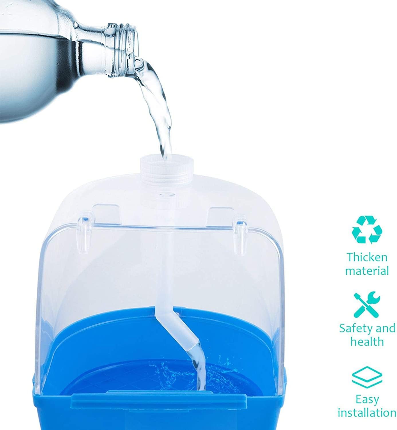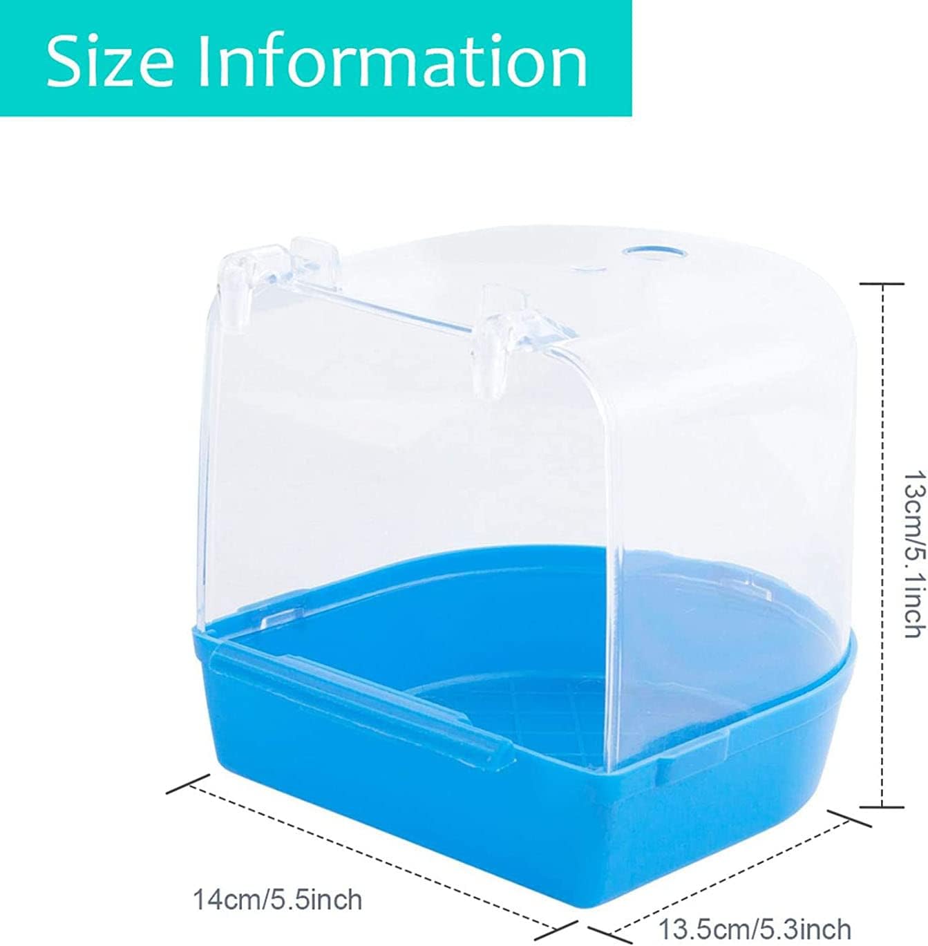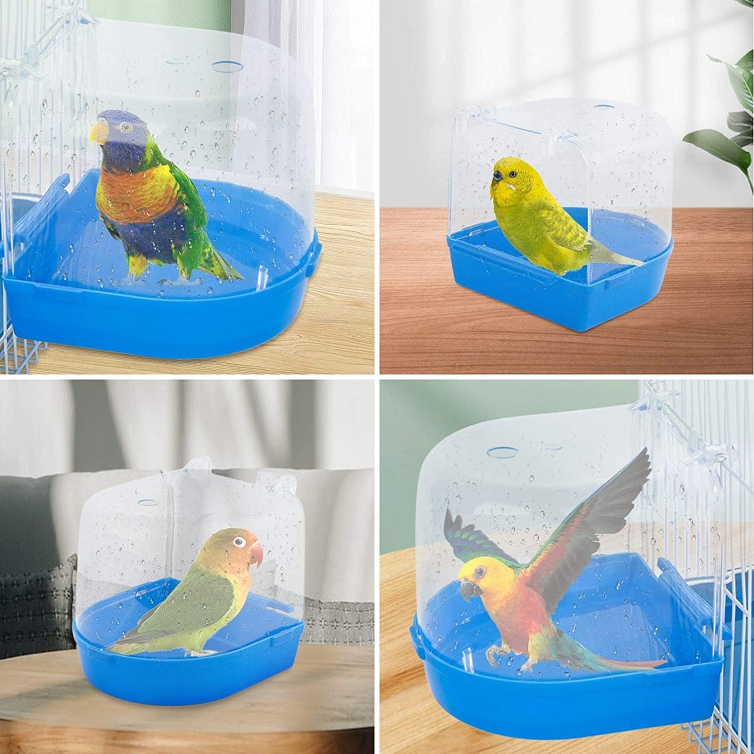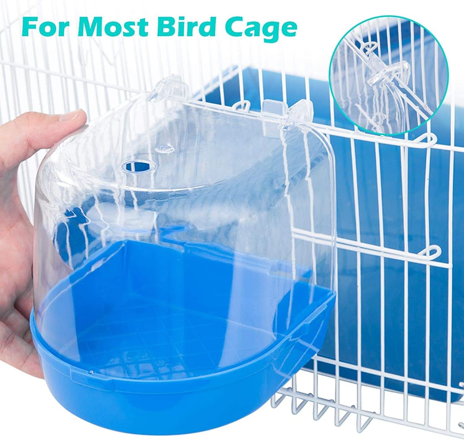 - Simply Installation:Connection the clear plastic covering with the Blue bottom,and through the durable clips hang the parakeet bath caged box in your cage(not the ROUND OR CURVED WALL CAGES) .