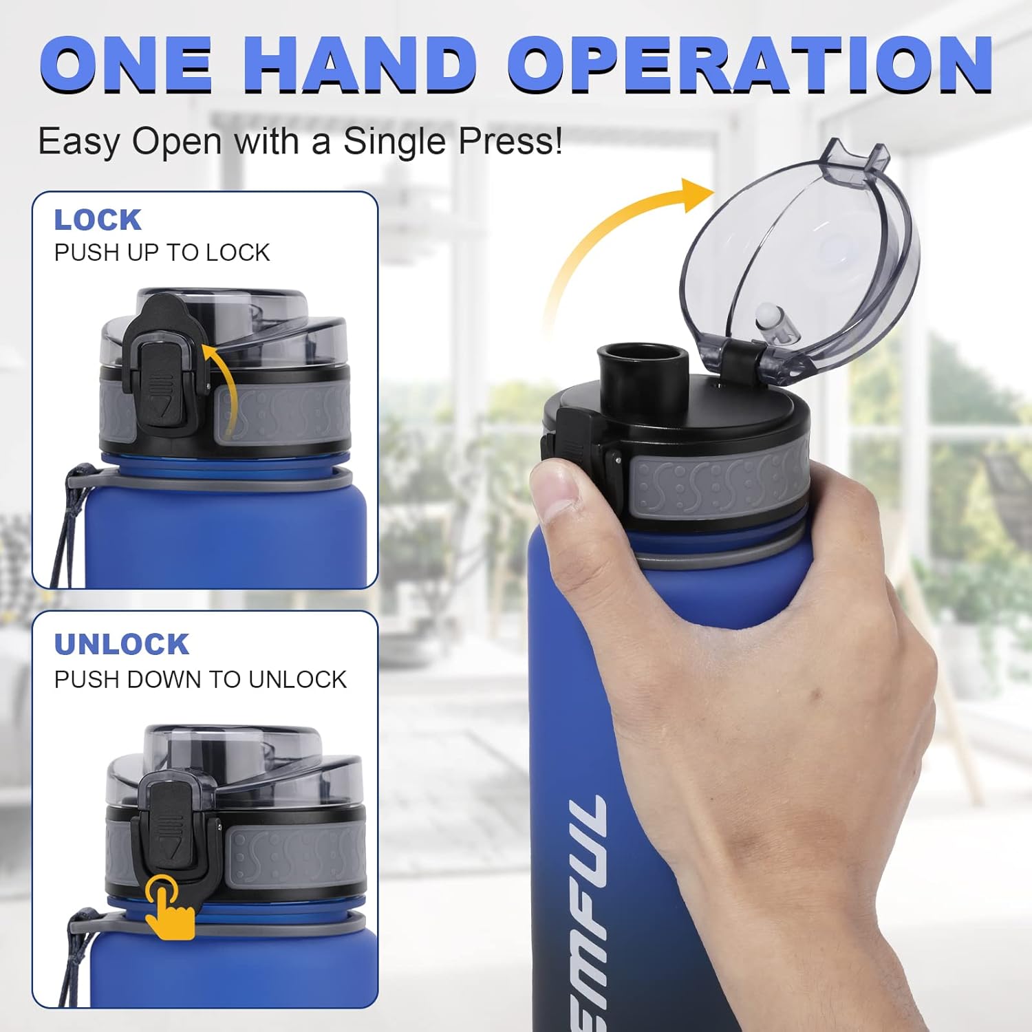 - FUNCTIONAL PATENTED DESIGN - The patented flip top lid is designed with a secure lock, making it dust and leak proof. Simply open with one hand by clicking the button. Feature with a silicone straw which allows you to enjoy spill-proof sipping also could remove it if you want to drink directly. With a tough carry-strap and a special reflective frosted casing that reacts uniquely to your environment.The mouth is wide enough to fit ice cubes, also easy to clean