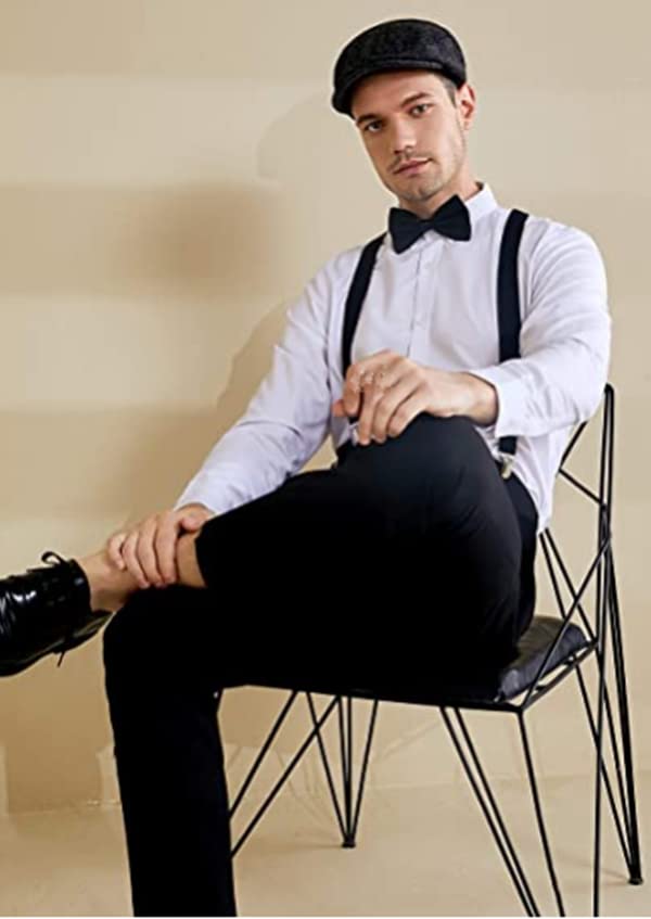 - Each 1920s mens accessories set includes: 1*Mens Manhattan Hat, 1*Y-Back Elastic Suspenders, 1*Pre Tied Bowtie,1* gangster tie,2* gangster armbands, 1*Vintage Pocket Watch. What you see is what you get.