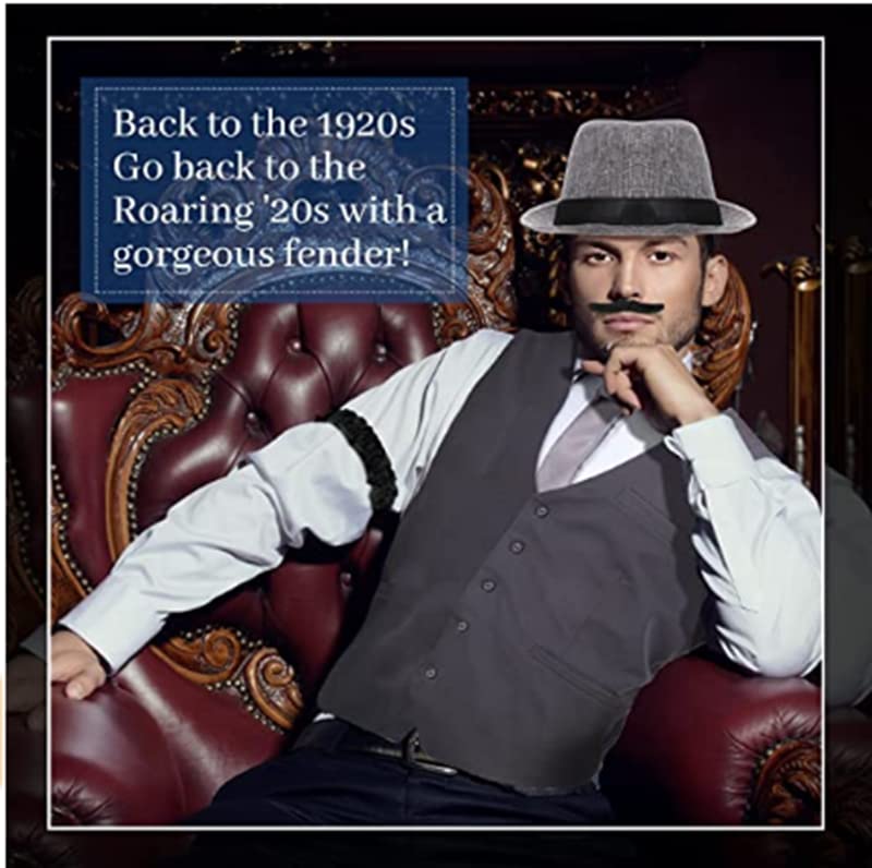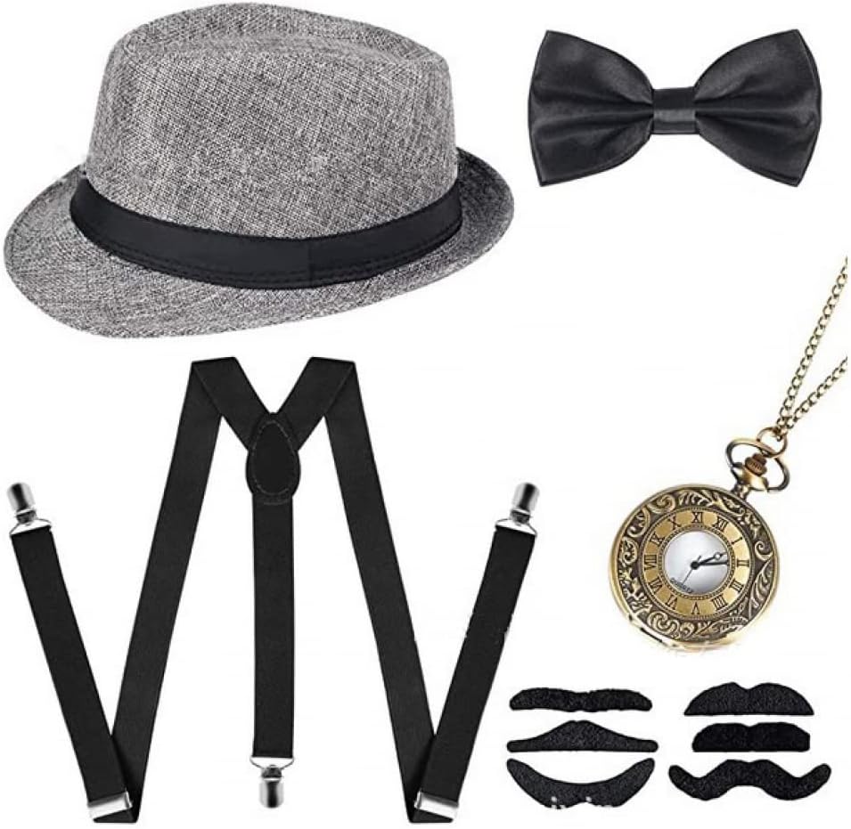 Each 1920s mens accessories set includes: 1*Mens Panama Hat. 1*Y-Back Elastic Suspenders. 1*Pre Tied Bowtie. 6*false beards. 1*Vintage Pocket Watch. A set of great match to prom, flapper costume, roaring 20s party, the Great Gatsby themed party, art deco party and all other vintage style occasions.