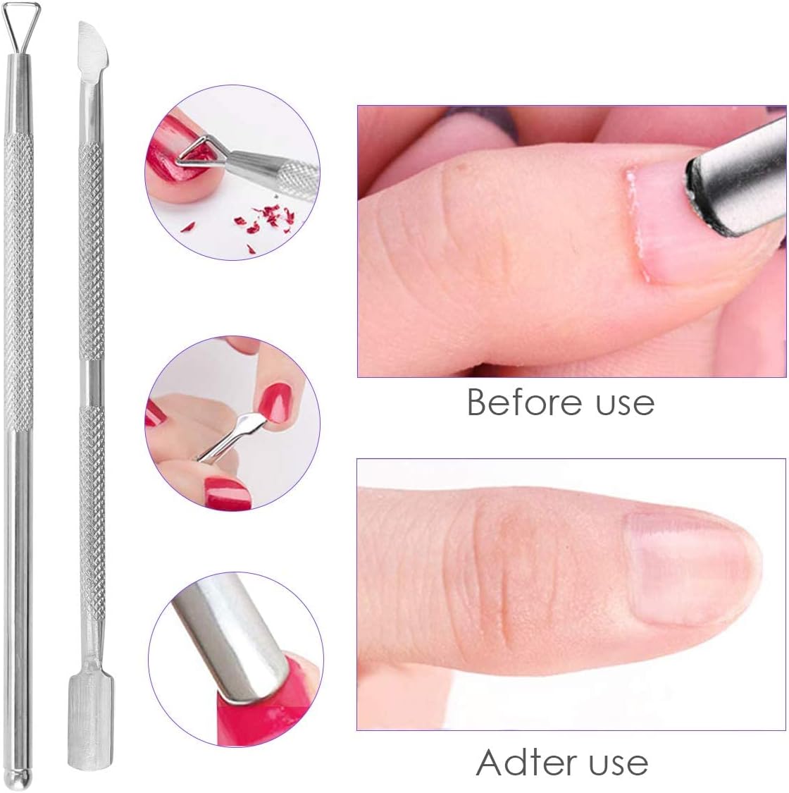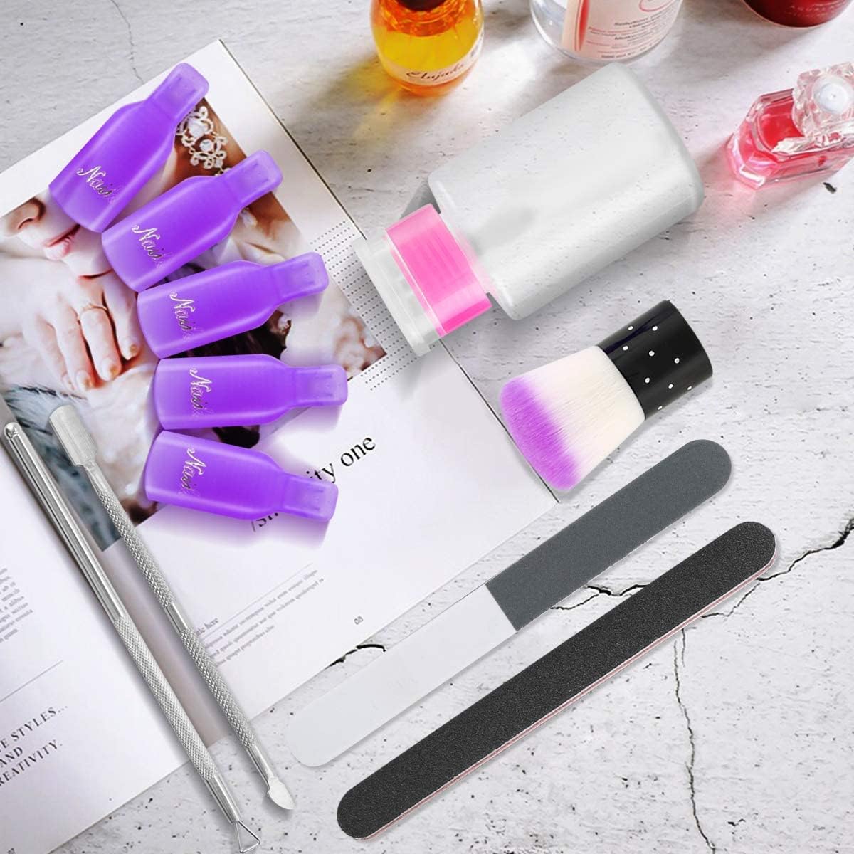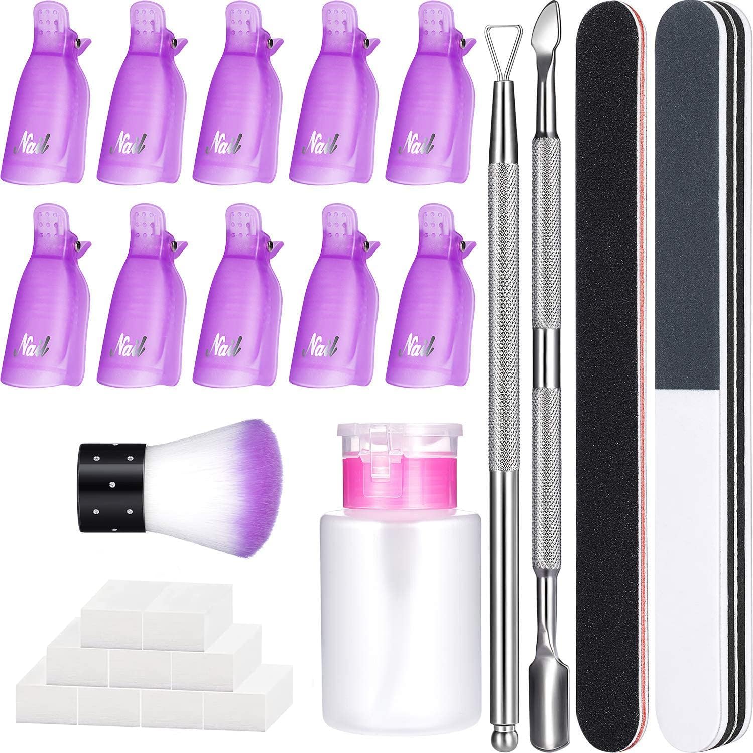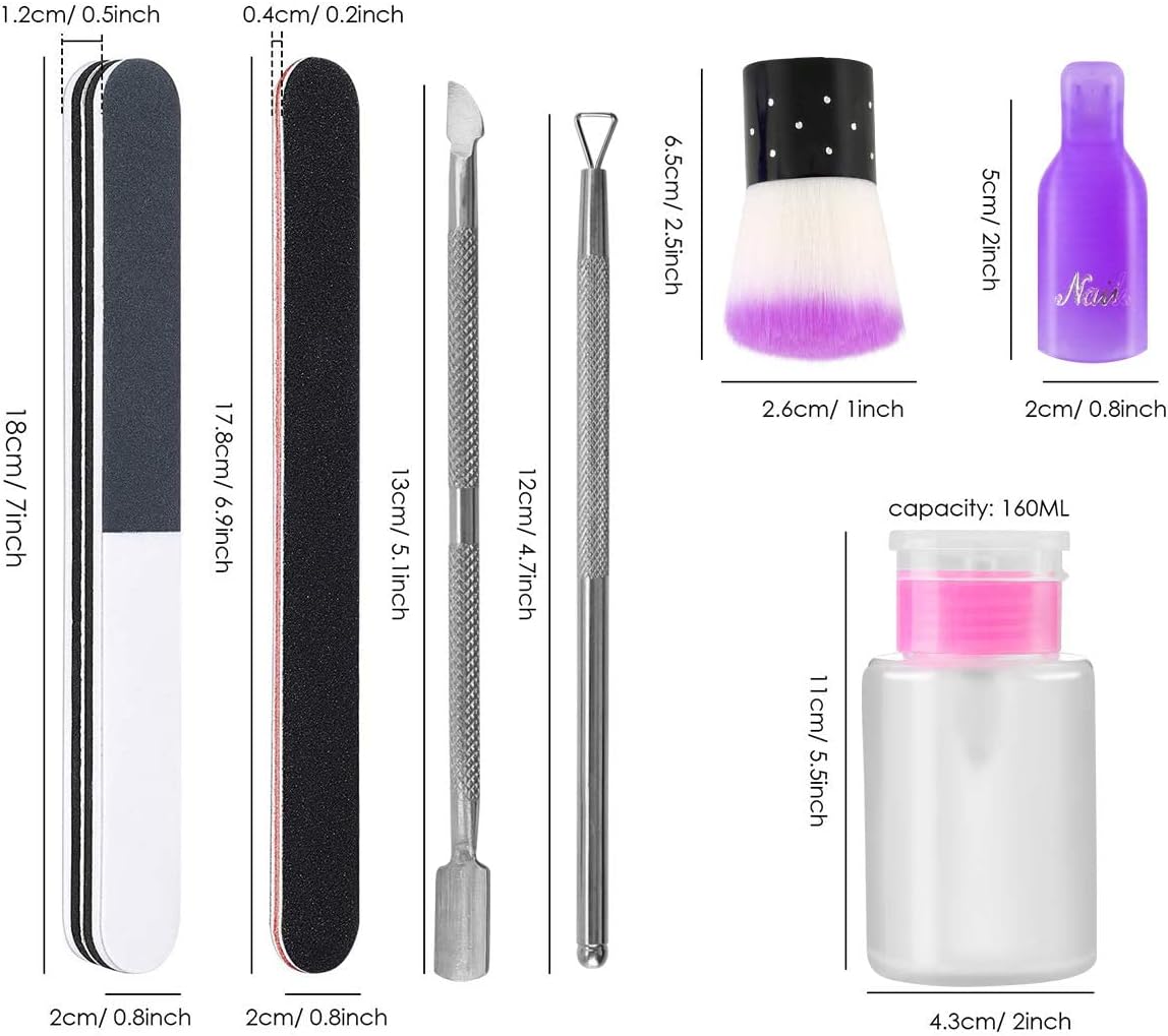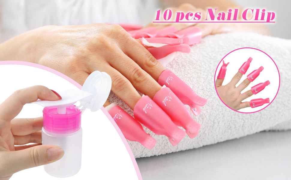 【Suitable for Removing Nail Polish At Home】: No need to go to nail salon, These cute gel nails removal tools include everything you need - remove gel polish-coarse sand file, nail brush, Wipe Cotton Pads, nail clips, push down pump dispenser, cuticle nail pusher and Scraper.