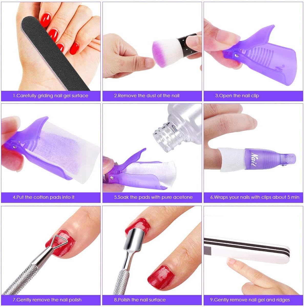【5 Steps to Remove Nail Polish】: just 5 steps, grinding, wrapping, clips, scratches, polish. Includes the tools needed for each step, easily remove gel polish without need for a salon visit. Just copy it with your own hands. Perfect to take off all brand of nails myself at home!