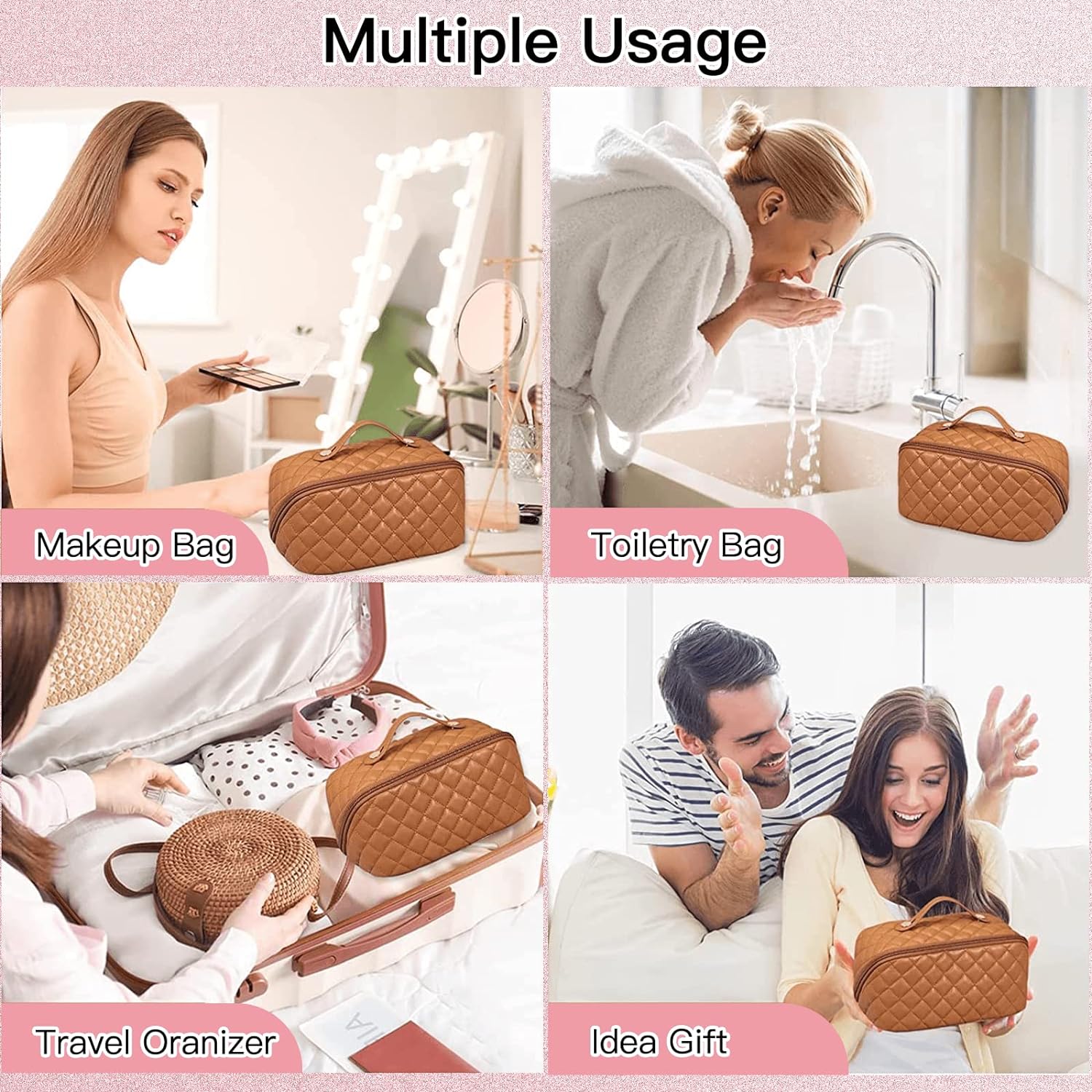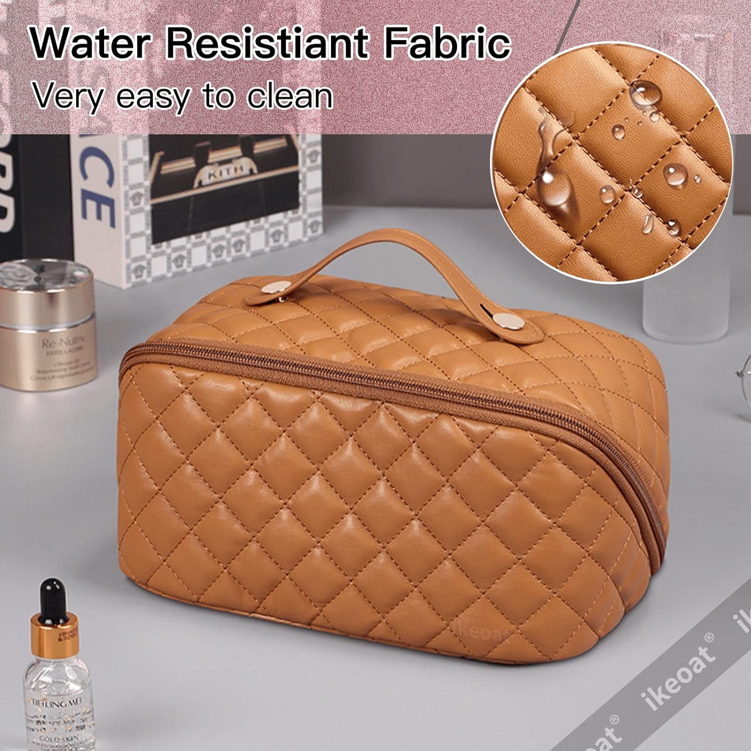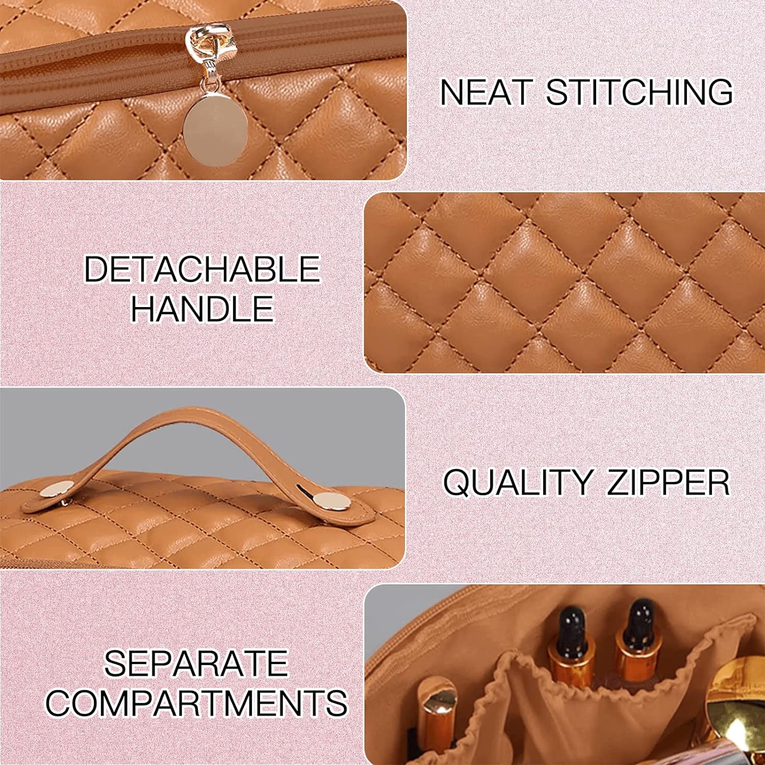 ikeoat Travel Cosmetic Bag - Large Capacity Makeup Bag With Handle and Divider Flat Lay Cosmetic Toiletry Bag for Women, Brown