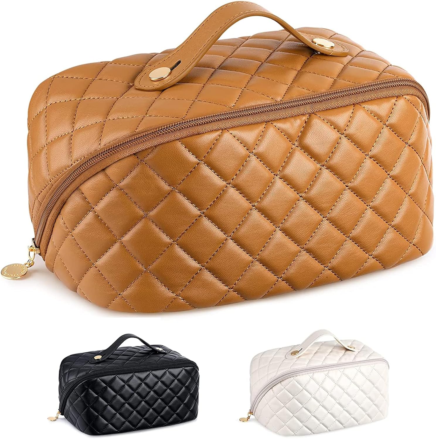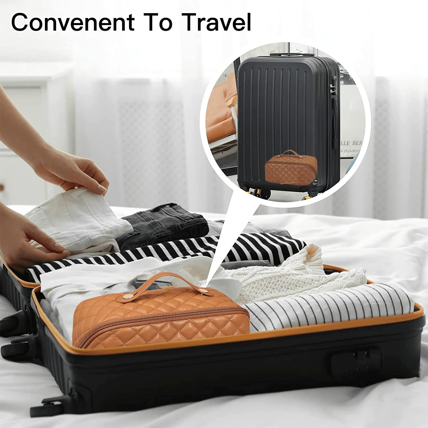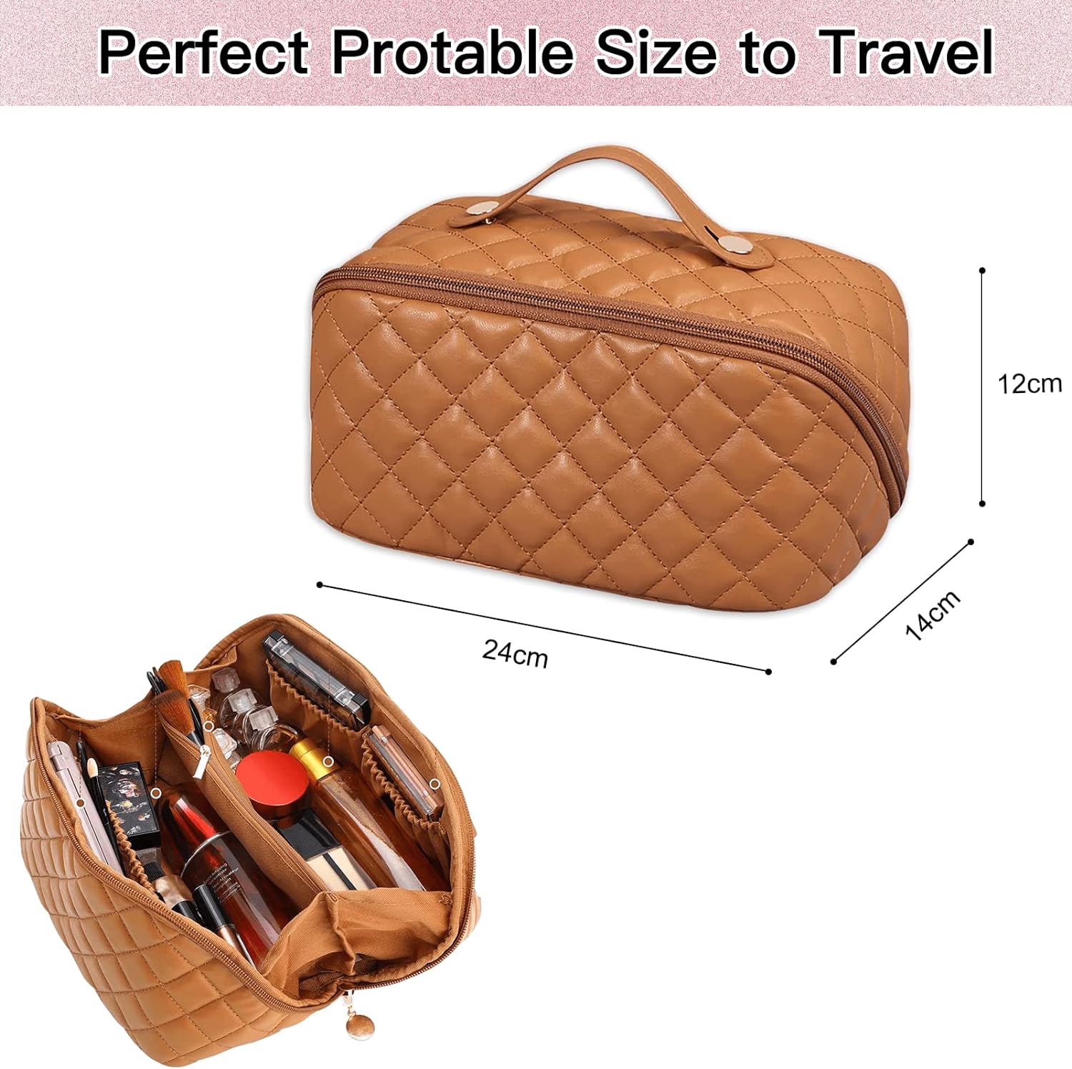 ikeoat Travel Cosmetic Bag - Large Capacity Makeup Bag With Handle and Divider Flat Lay Cosmetic Toiletry Bag for Women, Brown