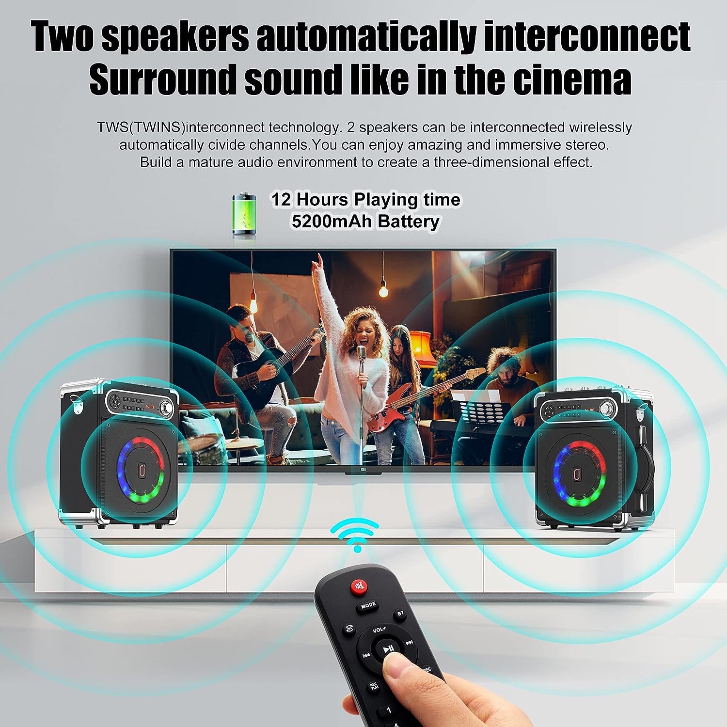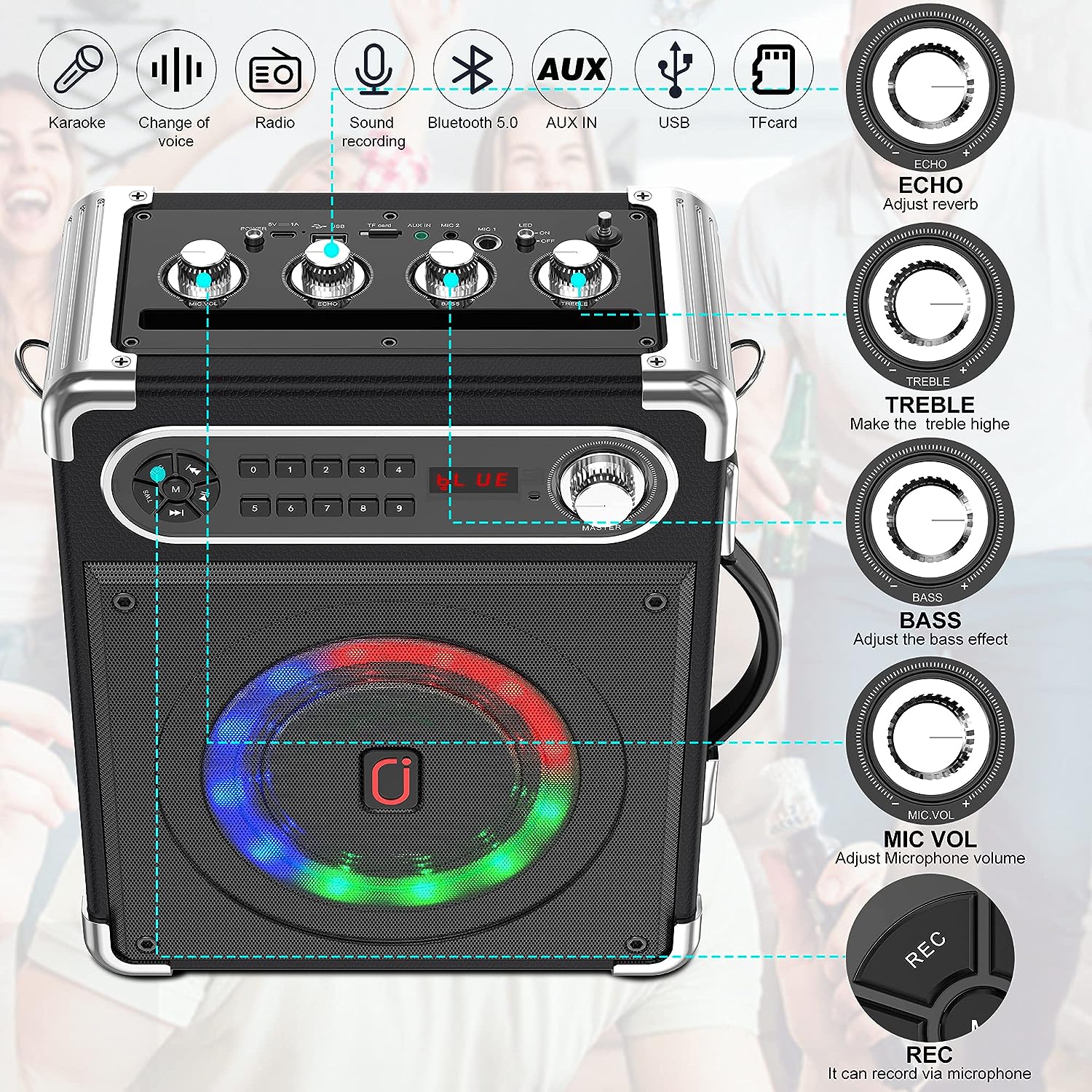 JYX Karaoke Machine with Two Wireless Microphones, Portable Bluetooth Speaker with Bass/Treble Adjustment, PA System with Remote Control, LED Lights,Supports TF Card/USB, AUX IN, FM, REC,TWS for Party