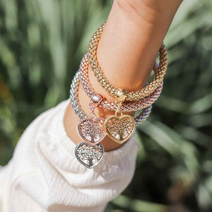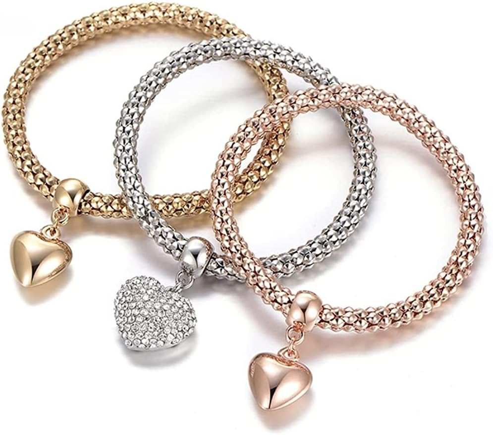 KASTWAVE Multilayer Bracelets, KASTWAVE Crystal Charms Multilayer Bracelets, 3PCS Gold/Silver/Rose Gold Corn Chain Bracelet for Women, Tree of Life Heart Shaped Stretch Bracelet, One Size