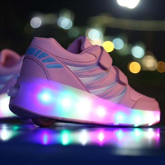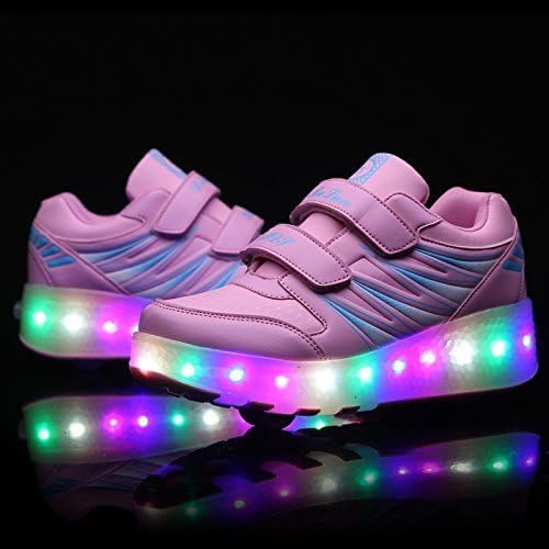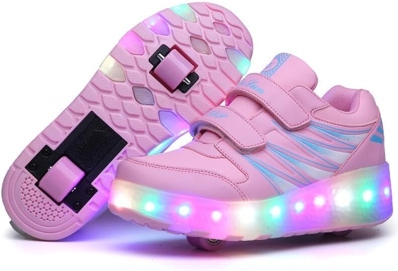 - ExquisiteDesign and Comfortable Sole: Double Wheels Roller Shoes/ Single Wheel Roller Shoe/ Hold the button behind shoes to shrink the rear wheel and remove the front wheel, become an LED Flat Sneaker. Put on the sneakers, do sports and leisure activities, enjoy entertainment and skill growth with kids.