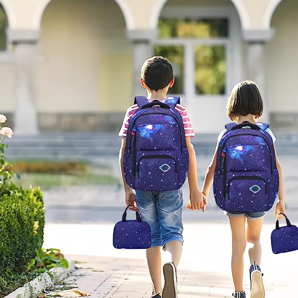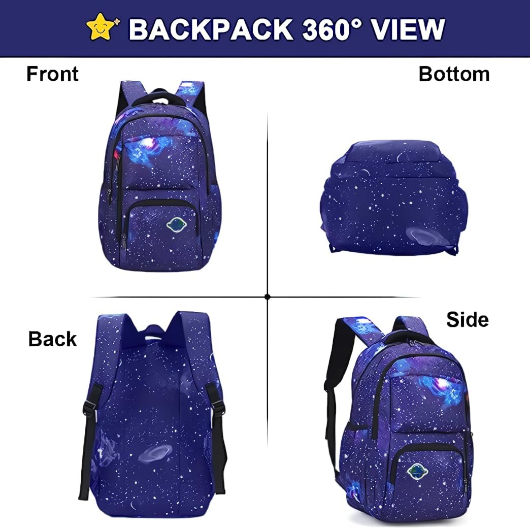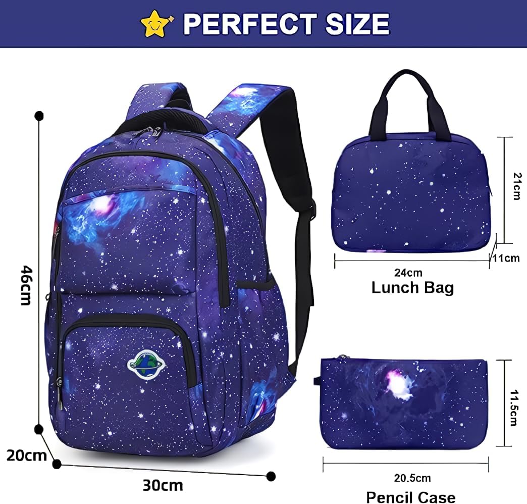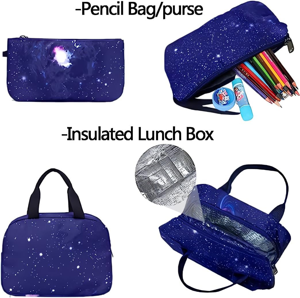 • School bookbag with Lunch Box: The kids school bag set with lunch tote, that is big enough for your lunch box, fruit, a cup of yogurt, salad or a bottle of drink. The Galaxy Printed Lightweight Knapsack has a pencil bag with special design and big enough for pencils, keys and other small school essentials. Our bookbag for school teen can be used as girls or boys school bag, kids backpack, laptop backpack and casual travel daypack.