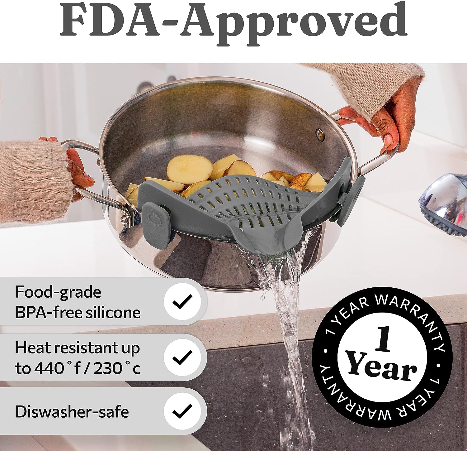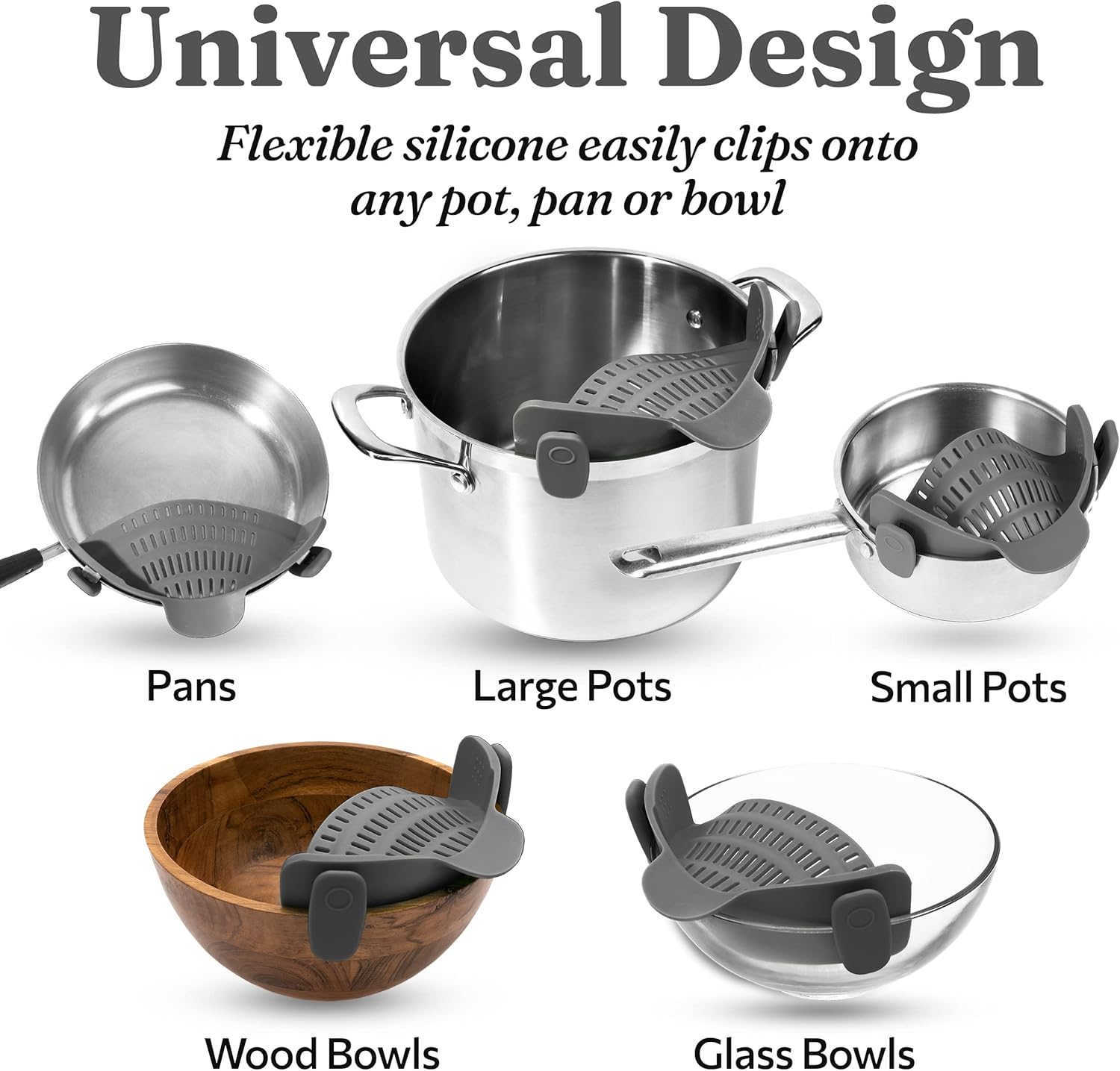Kitchen Gizmo Snap N Strain Pot Strainer and Pasta Strainer - Adjustable Silicone Clip On Strainer for Pots, Pans, and Bowls - Gray