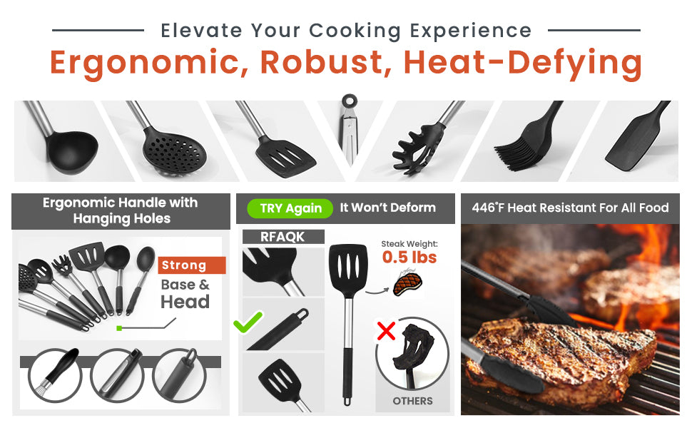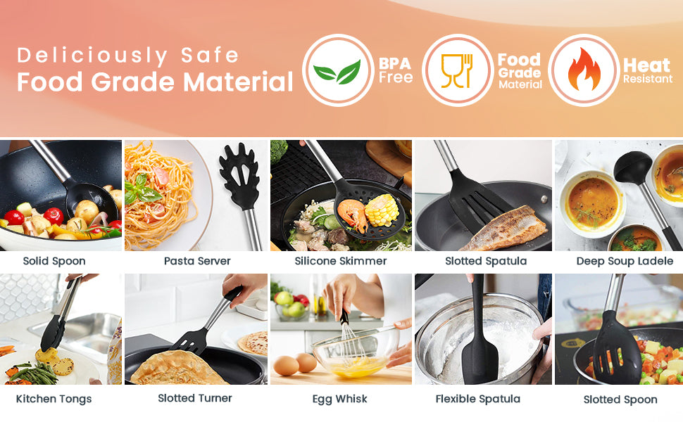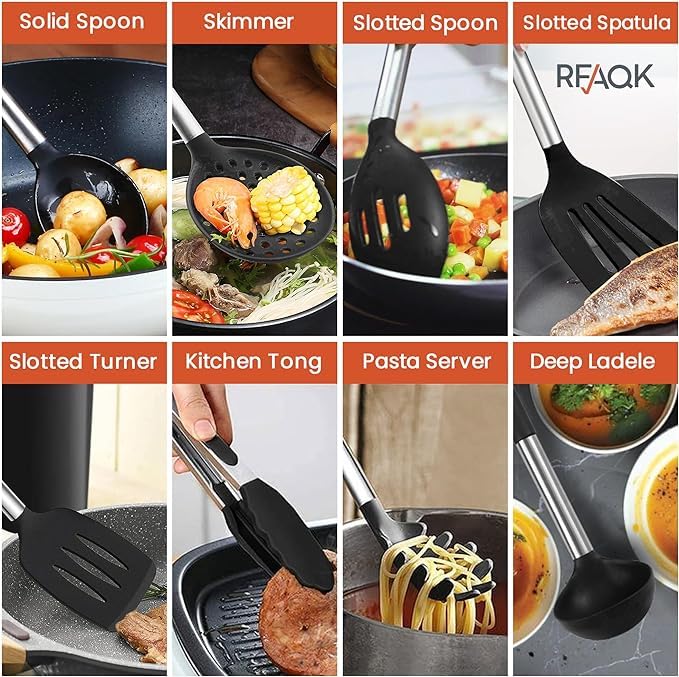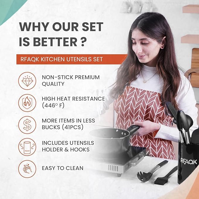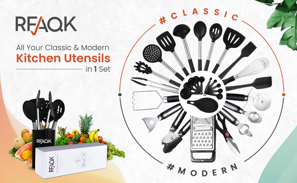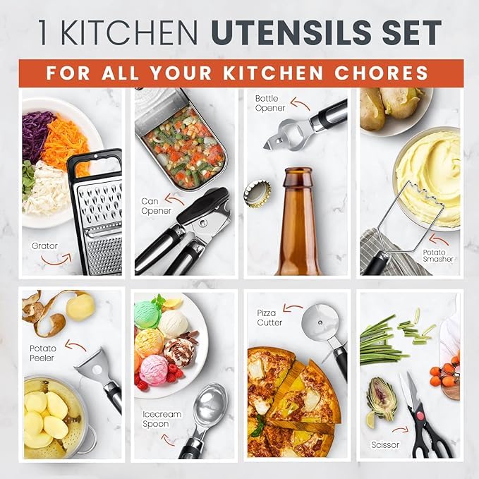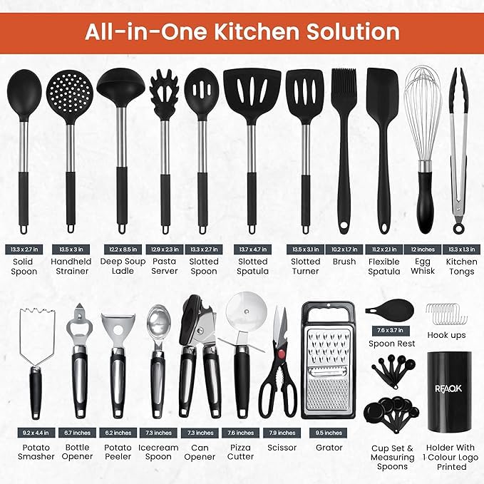 Kitchen Utensils Set with Holder, 40PCs Silicone Cooking Utensils Set for Nonstick Cookware,Kitchen Gadgets includes Can Opener,Potato smasher & Peeler,Tongs,spatulas,Pizza cutter & Much more (Black)