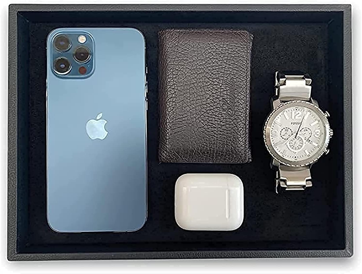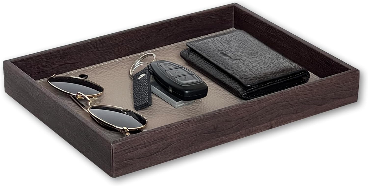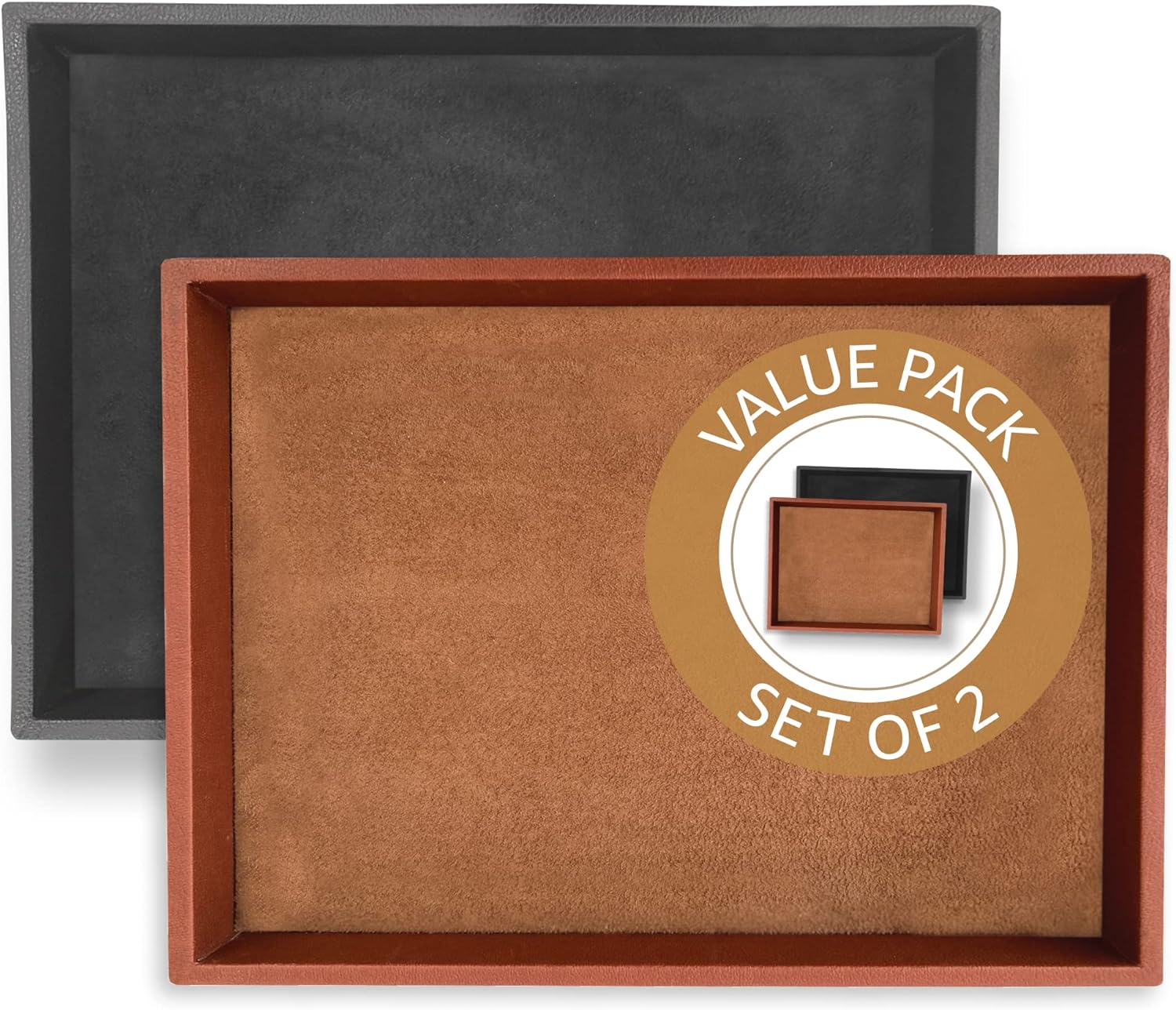 CLASSIC DESIGN – with superior faux leather on the outside and plush velvet on the inside this valet tray organizer will keep your items easily accessible while sitting neatly on your desk, bedside, dresser or nightstand.