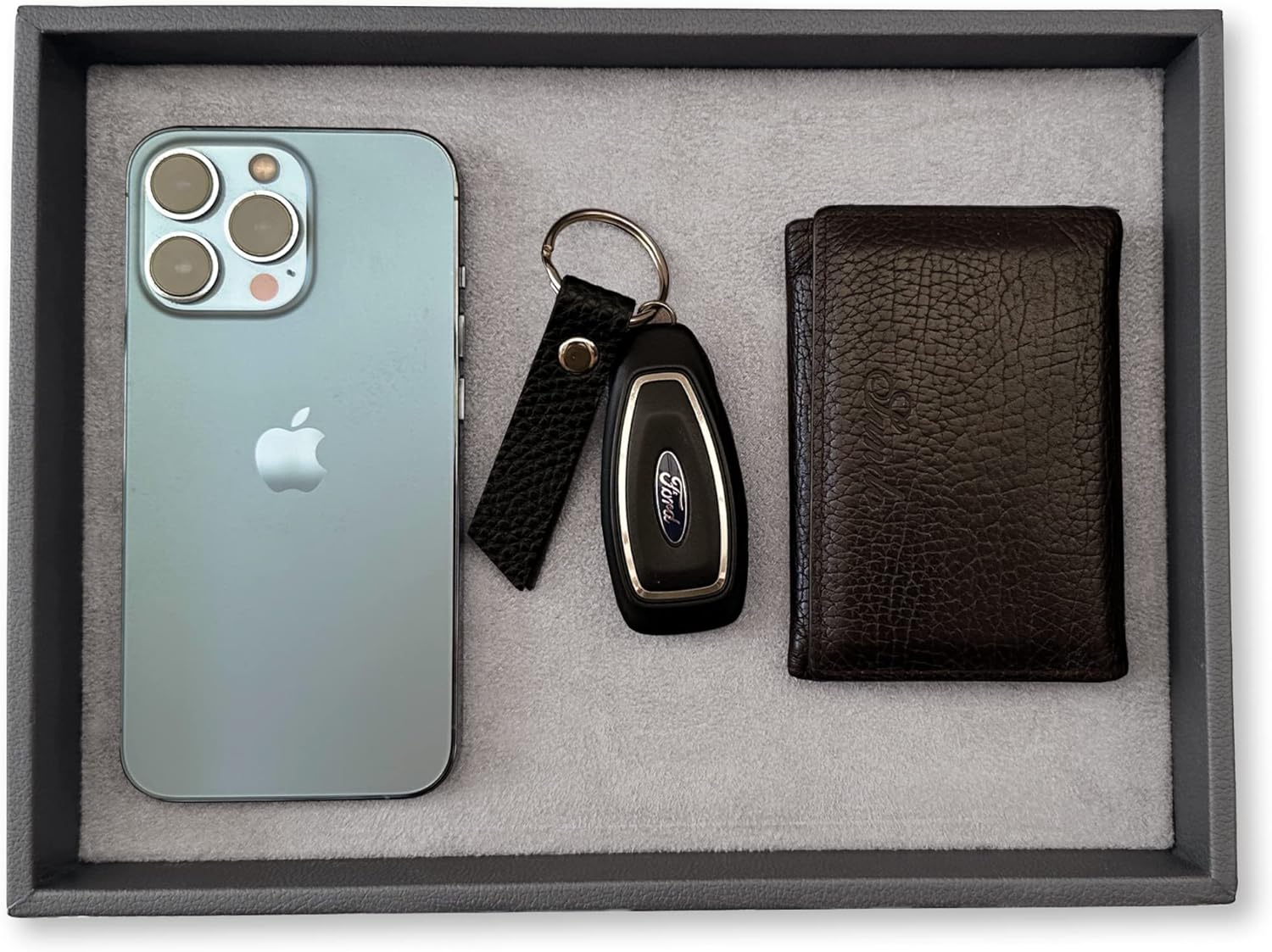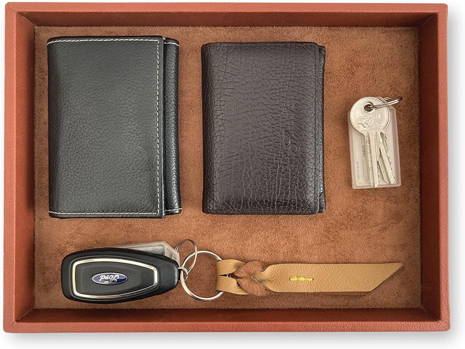 MULTIPURPOSE – use this leather valet tray as a key organizer, desk tray or even tray for remotes. Store your keys, watch, mobile phone, earphones, remotes, jewelry and any loose change conveniently in this leather tray.
