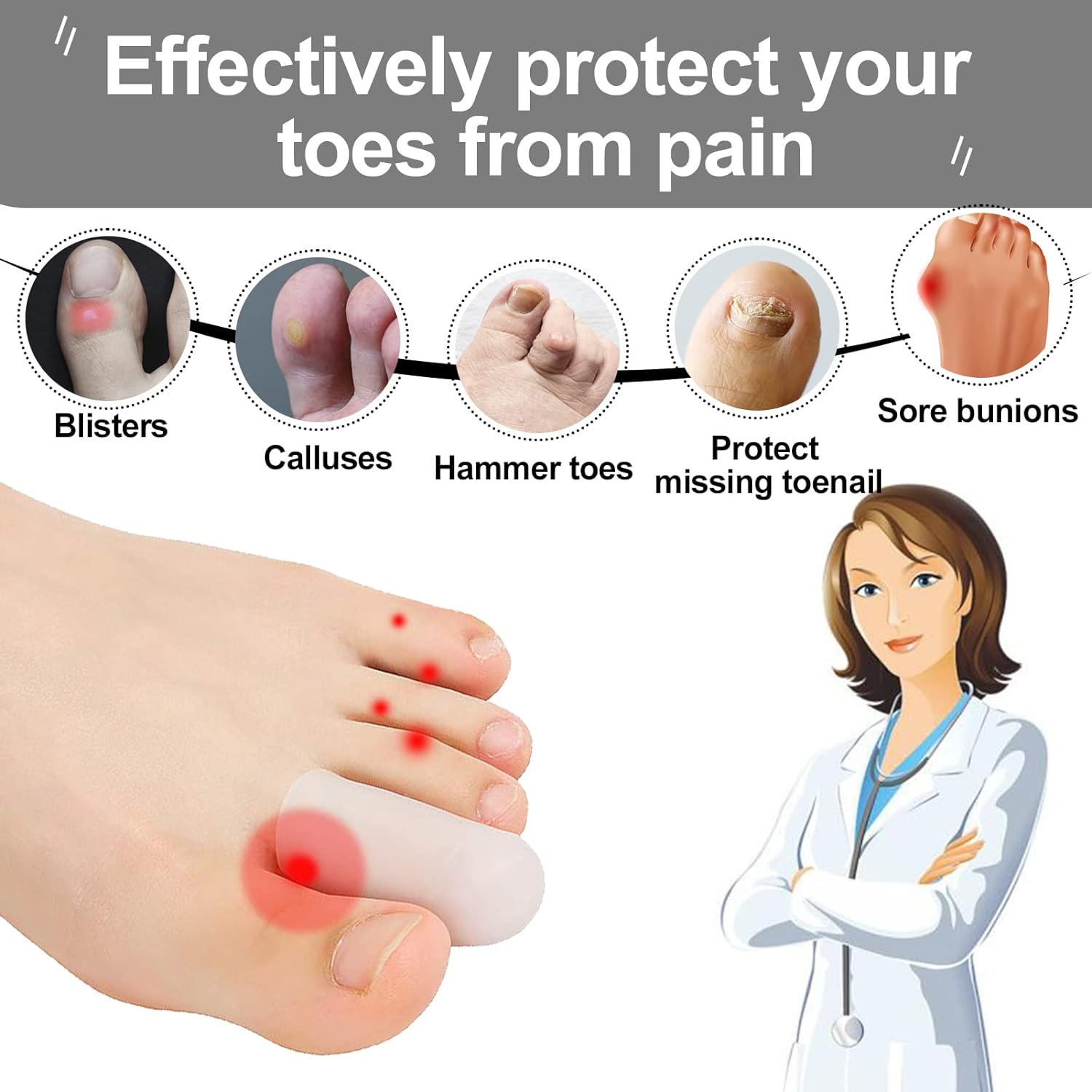 - Silicone gel material: made of soft and durable medical-grade silicone gel material which is non-toxic, odorless and free of latex! Totally environmental-friendly and healthy toe caps!