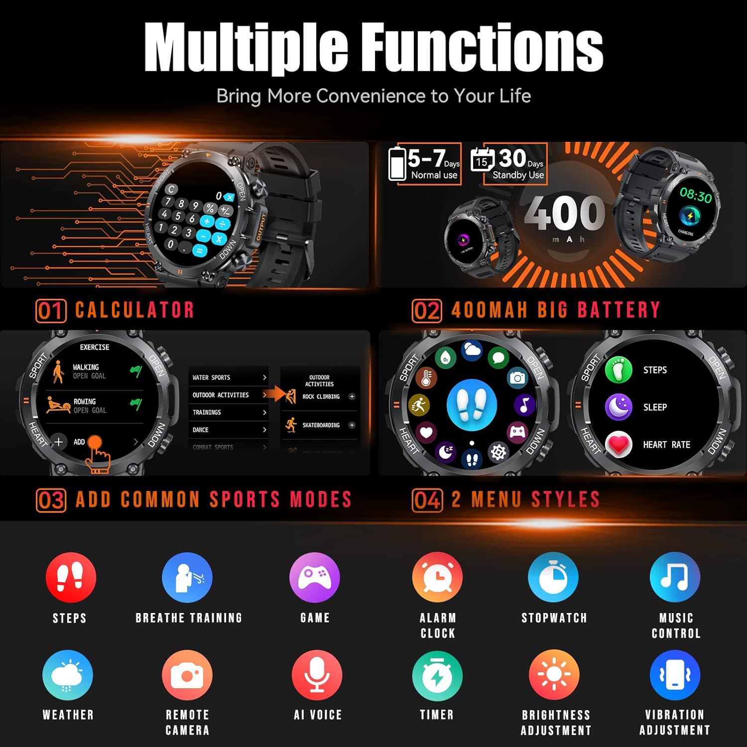 CALCULATOR & MORE PRACTICAL FUNCTIONS - EIGIIS smart watch for men outdoor specially adds a calculator function, you can do calculations on your watch without turning on your phone. Moreover, it has voice assistant, game, menu style, weather, alarm clock, remote camera, sedentary reminder, stopwatch functions. Over 100 dials for choosing, you could download or customize the watch face from DaFit App..