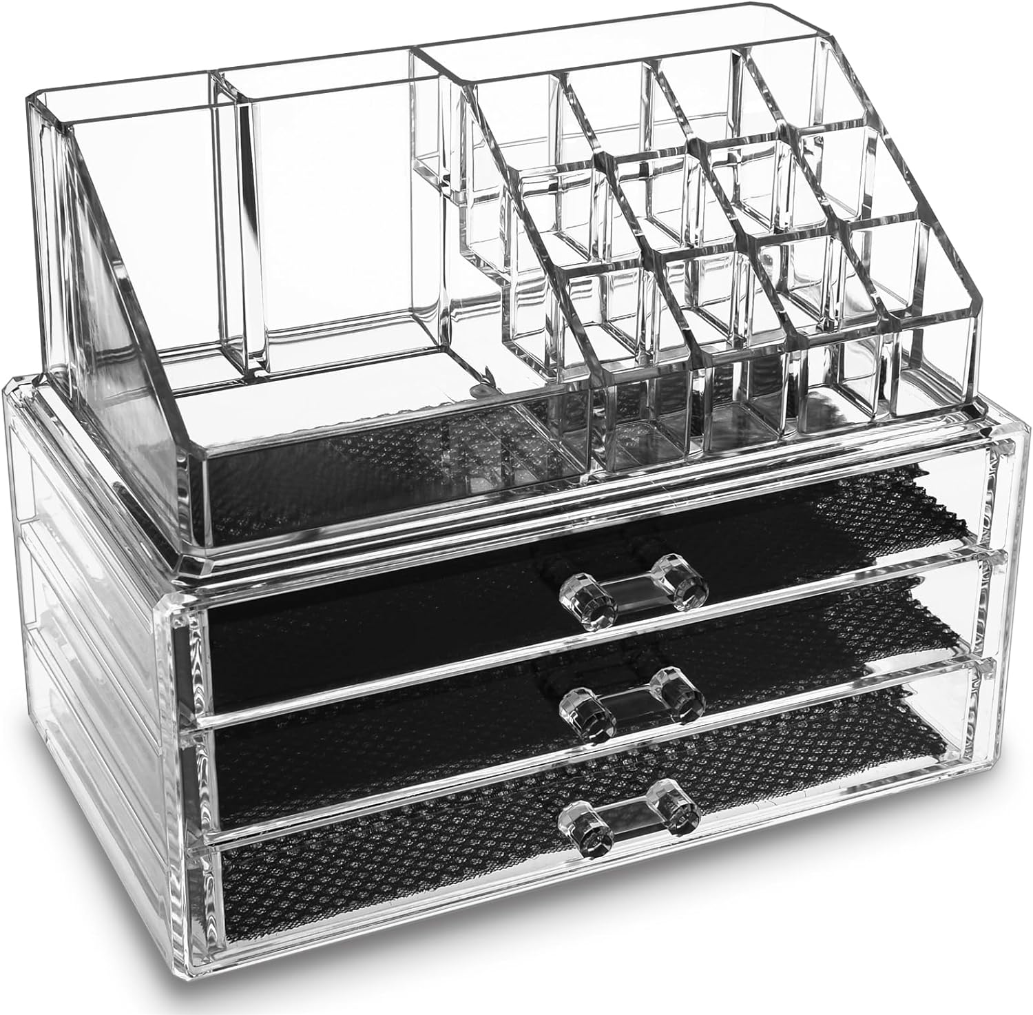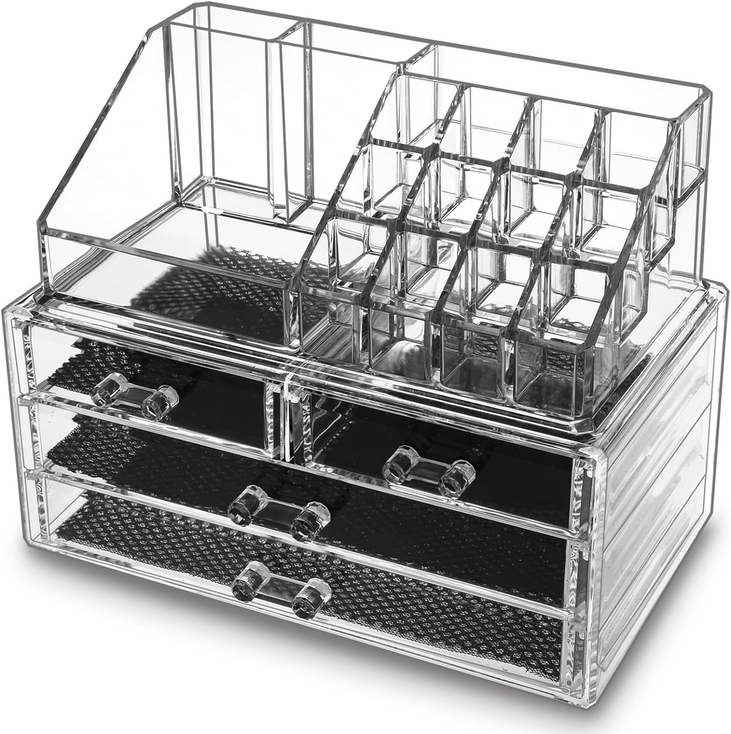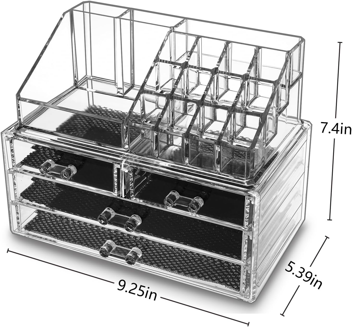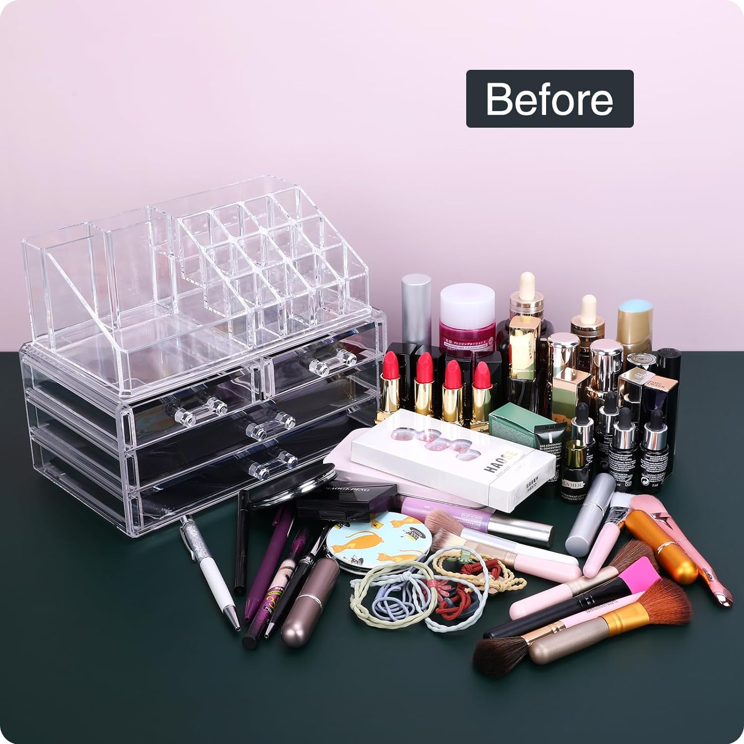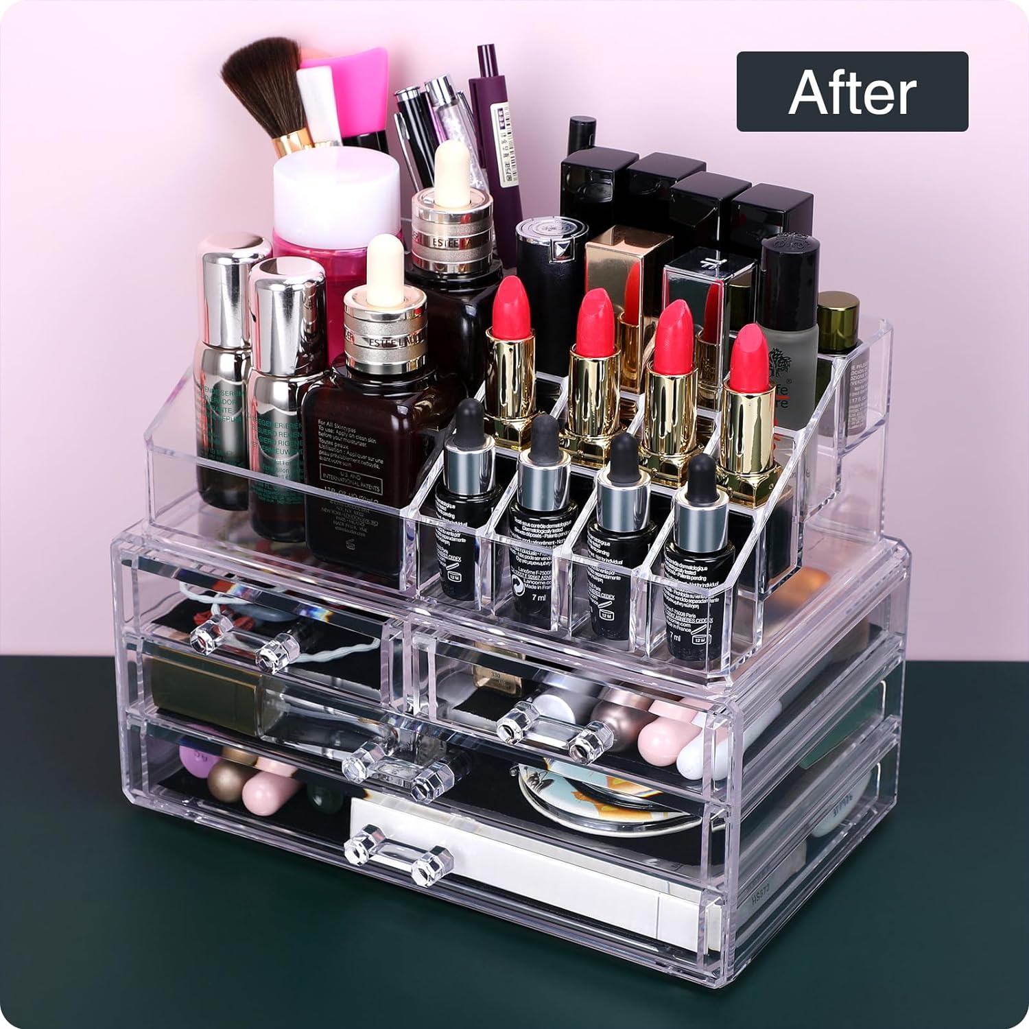 ❤LARGE CAPACITY:This makeup organizer have 2 large drawers and 2 small drawers, with 16 spaces of different sizes on the top, 23.5cm(L)×13.7cm(W)×18.8cm(H) after installation